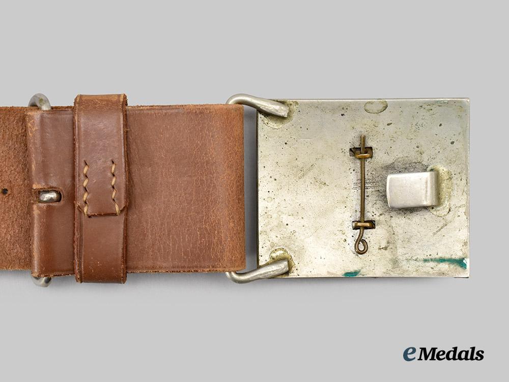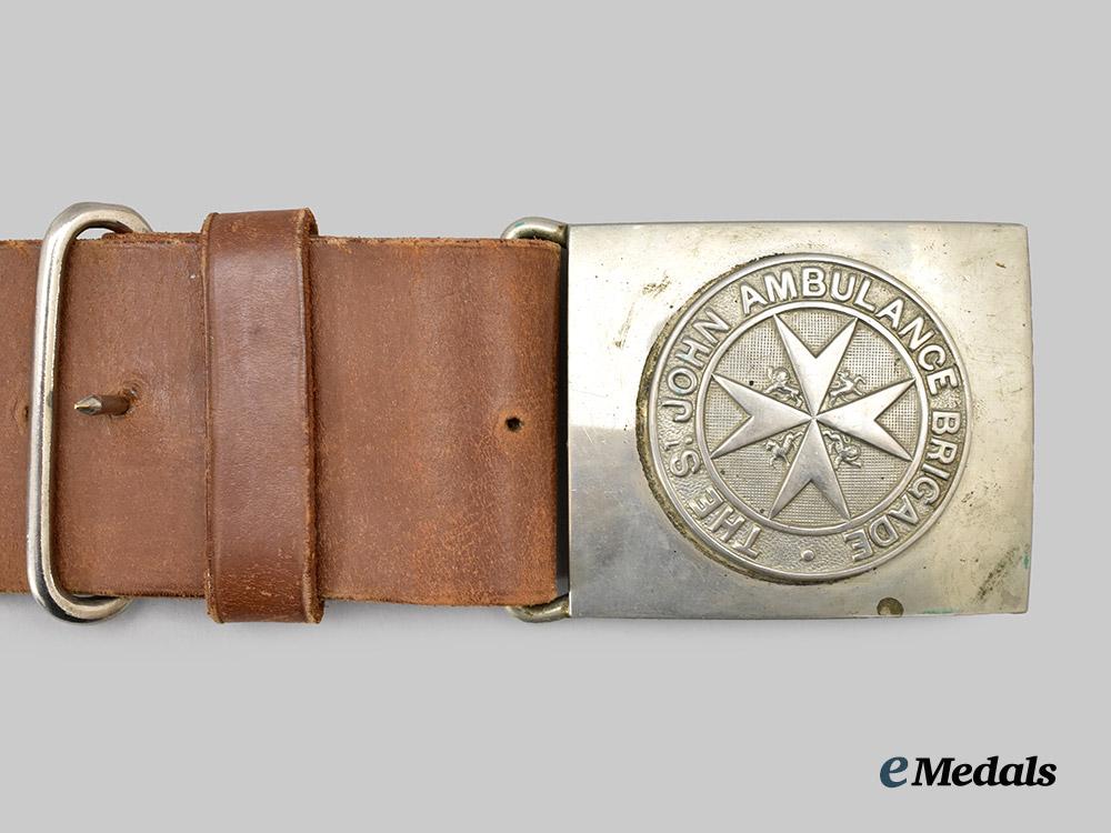 2. A St. John Ambulance Brigade member’s belt and buckle, the former constructed of pressed brown leather, perforated with eyelets and retaining a non-magnetic metal loop, unmarked, measuring 5.5 cm (w) x 110 cm (l), demonstrating minor material fatigue, in near extremely fine condition; the latter constructed of silvered brass, the obverse bearing a raised St. John Ambulance Brigade insignia, the reverse with a clip and original pin fitting through the obverse emblem’s lugs, stamped with a St. John Ambulance registration mark, measuring 8 cm (w) x 6 cm (h), demonstrating minor tarnishing throughout the base metal, in near extremely fine condition.