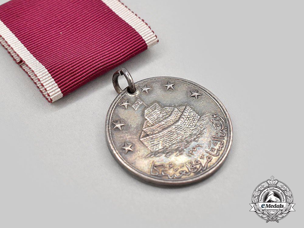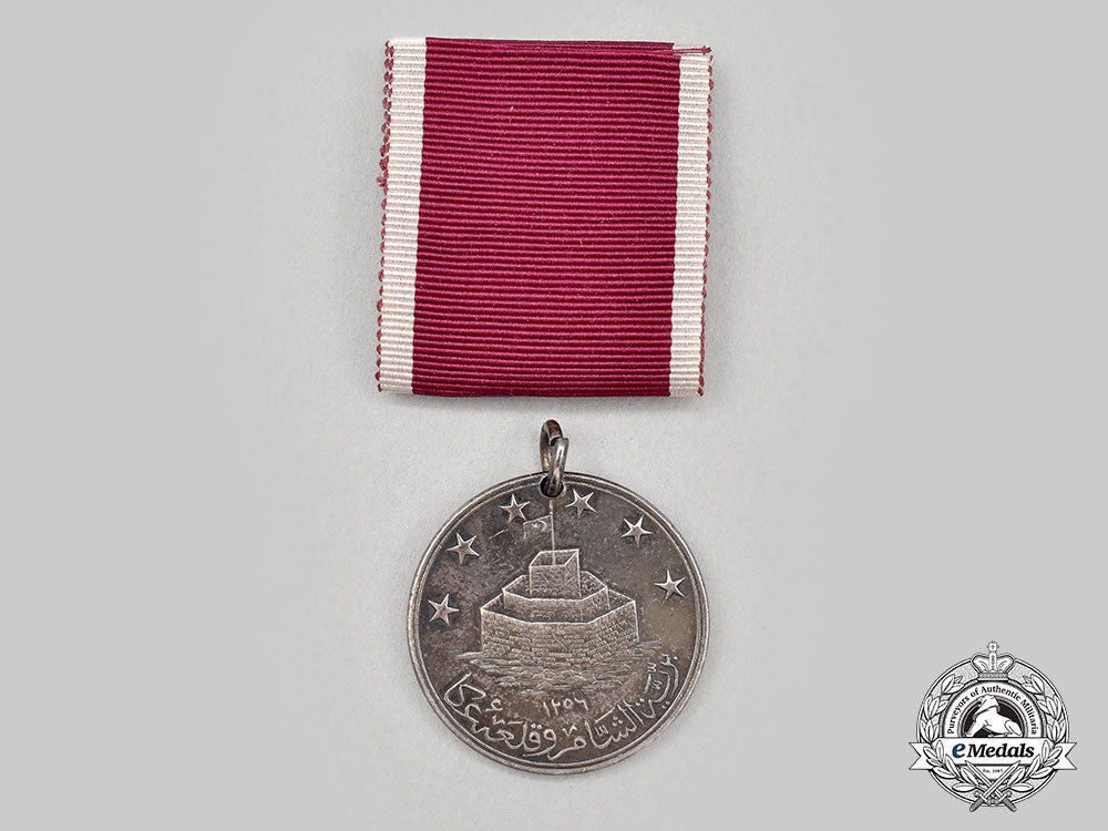 (Akka Madalyasi). Instituted in 1840. In silver, obverse illustrating a fortress flying the Ottoman flag, with six five-pointed stars above, a commemorative inscription along with the Arabic date "1256" according to the Muslim calendar below the fort, reverse illustrating the tughra representing Sultan Abdulmejid (1839-1861) within an open-ended wreath of laurel leaves, measuring 29.7 mm in diameter, ring suspension, dark patina, bruised, edge nicks, accompanied by a replacement ribbon, better than very fine.
