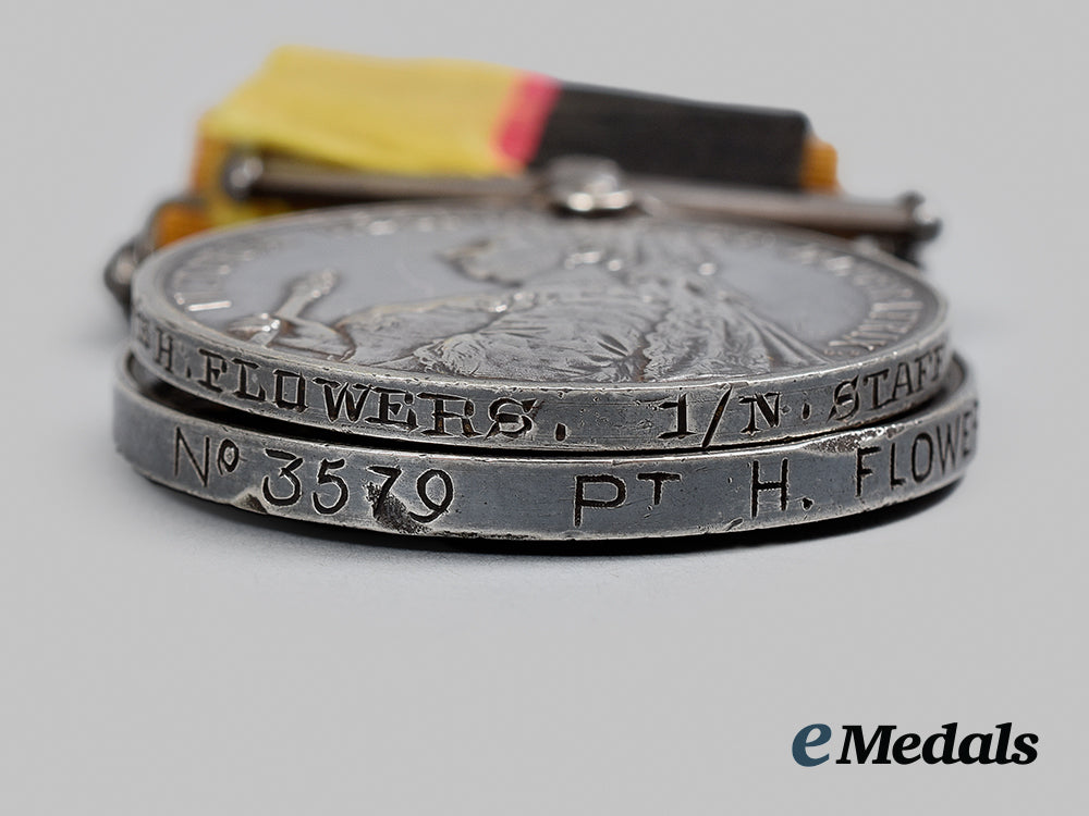 Instituted 1899. In silver, full size, rim engraved 3579. PTE. H. FLOWERS. 1/N. STAFF: R., worn on original ribbon partially severed along suspension bar, small edge knocks, lovely patina, in near extremely fine condition.