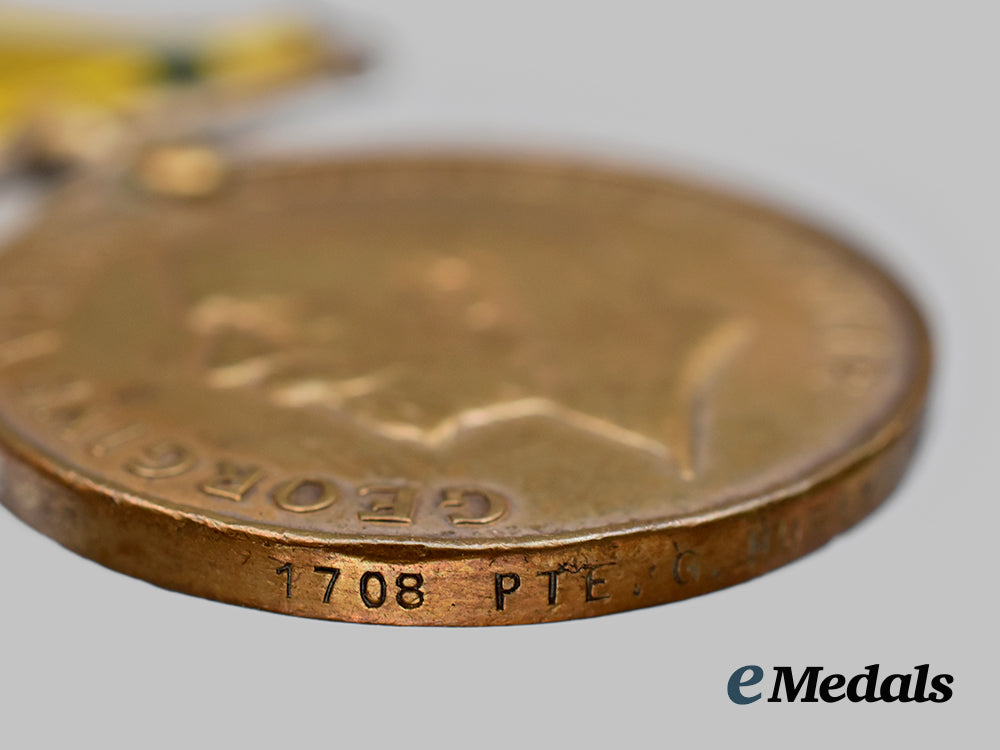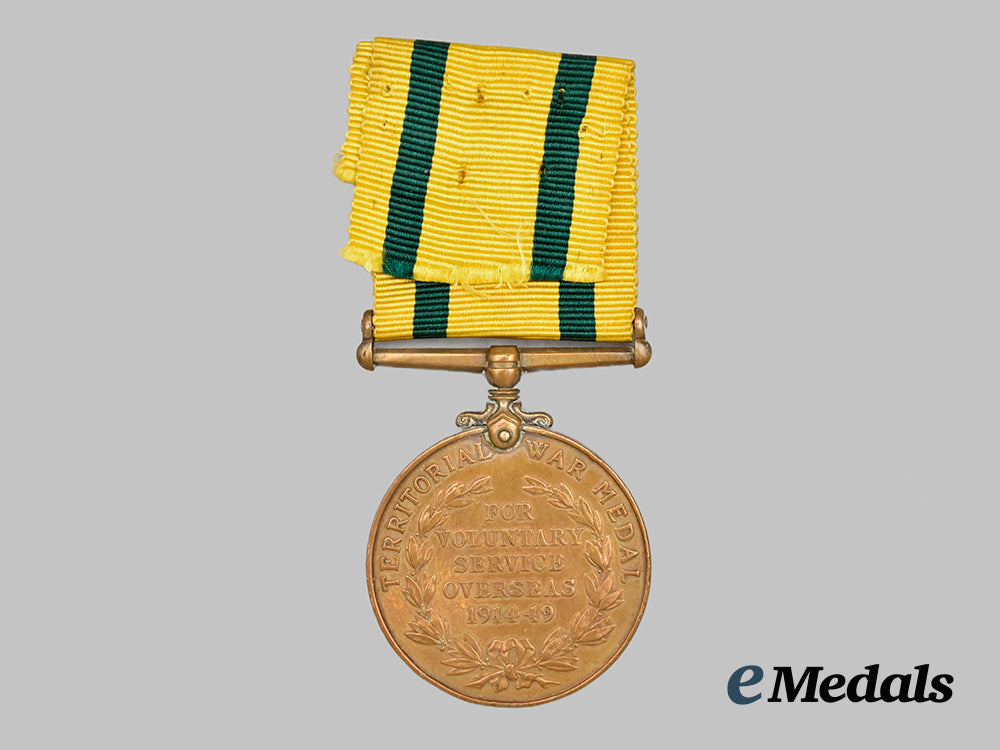 Instituted in 1920. (1708 PTE. G. HURLY. WELSH R.) In bronze, obverse shows King George V facing left surrounded by inscription, reverse shows a wreath with centre inscription 'For Voluntary Service Overseas 1914-19’, and 'TERRITORIAL WAR MEDAL', inclusive of bar suspension 50.4 mm (h) x 36.3 mm (w), extremely fine condition.