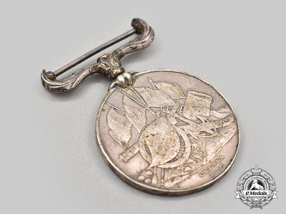 In silver, engraved in running script "Peter Mangan" on the edge, obverse illustrating a cannon, weapons and the four Allied flags, inscribed "CRIMEA" above "1855" at the base, reverse illustrating the tughra representing Sultan Abdulmejid (1839-1861) above the Arabic date "1271" according to the Muslim calendar, within an open-ended wreath of laurel leaves, measuring 36.5 mm (w) x 52 mm (h) inclusive of its ornate suspension, multiple contact marks, without ribbon, near fine.