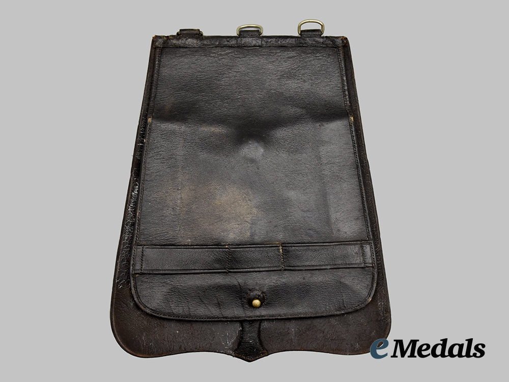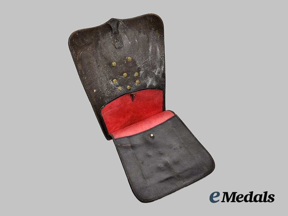 Constructed of leather with a padded, brass front, buttoned pouch, measuring 11.5 inches by 9 inches, worn yet fine.