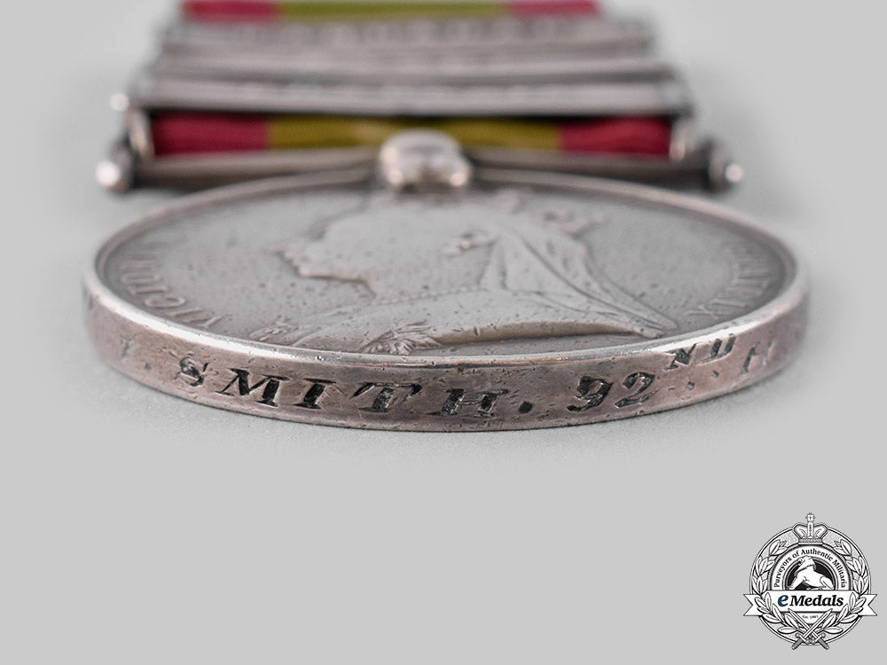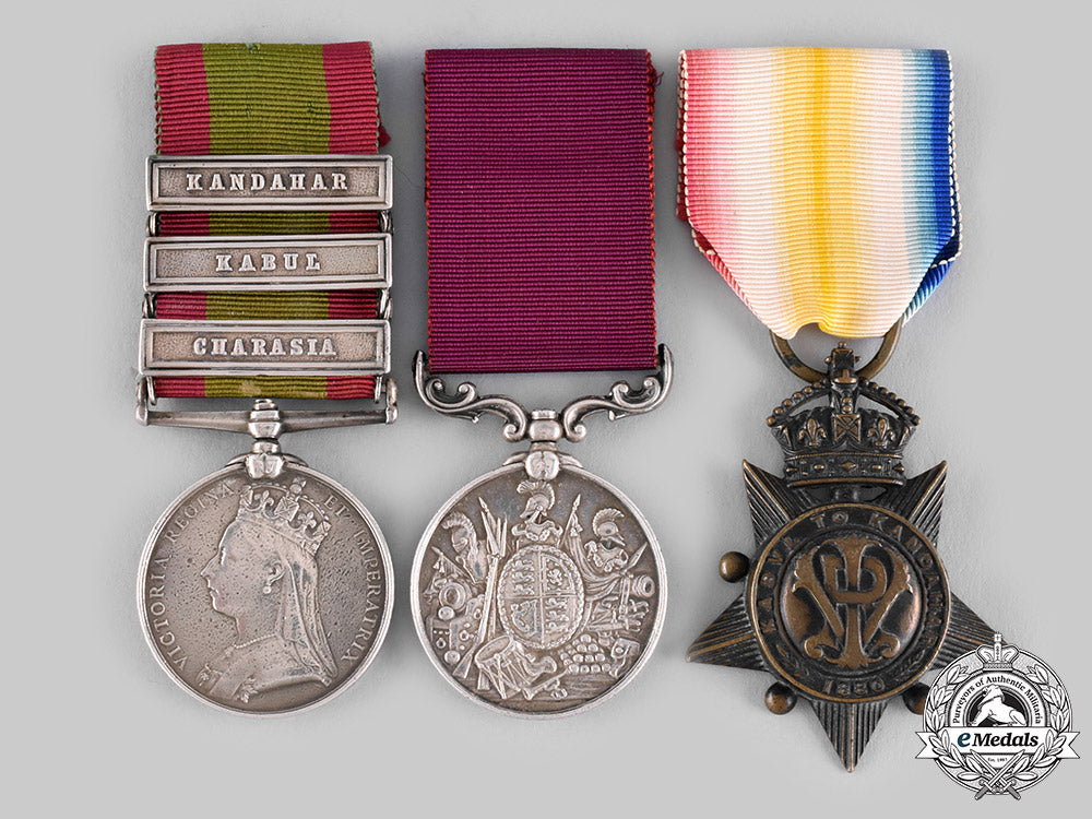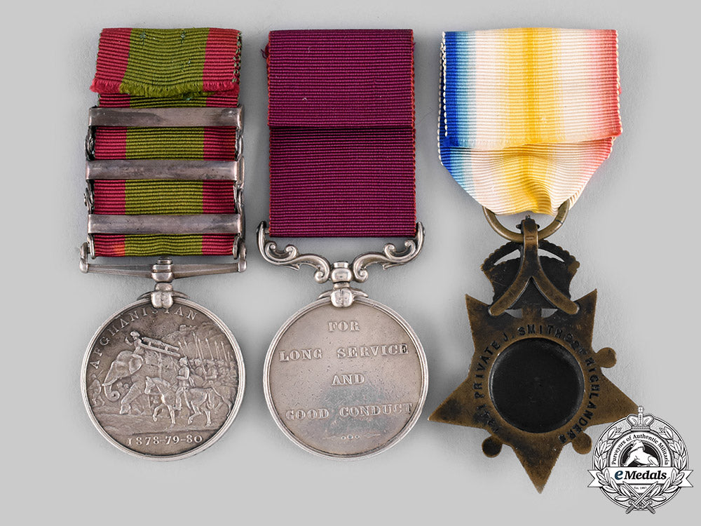 Afghanistan Medal 1878-1880, 3 Clasps - CHARASIA, KABUL, KANDAHAR (1941. Pte J. SMITH. 92nd HIGHrs); Kabul to Kandahar Star 1878-1880 (1941 PRIVATE J. SMITH 92nd HIGHLANDERS); and Army Long Service and Good Conduct Medal (1941 Pte J. SMITH. GORD: HIGHrs). Naming is engraved in italic capitals on the AM and ALSGCM and impressed on the KKS. Edge wear and pitting on the AM and ALSGCM, contact marks on all three, replacement ribbons, near very fine. Accompanied by copies of his Attestation Paper and Service Records