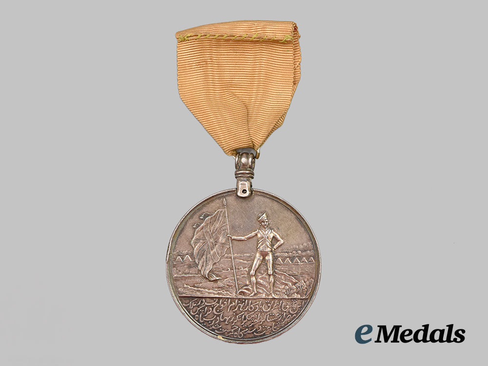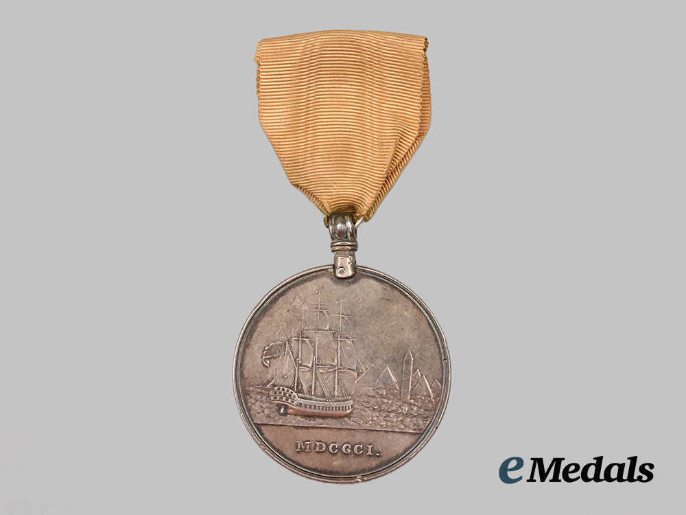 Honourable East India Company's Egypt Medal, 1801 - In silver, obverse illustrating a standing sepoy, holding a large ensign, an attack upon a fortified position in the distance, inscribed below in Persian "This medal has been presented in commemoration of the defeat of the French armies in the Kingdom of Egypt by the great bravery and ability of the victorious army in England", reverse is a starboard quarter view of a full rigged ship under sail approaching land, four pyramids and an obelisk in the distance at the right, Roman numeral dated "MDCCCI" (1801) below, very crisp detail, measuring at mm, light contact, extremely fine.