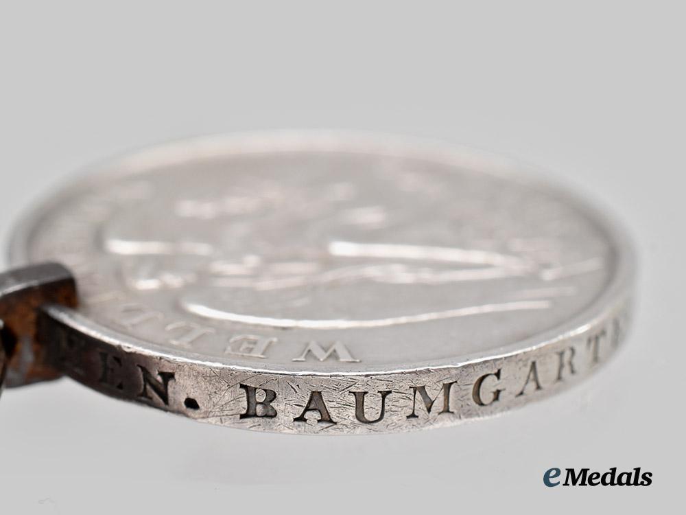 (Hen. Baumgarte - King’s German Legion Artillery). Instituted April 10th, 1816. A circular silver medal, the obverse with a leftward facing bust of George IV and circumscribed by his name and title, the reverse depicting a figure of Victory seated on a plinth with the word “Wellington” above and “Waterloo June 18th, 1815” below, the edge of the medal named “Hen. Baumgarte, Gunner, King’s Germ. Artillery”, on a single-toe and replacement silver keyring-style loop for suspension from its correct modern replacement ribbon, measuring 36.0 mm in diameter, with pitting, light bruising and contact marks, in very fine condition.