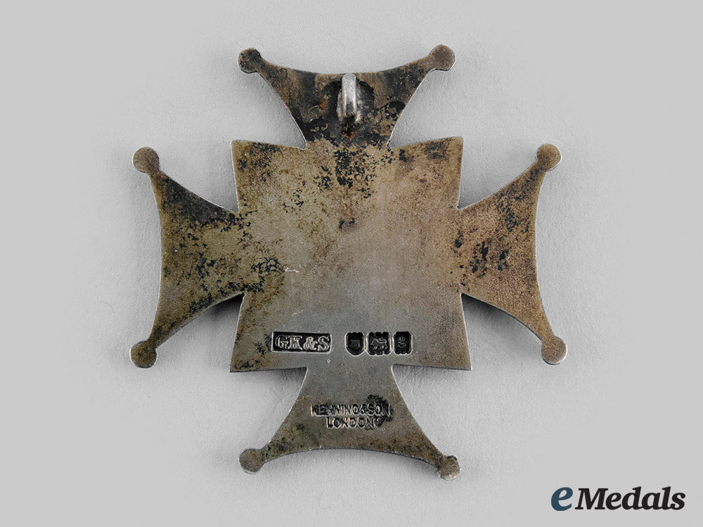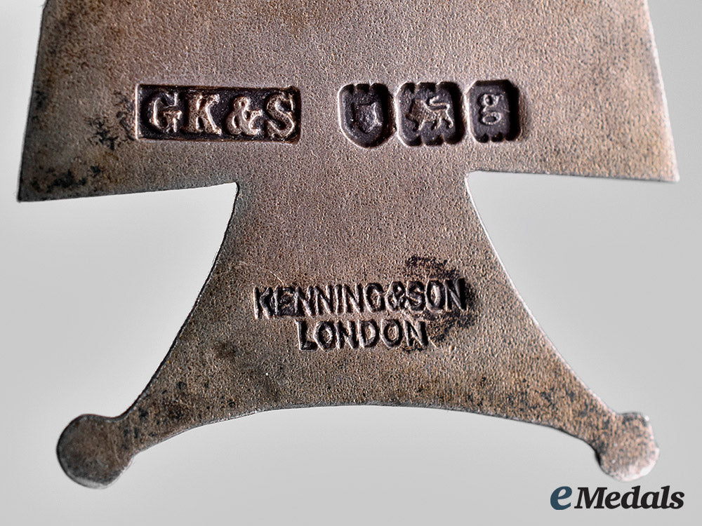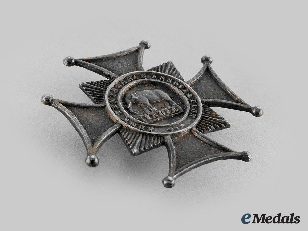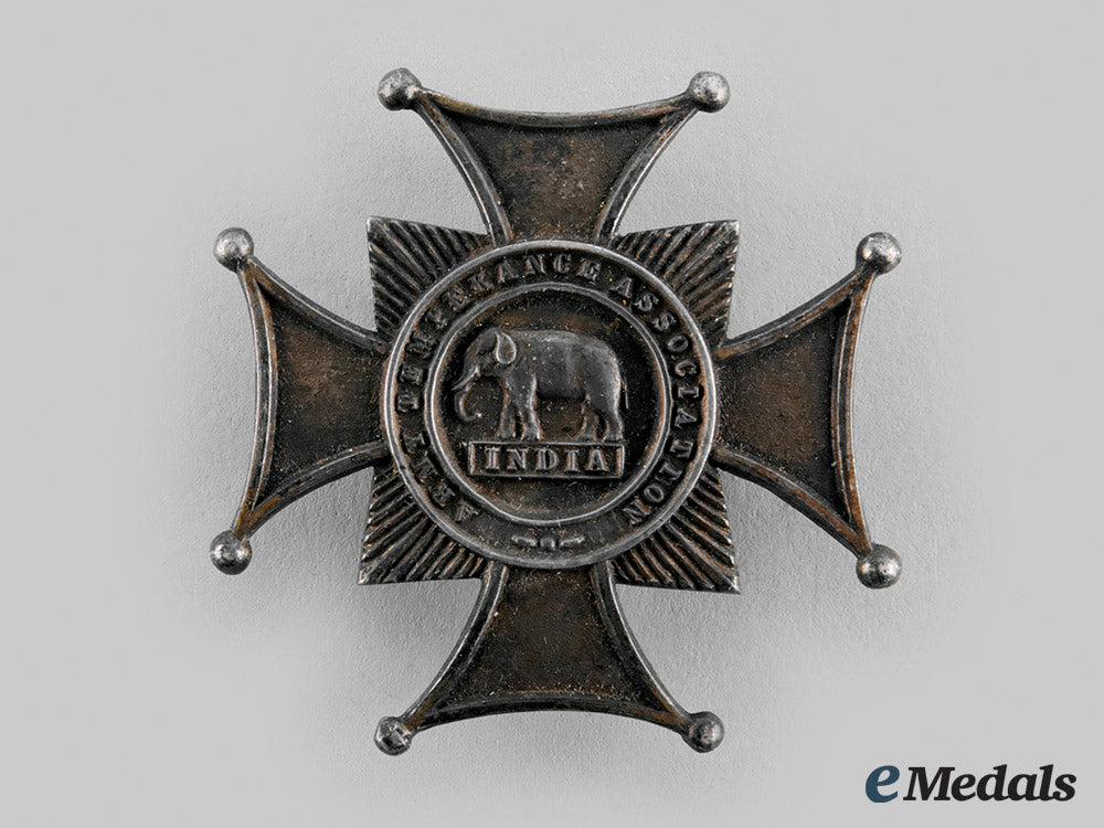 In silver, maker marked "GK&S" (G. Kenning & Son, London), marked with a leopard's head (made in London), the British lion, date marked "g" (1902) and maker marked "KENNING & SON LONDON" on the reverse, illustrating a left-facing elephant standing upon a rectangular block inscribed "INDIA", surrounded by the inscription "ARMY TEMPERANCE ASSOCIATION", backed by a cross with ball finials on the points of the arms, with emanating rays between each arm, measuring 41.5 mm (w) x 42 mm (h), loop affixed to the reverse but missing its ring, very light contact and tarnishing, better than very fine.