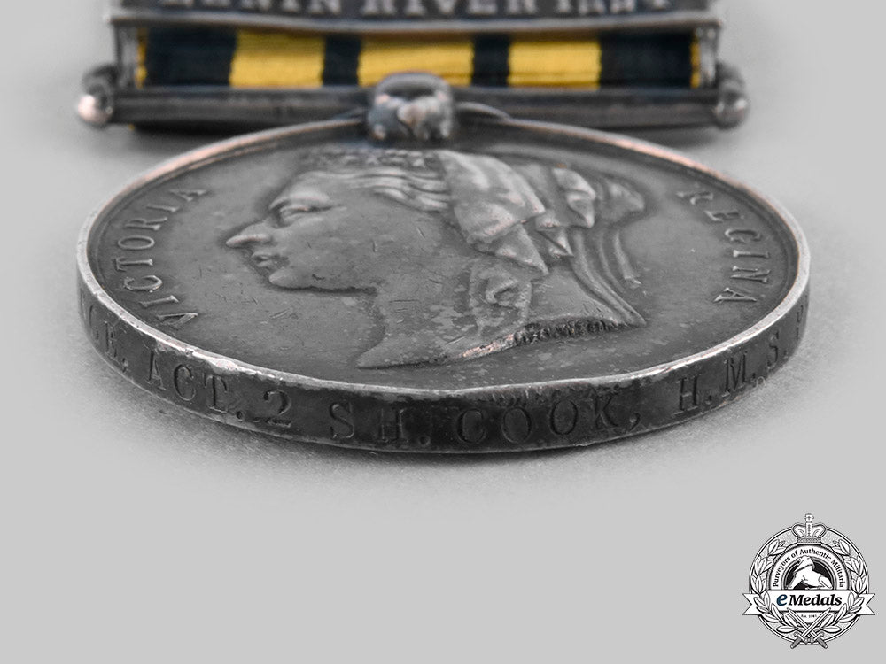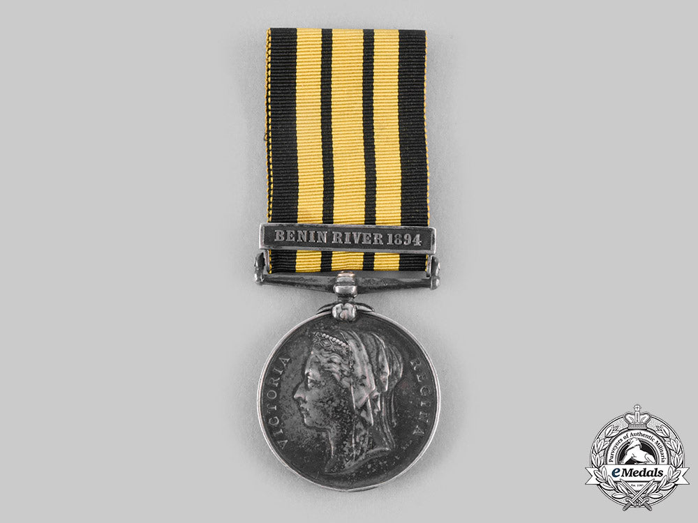 BENIN RIVER 1894 (T.G. STRANGE, ACT. 2 SH. COOK, H.M.S. PHOEBE.). Naming is officially impressed in large capitals. Very dark patina, bruised, edge nicks, contact marks, original ribbon, near very fine.