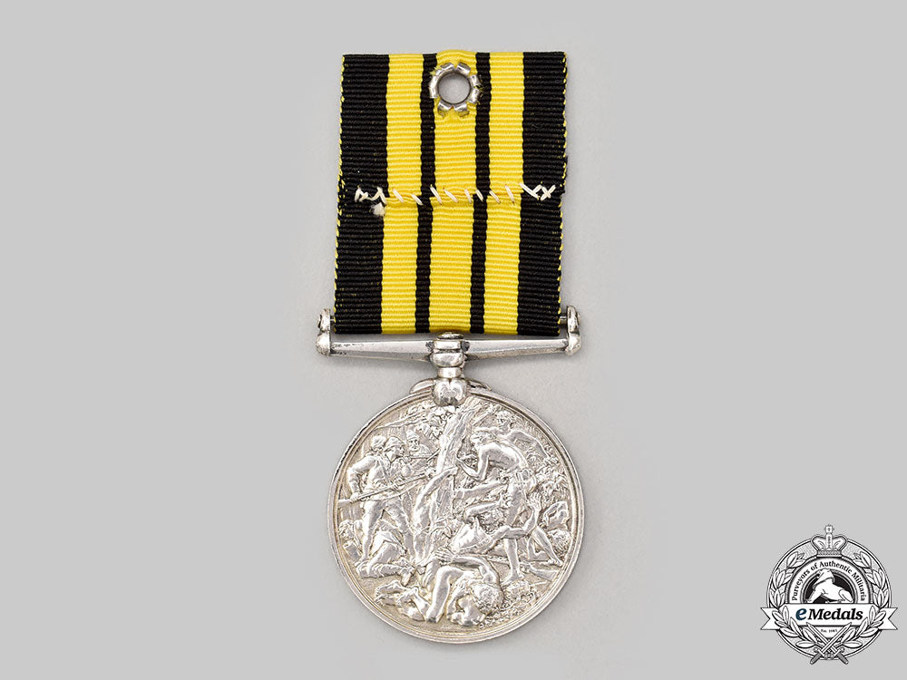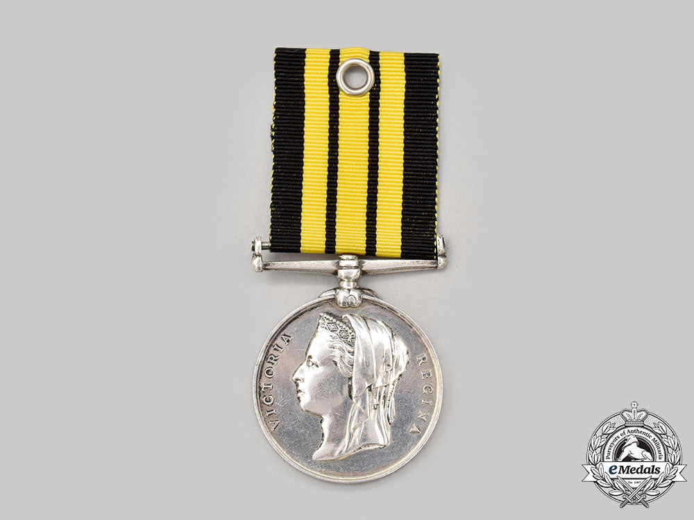 Footnote: The East and West Africa Medal was established on November 1, 1892. It was awarded to Officers, Non-Commissioned Officers, and enlisted men of the British Army, as well as Officers and enlisted men of the Royal Navy and Royal Marines in recognition of service in military campaigns in Africa from 1895-1896. The Medal was awarded to Officers and enlisted men of the British Army, the Royal Navy, the Royal Marines, and the Indian Army in recognition of service in the Third Anglo-Ashanti War (1873-1874). Those who served in the Mwele Campaign of 1895-96 on the Kenyan coast did not qualify for a clasp but received the medal with the inscription “MWELE” and the date on the rim, next to the claw.