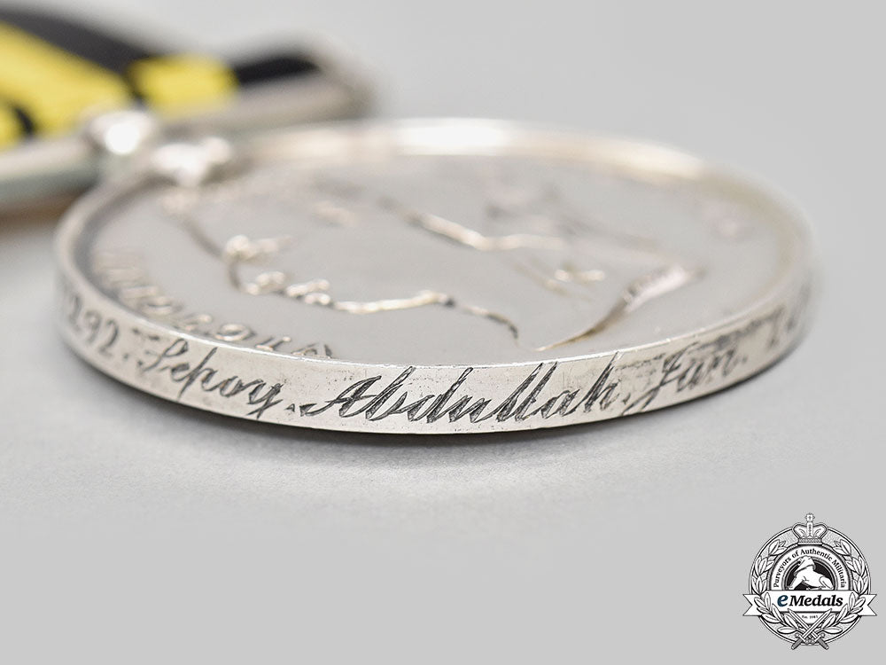 Instituted 1892. A silver medal, 36mm, the obverse presenting a left facing portrait of Queen Victoria, the reverse featuring a scene of bush fighting around a tree, the rim impressed “MWELE 1895-6” on either side of the claw, and engraved “1292 Sepoy Abdullah Jan. 24th Bo Infy”, worn on a straight swivel bar suspension attached to a replacement ribbon with central grommet, lovely patina, minor wear, in extremely fine condition.