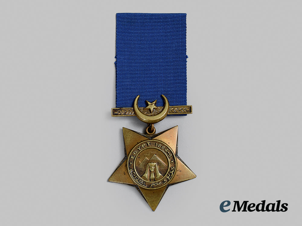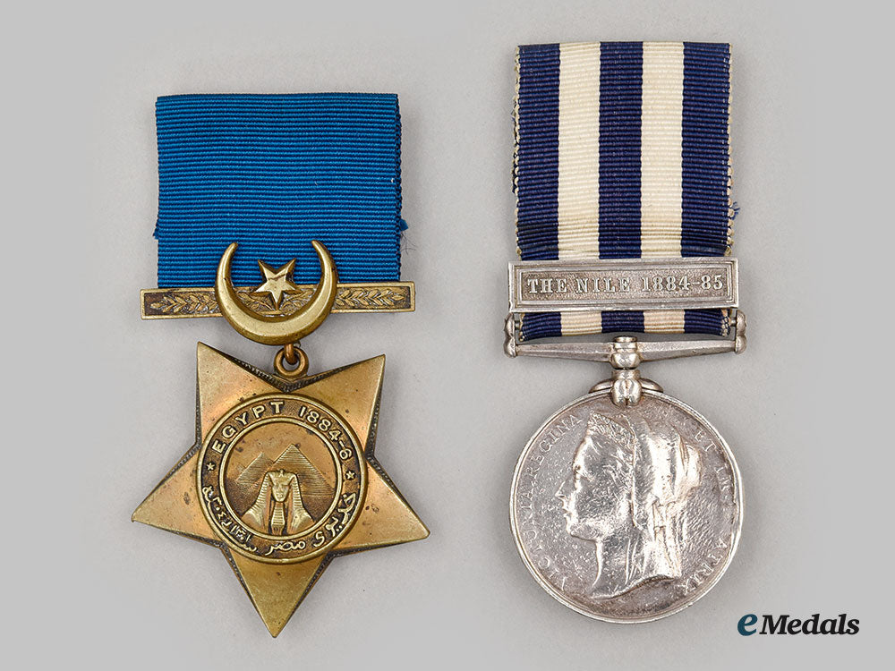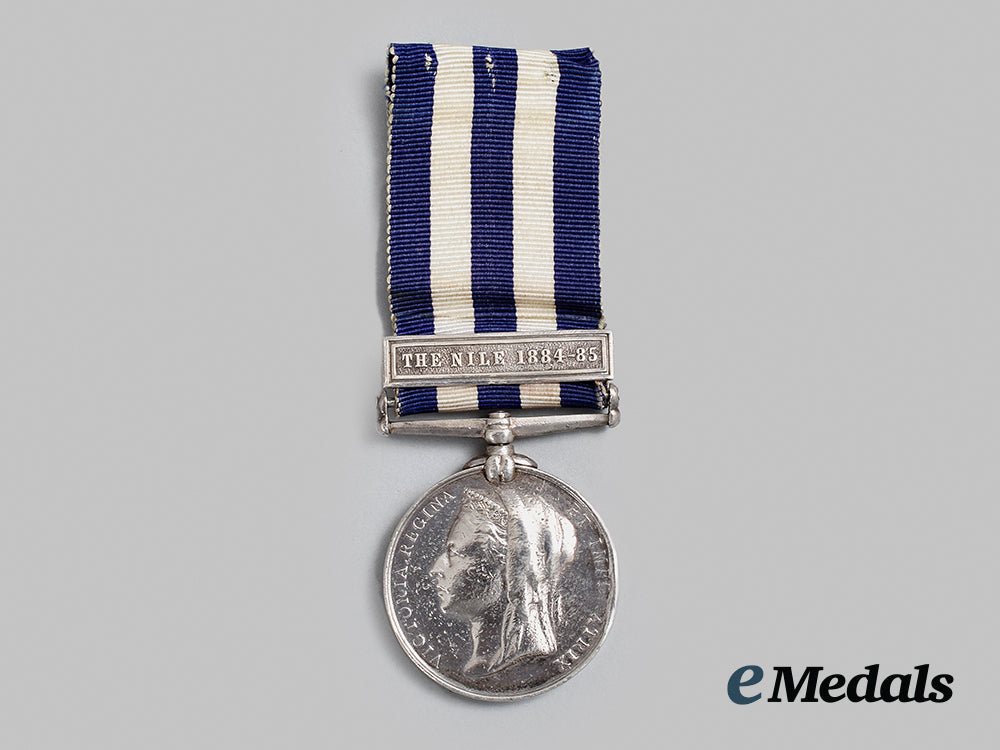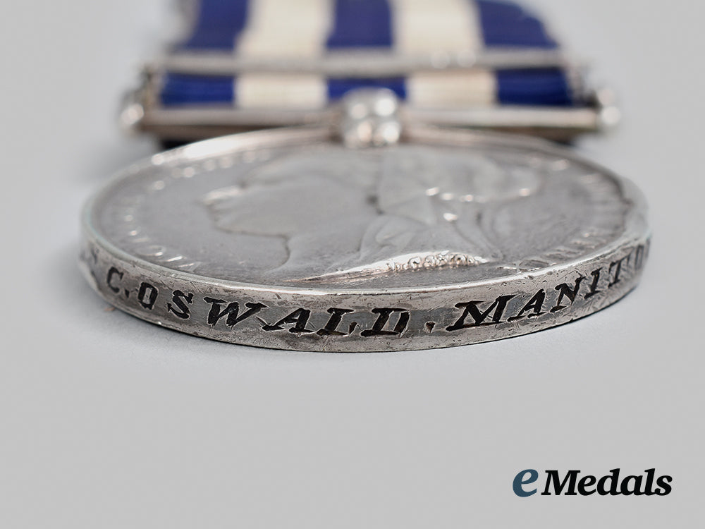 Instituted October 1882. In silver, full size, rim engraved 115. BOATN. C. OSWALD. MANITOBA CONTGT., worn on ribbon with THE NILE 1884-85 clasp, wear near the 3 o’clock edge, notable edge knocks, wear on both sides, remains in very fine condition.