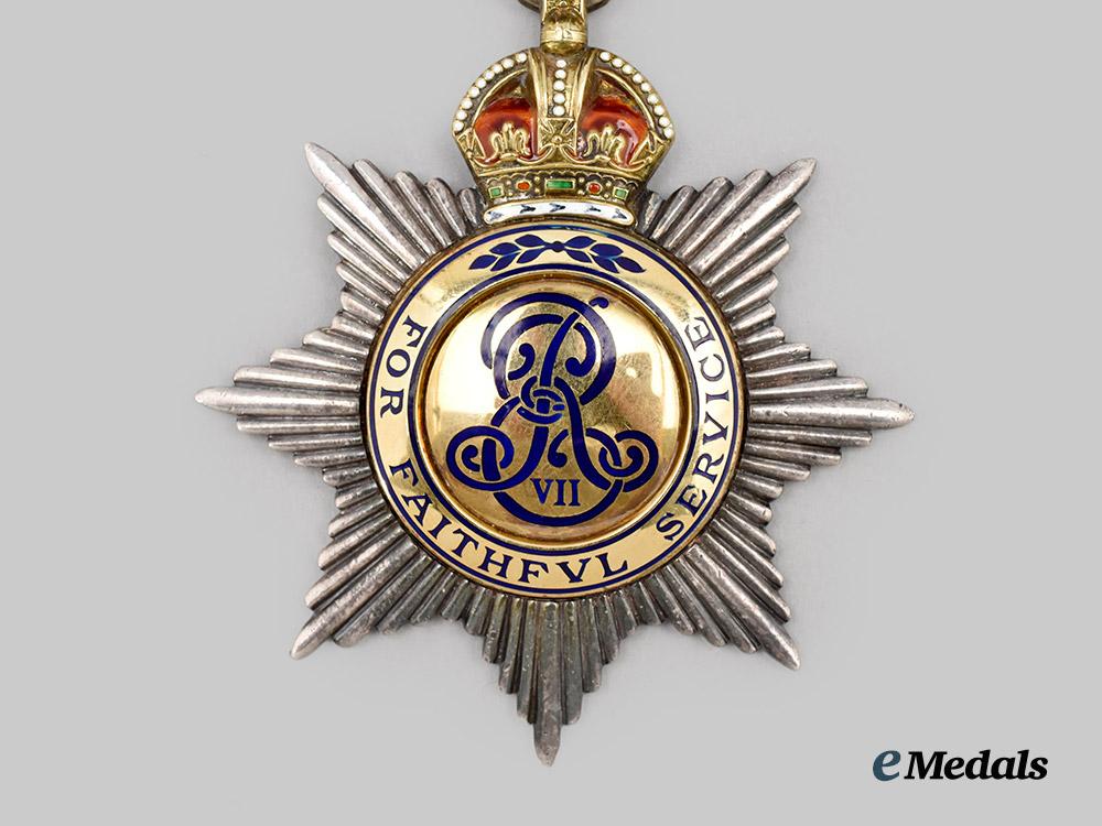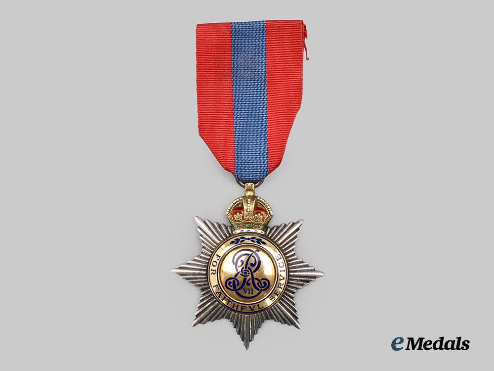 Instituted August 8, 1902. Edward VII. In silver and silver gilt, an eight point star with cluster of smooth rays, the obverse medallion featuring the cypher of Edward VII encircled by the inscription FOR FAITHFVL SERVICE, with a surmounting enamelled crown, reverse plain, measures 56mm (w) x 61 mm (h), weighs 37.72 grams including ribbon, worn on original blue and red ribbon, small areas of adhesive residue on reverse, in extremely fine condition.