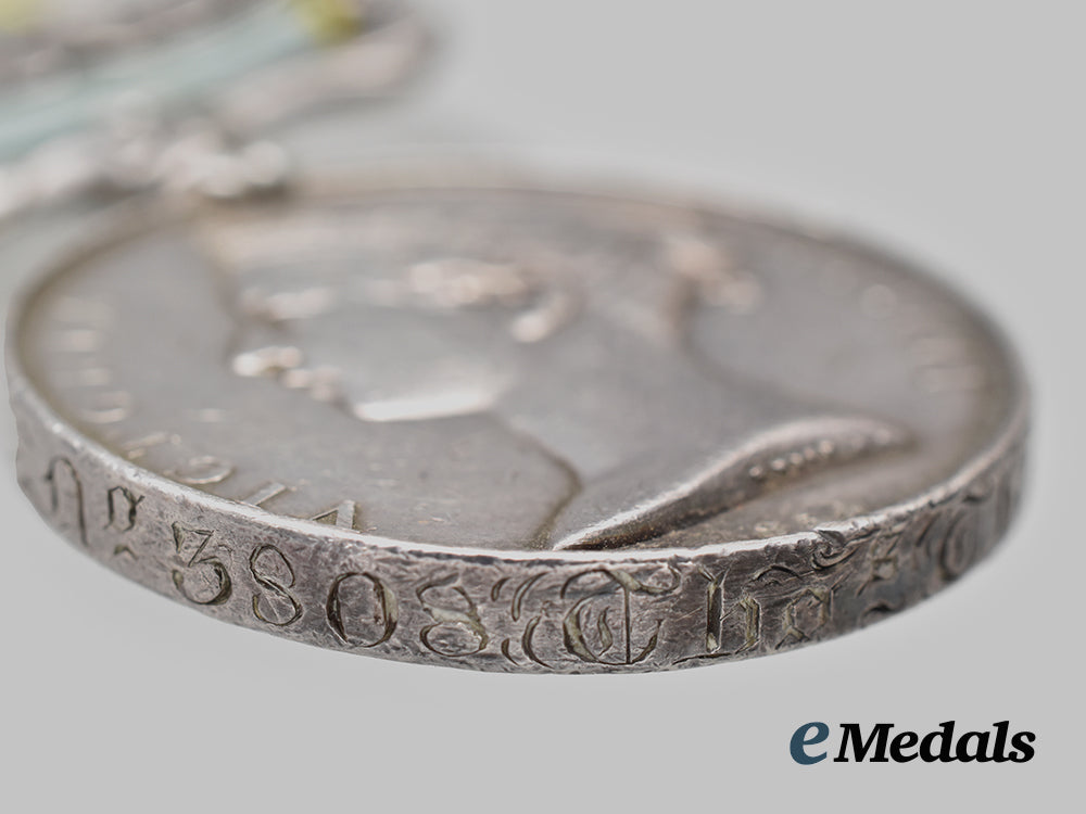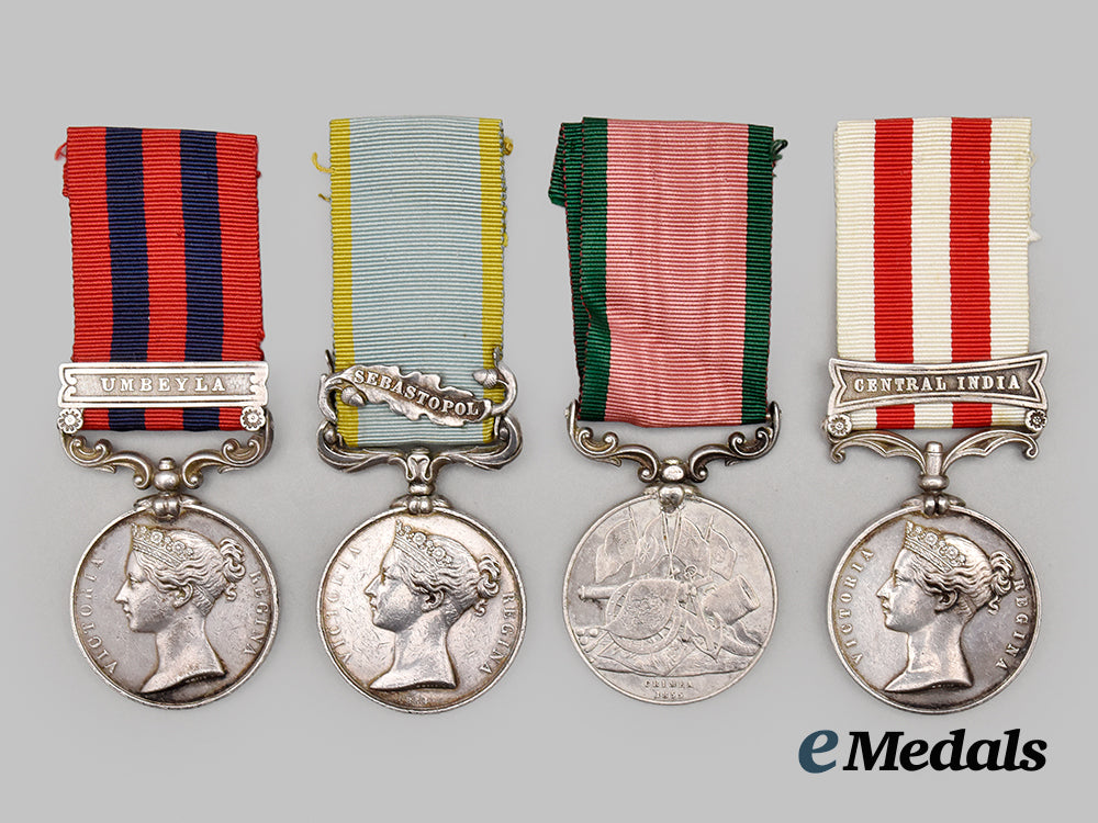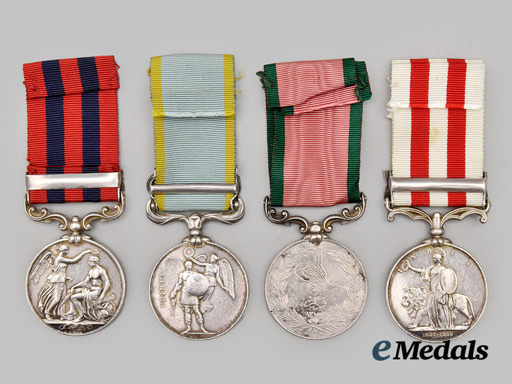 India General Service Medal 1854-1895, 1 Clasp - UMBEYLA (3802. T. THOMPSON. H.Ms. 71st REGt); Crimea Medal 1854-1856, 1 Clasp - SEBASTOPOL (No. 3802 THOs THOMPSON, 71 H.L.I.); Turkish Crimea Medal 1855-1856; and Indian Mutiny Medal 1857-1858, 1 Clasp - CENTRAL INDIA (THOs THOMPSON, 71st HIGHd L.I.). Naming is officially impressed in large capitals on the India General Service Medal and the Indian Mutiny Medal, the Crimea Medal engraved in Gothic script, the Turkish Crimea Medal is un-named as issued. Un-mounted, contact marks, edge nicks, replacement ribbons, better than very fine.