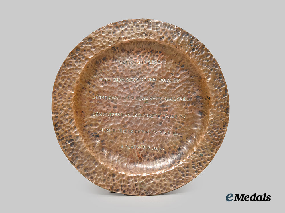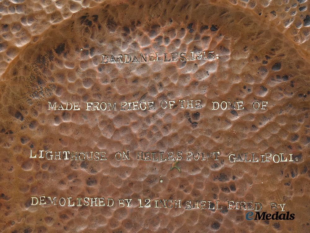 In copper, measuring 23 cm in diameter, impressed DARDANELLES.1915. MADE FROM PIECE OF THE DOME OF LIGHTHOUSE ON HELLES POINT, GALLIPOLI. DEMOLISHED BY 12 INCH SHELL FIRED BY H.M.S. PRINCE OF WALES. 25.4.15. H.W. ADAMS. R.G.A., extremely fine condition.