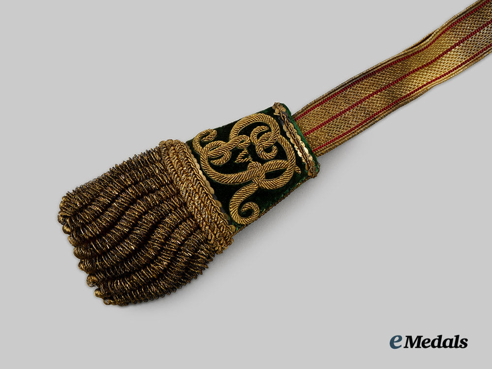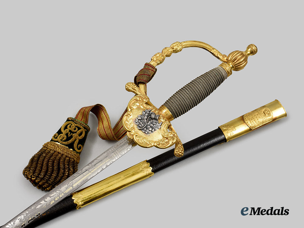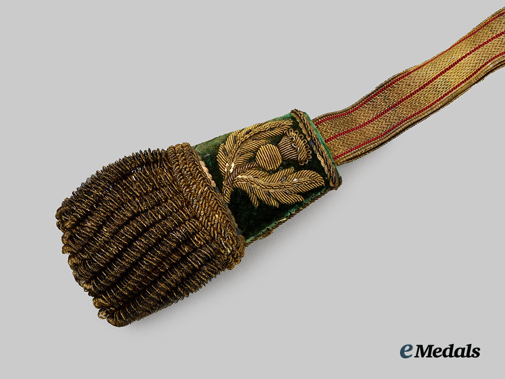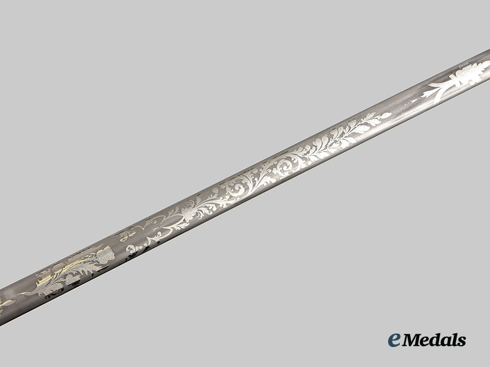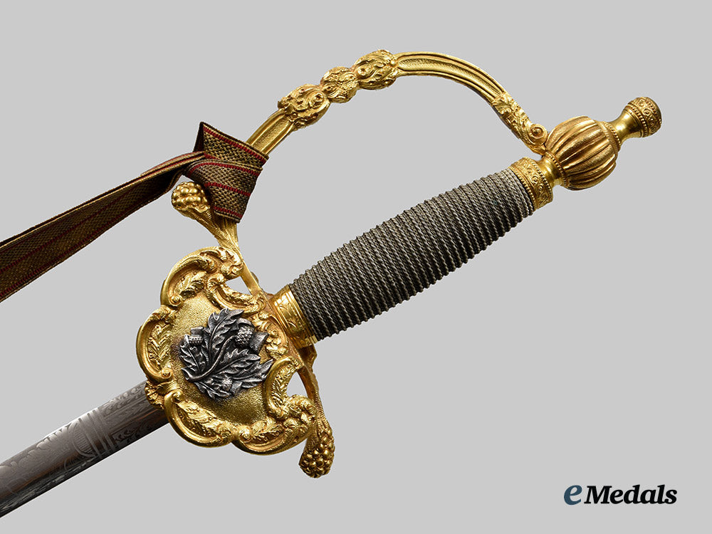 This sword features a polished nickel-plated steel blade, magnetic, with an extremely sharp tip. Both sides of the blade are etched with an ornate floral pattern, which flanks a large thistle appearing in the centre. The obverse ricasso bears an icon with three columns of leafing surmounted by a semi-circular arch housing a series of vertical rules, the arch with a spike-like item protruding from it, while the reverse ricasso is maker marked "P. & S. FIRMIN Sword Cutlers & C. TO THE Royal Family 153 Strand & 13 Conduit St. LONDON". It exhibits surface wear near the tip, with some contact marks evident on the remainder of the blade, along with surface rust on the reverse where it butts the grip, measuring 780 mm in length. The blade is embedded into the hilt and is firm to it, with a thin oval gray leather washer surrounding the blade and resting upon the guard. The guard is in brass, the obverse designed with ornate swirls and leafing, its front bearing a silver cluster of oak leaves and thistles, the reverse designed with fourteen large emanating rays, with five smaller thin emanating rays appearing in between each of the large rays. Both protruding quillons are designed with a cluster of berries, the ferrule engraved in a series of repeating chevrons, the handle with three floral motifs at the midpoint. The grip is wrapped in thirty-two rows of silvered bullion wire, each row consisting a large row of rolled wire flanked by two rows of twisted wire, the pommel designed with vertical ribbing and finished with an ornately designed button, the entire sword inclusive of its blade and handle measuring 920 mm in length. Wrapped around the handle is a very large knot, its wide cord tied in the appropriate fashion to the handle, the cord in gold-coloured fine bullion wire interlaced with maroon threading, the knot itself formed by twenty vertical coils in rolled gold-coloured bullion wire, encompassing ten maroon coils in the centre, with three horizontal rows in fine gold-coloured wire at the base of the vertical coils. The top of the knot is covered in forest green felt, the obverse bearing the GRV (George V) monogram in gold-coloured rolled and beaded wire, the reverse illustrating a thistle in gold-coloured rolled bullion wire interlaced with sequins, the edge on both sides that butts the cord trimmed in sequins. The sword is housed in its original scabbard, the stiff-framed body wrapped in smooth black-finished leather, the three ornate floral designed fittings in brass that includes the locket, the mid-piece and the chape, the locket with an ornate raised post on the obverse, with a brass plate affixed to the reverse of the locket illustrating the Victorian crown above the inscription "P. & S. FIRMIN SWORD CUTLERS & C. TO THE ROYAL FAMILY 152 STRAND & 13 CONDUIT St. LONDON". It exhibits crazing and wear spots in the leather wrapped body, with light contact marks on the brass fittings, the scabbard measuring 810 in length. Better than very fine.