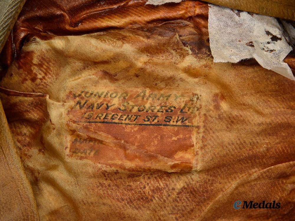 A well-preserved wartime example of a British issue Army Officer’s peaked “crusher” cap, constructed entirely of olive-drab woven cotton in the traditional design with a raised peak. The cap consists of a smooth integrated cap band with a crusher-style crown of the same type and colour material. It is missing its insignia that was previously mounted to the front, but includes a chocolate-brown adjustable leatherette chin strap that is held in place on either side of the cap with a matching brown leatherette “knotted” button. The chin strap rests upon a visor with a stiff core, not depicting creasing of any kind, that is equally lined with matching olive-drab woven cotton. Both sides of the cap are ordained with two bronze horizontally mounted side-by-side rivet breather-holes. The interior of the cap is lined entirely a brown oil cloth overtop a rayon-cotton blended fabric with a light brown leather sweatband that has changed colour to dark brown from age and wear. The cap is maker marked “Junior Army & Navy Stores LTD, 15 Regent St. S.W”. It measures approximately 24 cm (w) x 275 mm (l), with soiling from age and wear on the interior of the cap, but otherwise well preserved, in better than very fine condition.