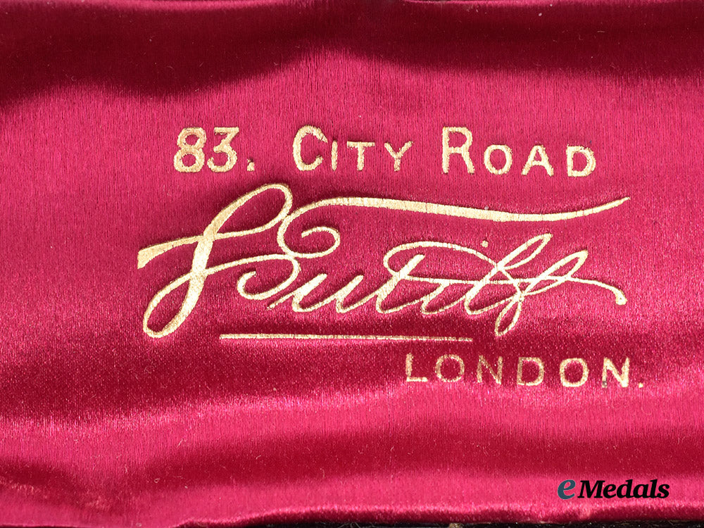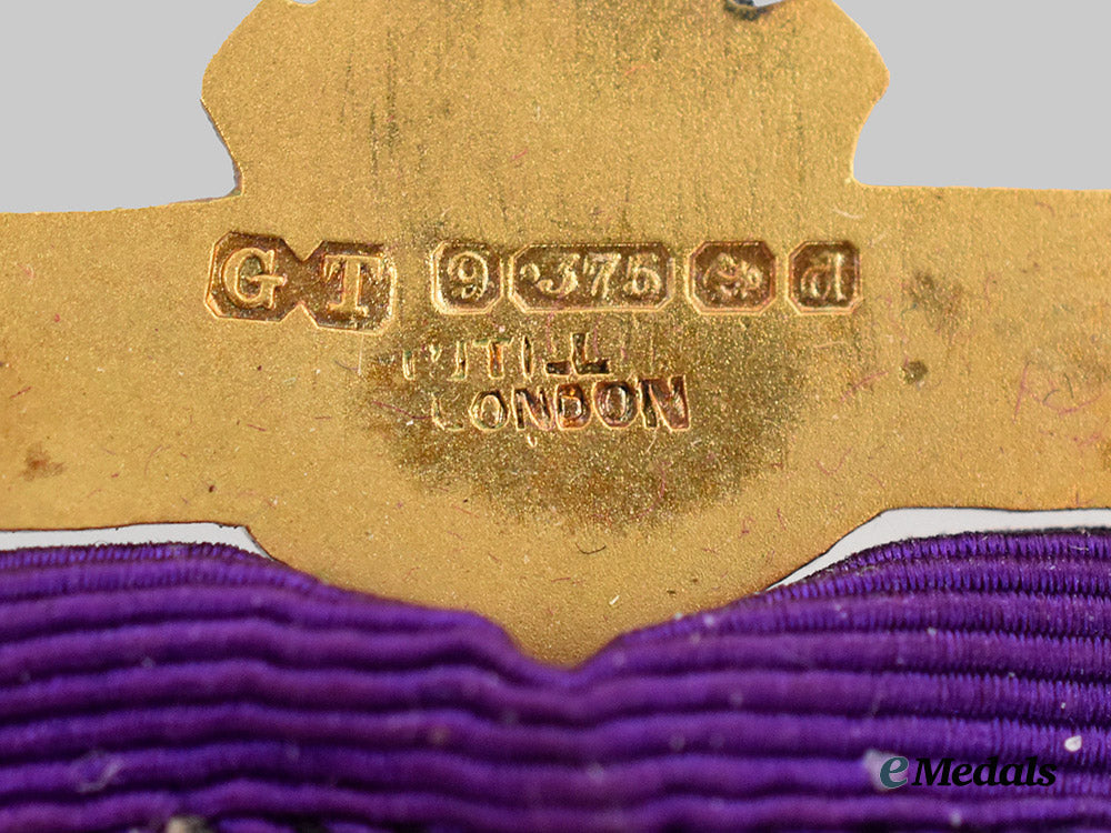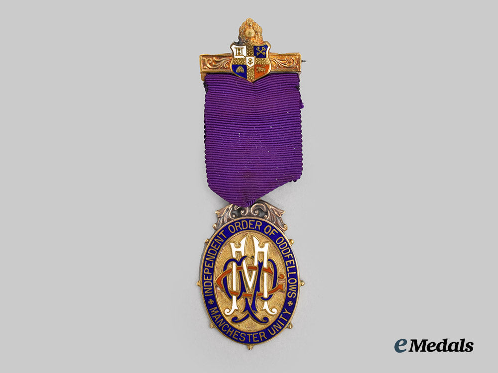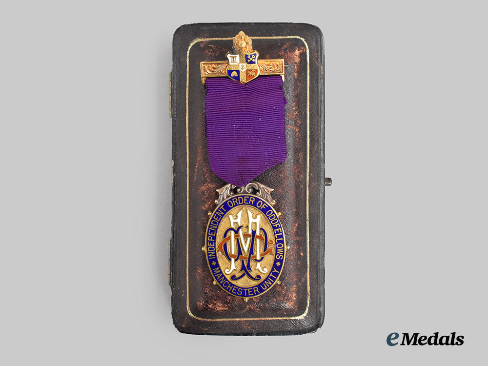 Instituted in 1819. In Gold and white, blue, and orange enamel, oval medallion with seven points along the edge, the obverse bearing the Order’s monogram, surrounded by the words INDEPENDENT ORDER OF ODDFELLOWS MANCHESTER UNITY, the reverse inscribed BRO. W. J. GOTHARD P.P.G.M FOR VALUABLE SERVICES RENDERED MAY 2ND 1904, marked GT (George Turner), unidentifiable makers marks, on original ribbon, 46.4 mm (h) x 28.8 mm (w), 14.5 grams, extremely fine. In a hard-shelled case, purple satin lined on the inside lid, purple velvet medal bed, very fine condition.