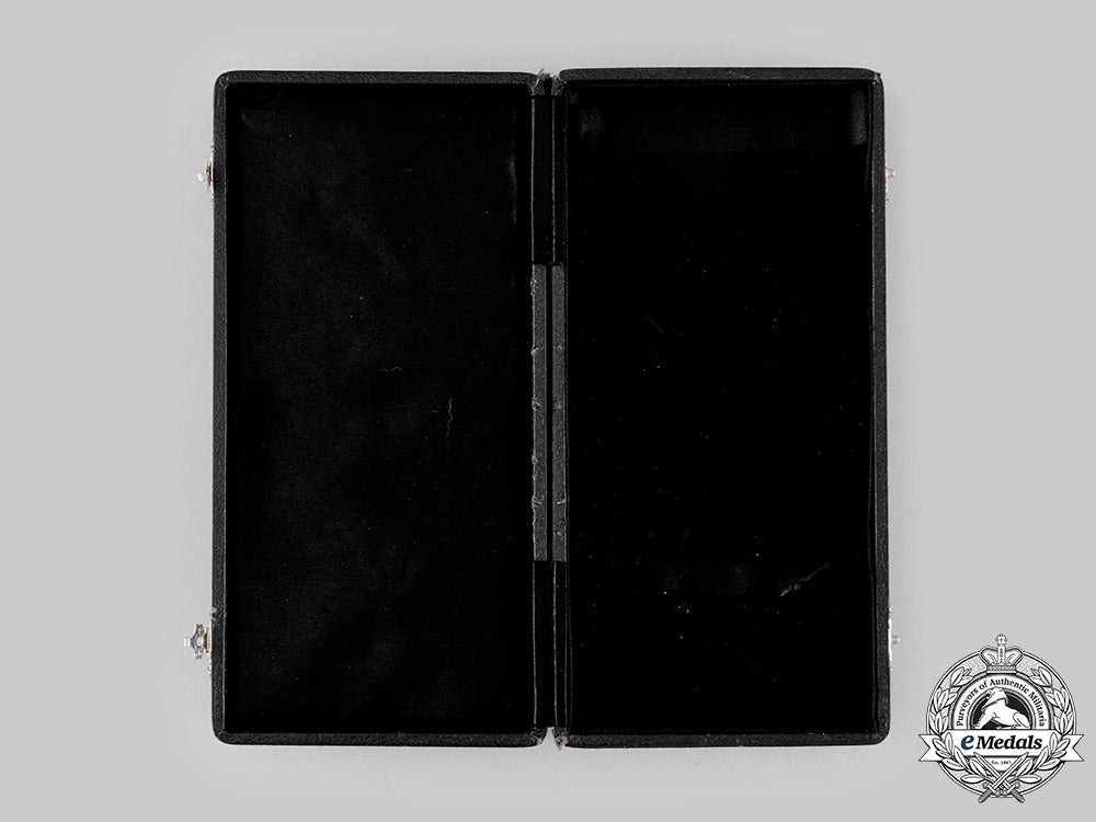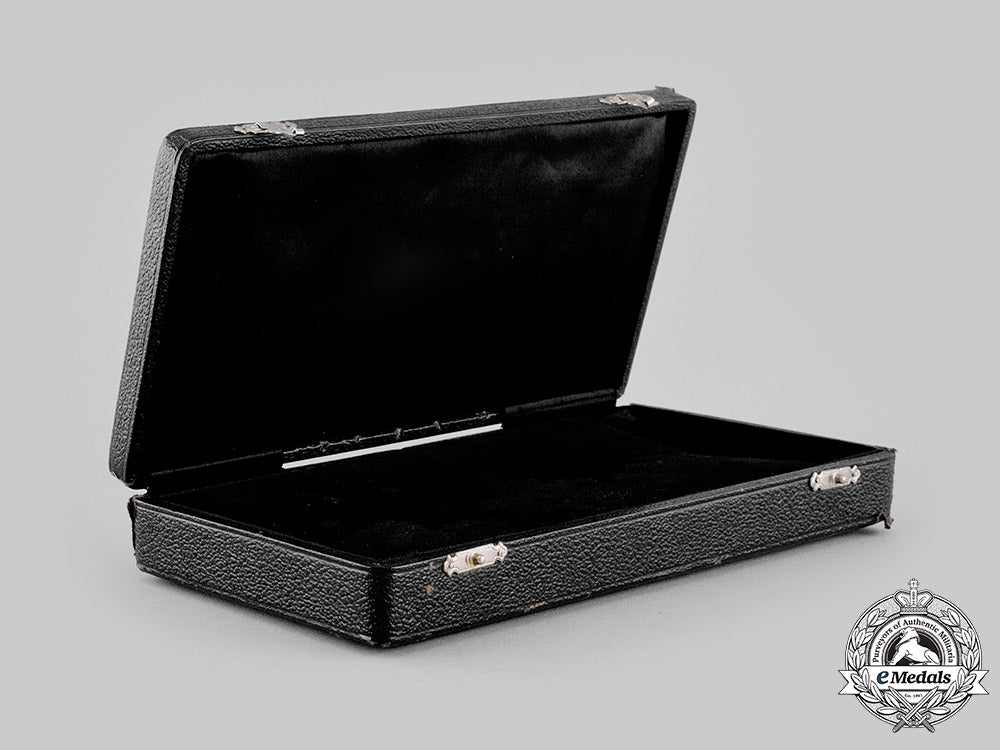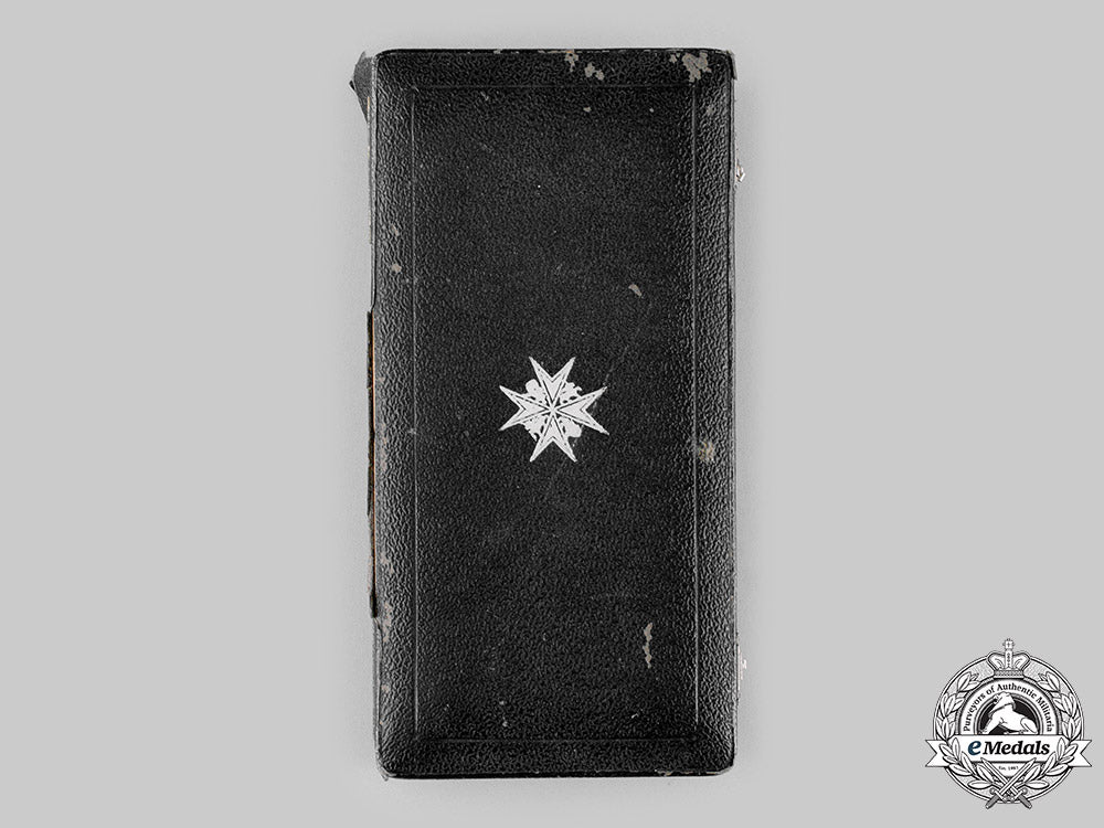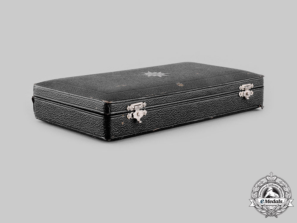 Instituted in 1888. Hardshelled design on both the lid and base, black simulated-leather pebbled-texture paper exterior on all sides, the lid bearing the Order of St. John cross in silver-coloured ink, black satin lining and padded on the inside lid, raised platform with a black felt recessed medal bed for the badge and a slotted medal bed for the breast star, the breast star medal bed a black satin pull-tab ribbon, dual-latch closures on the right side, dual-hinged on the left side, measuring 113 mm in width x 235 mm in length x 44.5 mm in depth, scuffing and wear evident on the exterior, with some of the covering peeling off and exposing the underlying wooden frame, surface rust on the hinges, extremely clean on the interior, near very fine.