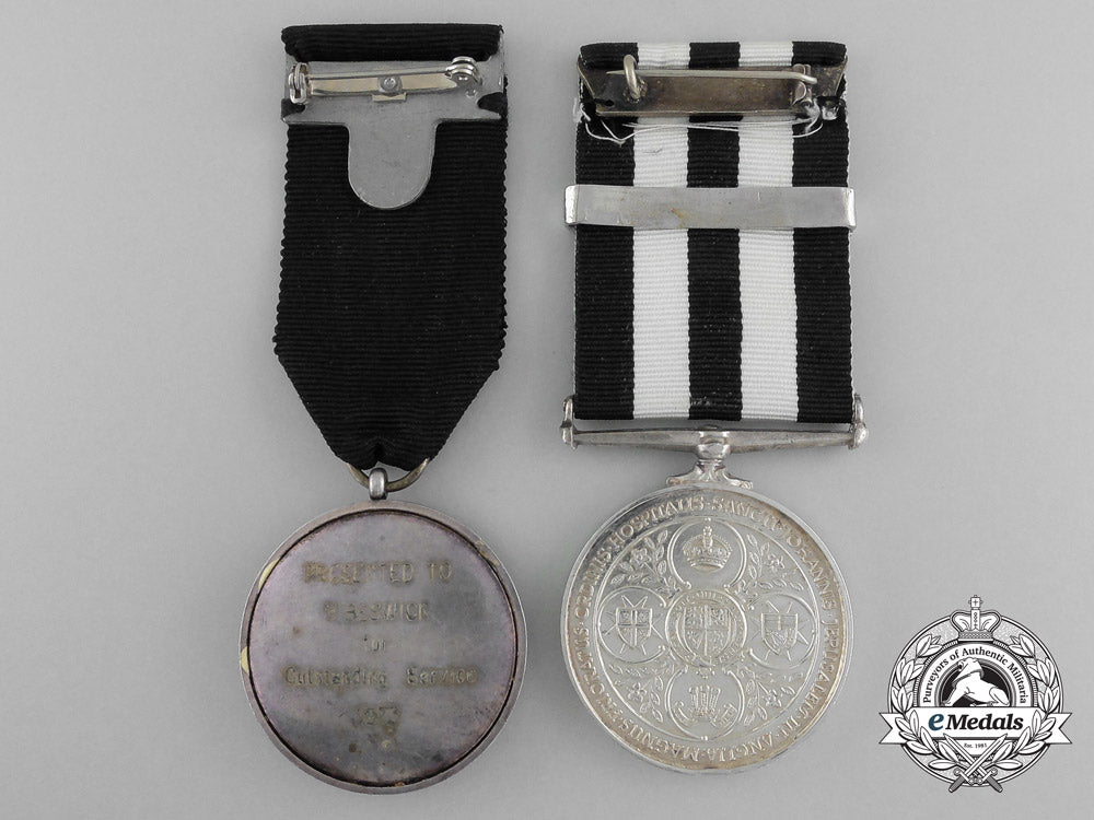 St. John Ambulance Brigade, Cambridge Ontario: Order of St. John, Officer (Sister) Breast Badge: silver with black and white enamels, with crosses and animals flush to their background (PRESENTED TO H BESWICK for Outstanding Service 1973), 38.5 mm; and Service Medal of the Order of St. John with five years' service bar: silver, 38.7 mm. Naming on the Breast Badge is engraved on the reverse, the SMOStJ is un-named. Un-mounted, each with its original ribbon with pinback, intact enamels, edge nicks on the SMOStJ, contact marks, better than very fine.