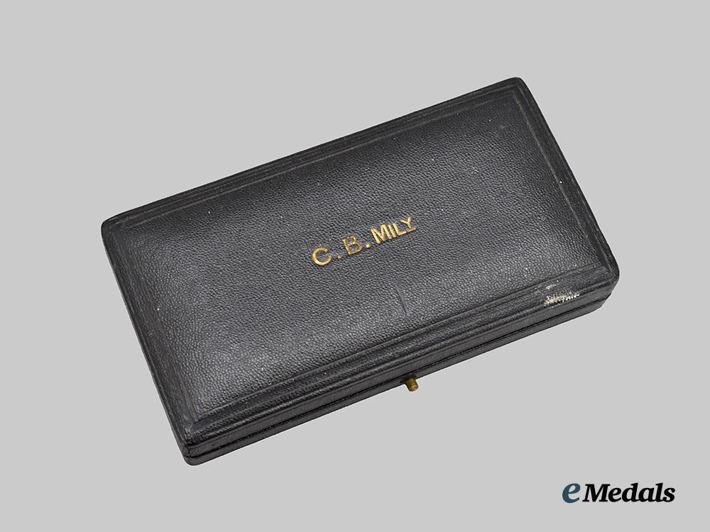 In the original case of issue, a black pebbled leather-look exterior, inscribed "C.B. MILY." in gold-coloured ink on the lid, inside lid in white satin, padded and maker marked "GARRARD & Co. Ltd. / 24, ALBEMARIE St., LONDON" base with a recessed and slotted medal bed in off-white felt, push release, dual-hinged, measuring 165 mm (w) x 90 mm (h) x 34 mm (d), light wear to exterior, in extremely fine condition.