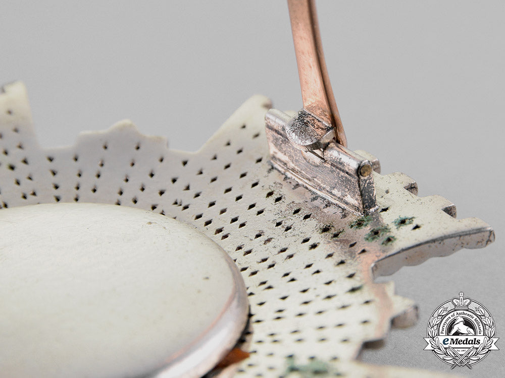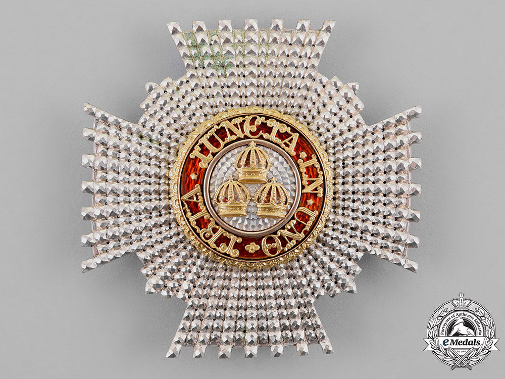 Instituted 1725. A a multifaceted silver cross, obverse centre appliqué in silver gilt consisting of the standard tricrown with red enamel surround presenting order motto TRIA JUNCTA IN UNO ("three joined in one"), reverse with Gold pin, measuring 75 mm (w) x 73 mm (h), with light enamel contact, extremely fine.