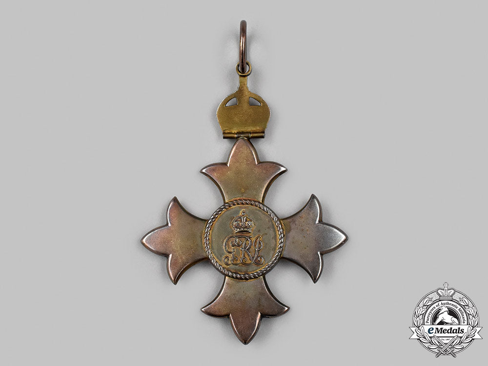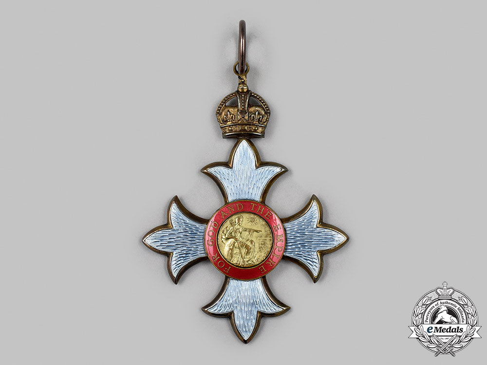 Instituted on June 4, 1917 by King George V. Type I (1917-1937). Civil Division. An Order of the British Empire in silver gilt with blue enamelled arms and a surmounting crown suspension, the obverse medallion presents a seated Britannia surrounded by a red enamelled ring inscribed FOR GOD AND THE EMPIRE, the reverse is plain with the center embossed with the crowned cypher of King George V, measures 62.25mm (w) x 85.25mm (h – inclusive of surmounting crown and integral ring), weighs 50.3 grams (inclusive on neck ribbon), unmarked, worn on full length purple civil division neck ribbon with simple hook and eye clasp, enamels intact, in overall extremely fine condition.