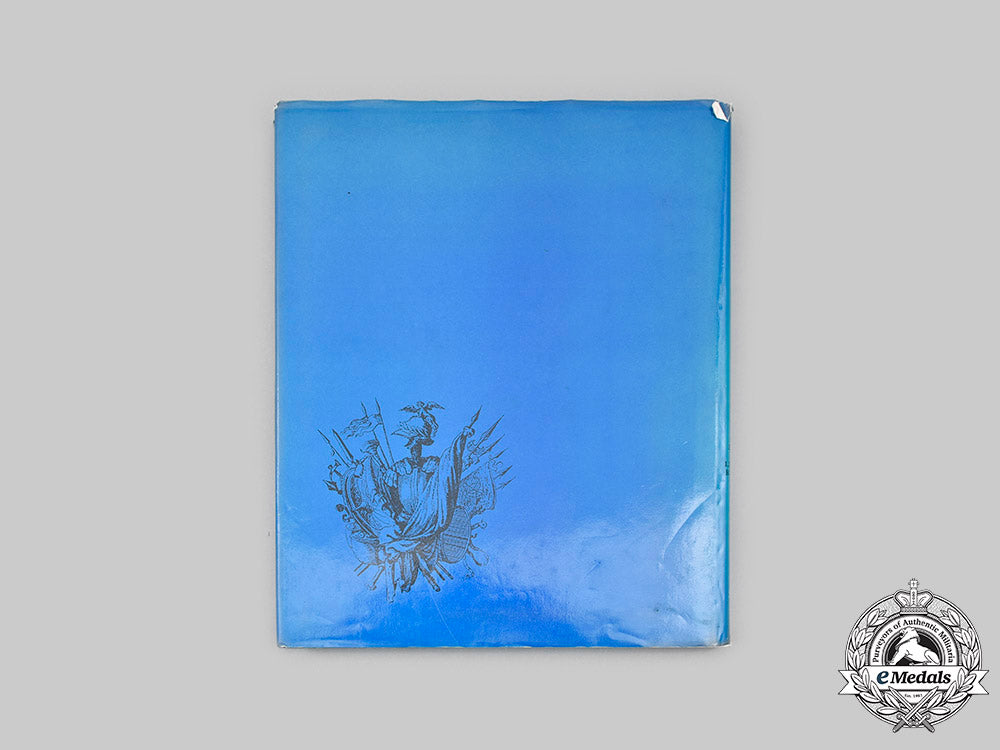 Hardcover, steel blue cloth cover, with dust jacket illustrating a collage of medals from the Spink collection, entitled "British Battles & Medals" by E.C. Joslin, A.R. Litherland and B.T. Simpkin, published by Spink & Son Limited of London in 1988, designed by Paul Sharp, photoset by Grillford Limited of Bletchley, printed by Pardy & Son Printers Limited of Ringwood, ISBN 0 907605 25 7. The dust jacket gives a brief analysis of the book: "A description of every Campaign Medal and Bar awarded since the Armada. This new edition describes each medal numismatically giving details of obverse, reverse, size, bar, etc. It includes the names of all the ships, regiments and squadrons present, with historical background for each campaign.", along with brief biographies of the three authors. It begins with a List of Contents, followed by a Preface by J.M.A.Tamplin, an Introduction by the Editors and a List of Acknowledgements. The majority of the book focuses on Campaign Medals from 1588 to 1982, which are listed in Chronological Order, illustrated through the use of black and white photographs, a few with line drawings where the medals themselves were not readily available due to scarceness. This is followed by the Polar Medals, the United Nations Medals, Indian Army Ranks and British Equivalents, a List of Regiments and Corps as of 1987, Precedence of Corps and Infantry Regiments, and a List of Cavalry and Infantry Regiments of the British Army. It concludes with a Bibliography, an Index of the Medals and an Index of the Bars. The book contains 308 pages, printed in black ink, and incorporating six colour plates, pages ii-iii with a reproduced painting of the Charge of the Scots Greys at Waterloo, plus four colour plates illustrating medal ribbons inserted between pages 272-273, on a satin-finished white paper stock, measuring 240 mm (w) x 312 mm (h) x 25 mm (d). The dust jacket exhibits sunning on the spine along with edge wear, however, the pages and cover of the book remain pristine. A valuable resource book for the collector of British medals. Near extremely fine.
