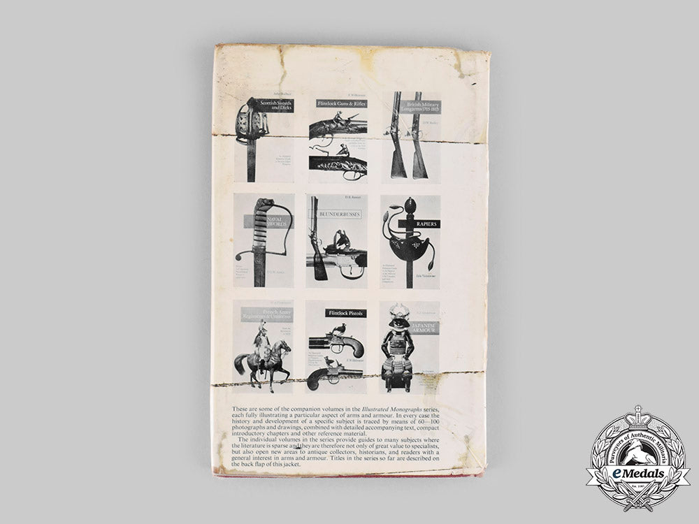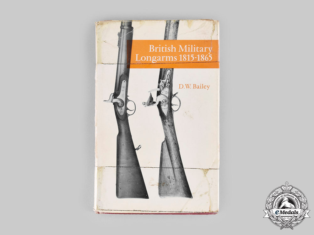 This is an edition of “British Military Longarms 1815-1865”, by D.W. Bailey. It is constructed of a heavy card stock binding and retains its original glossed paper stock dust jacket, with the cover bearing a black-and-white photograph of rifles flanked by author and title. The reverse features images of other reference volumes available from the Illustrated Monographs series. The interior content consists of 78 white paper pages featuring brief descriptions of British military rifles, supplemented by black-and-white photographs and an index. It was published in 1972 by Stackpole Press of Harrisburg, Pennylsvania. The book measures 144 mm (w) x 222 mm (h). Significant material fatigue is evident, with taping of the dust jacket to the binding. It is in an overall fair condition.