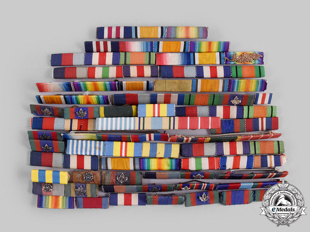 Includes ribbons of Military Medal, British War Medal, Victory Medal, 1939-1945 Star (one with a rosette), Africa Star (one with a rosette), Italy Star, France and Germany Star, Defence Medal, War Medal 1939-1945, Efficiency Medal, Canadian Volunteer Service Medal (seven with maple leaf clasps), Canadian Forces' Decoration, United Nations Service Medal for Korea, United Nations Emergency Force Medal, among others.