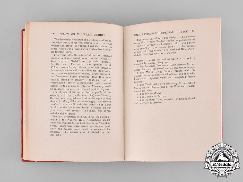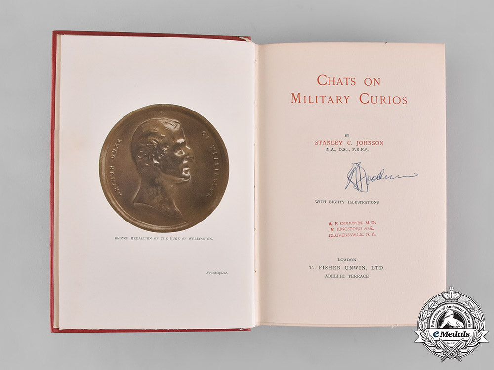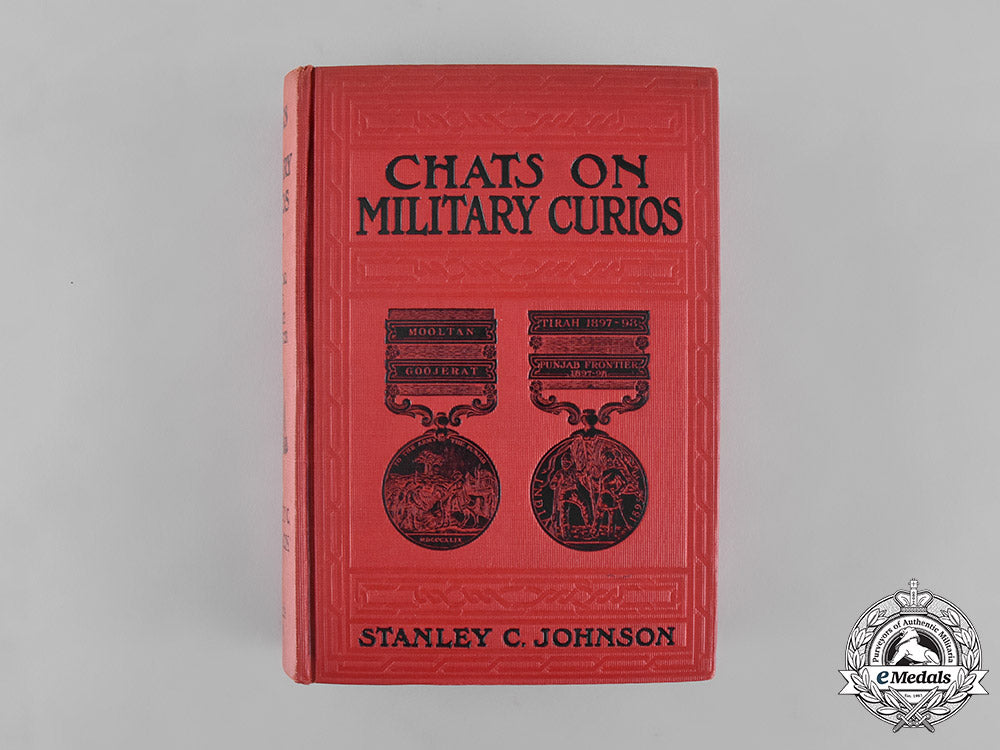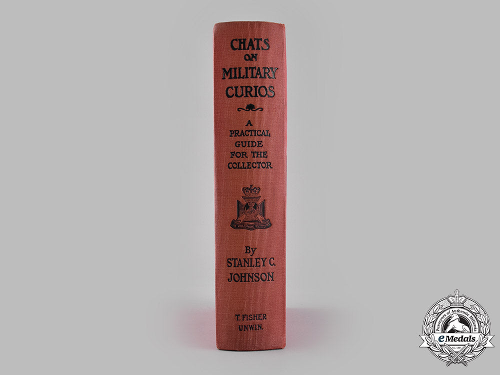 Chats on Military Curios, by Stanley C. Johnson, published in London circa 1915 by T. Fisher Unwin, Ltd., hardcover, containing 342 pages including 80 black-and-white illustrations, measuring 14 cm (w) x 20.8 cm (h), presenting minimal scuffing of the cover and light fraying of some pages, and in overall near extremely fine condition.
