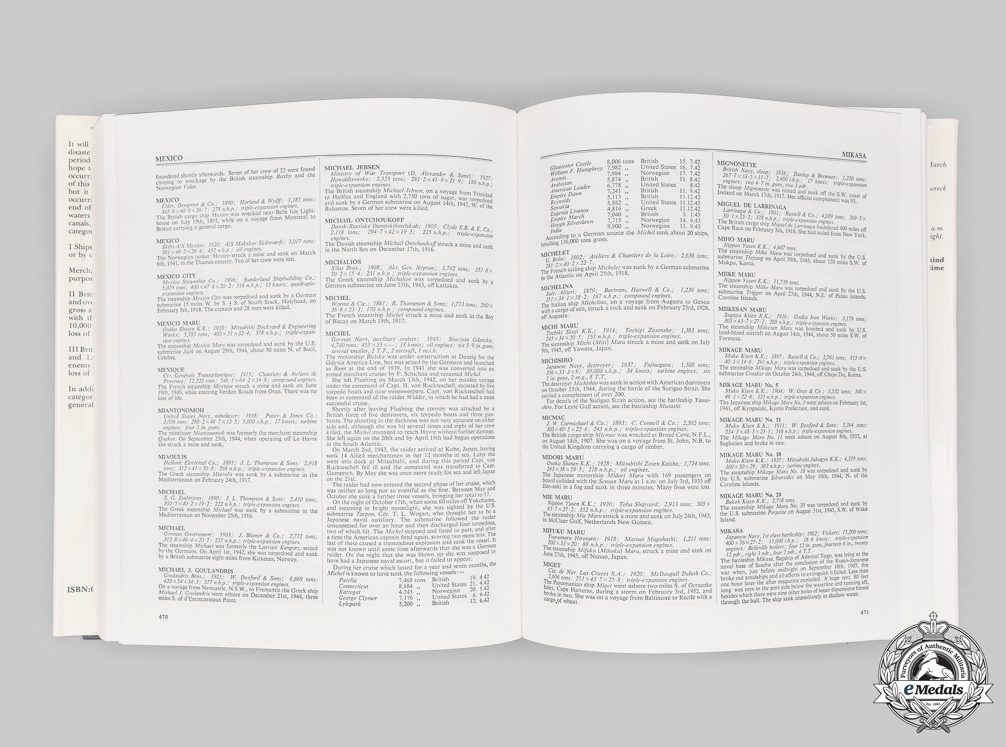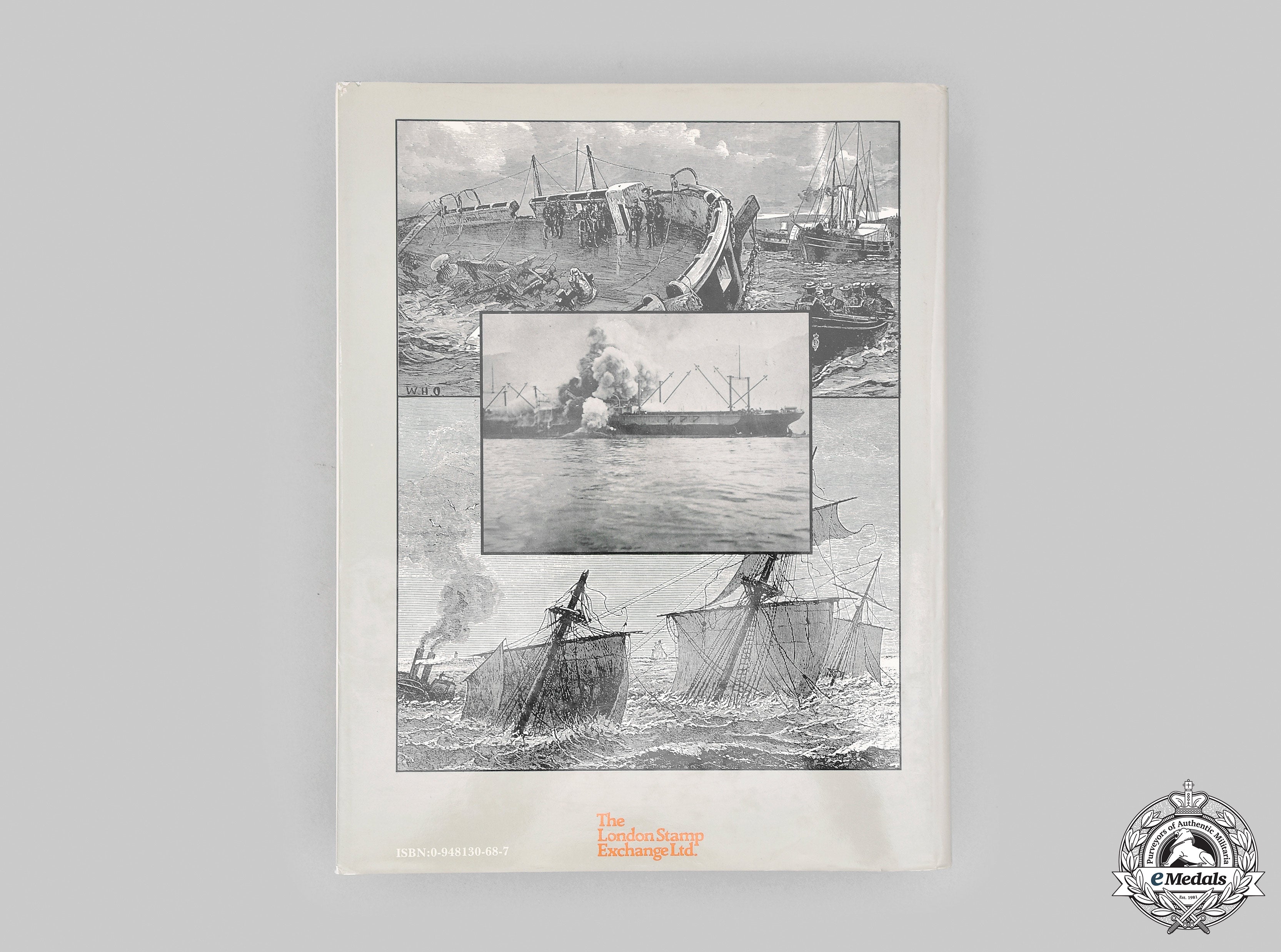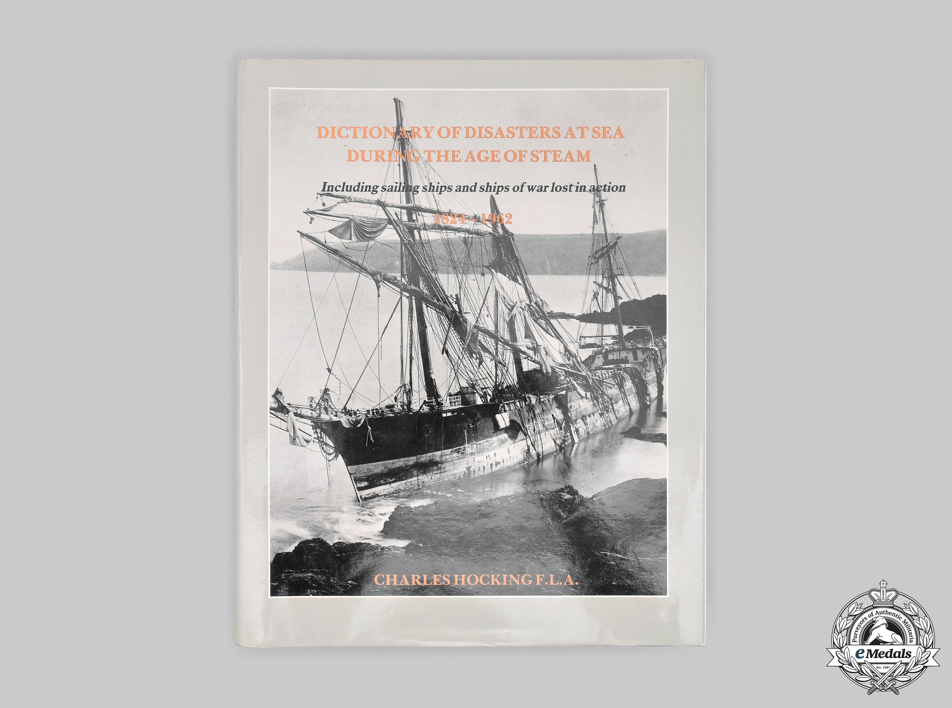 Hardcover, steel blue cloth cover, with dust jacket, entitled "Dictionary of Disasters at Sea during the Age of Steam - Including sailing ships and ships of war lost in action 1824-1962" by Charles Hocking, F.L.A., formerly the Borough Librarian of Acton, Middlesex, England. It was first published in 1969 by Lloyd's Register of Shipping and printed by Lloyd's Register of Shipping at Garrett House, Manor Royal Crawley, Sussex, England. The first London Stamp Exchange Edition was published in 1989, this edition published by The London Stamp Exchange of London in 1990, in conjunction with George A. Brown, A.I.I.C. of Langley, British Columbia, Canada, printed by Bookcraft Limited of Midsomer Norton, ISBN 0 948130 687. It begins with a Letter of Appreciation dedicated to the original writer of the Foreword, Admiral Lord Mountevans of Chelsea, followed by the Foreword and Explanatory Notes. As stated in both the Foreword and on the dust jacket, it describes the basic content of the book: "It will be appreciated that no dictionary of disasters at sea, even within so limited a period as that covered by the age of steam, can hope to deal with every wreck or stranding occurring upon the seven seas. The compass of this work has therefore had to be limited, but it does include all shipping casualties occurring since 1824 (inclusive) and up until the end of 1962, on the high seas, in territorial waters, or in inland waters, including ship canals, and falling within the following categories: I - Ships of war (surface) lost by enemy action or by ordinary military marine risks (merchant ships requisitioned for naval purposes are treated as warships); II - British merchant ships of 500 tons gross and over, foreign merchant ships of 1,000 tons gross and over, lost by ordinary marine risks with the loss of five or more lives, ships of 10,000 tons gross and over with or without loss of life; III - British and foreign merchant ships, of 500 and 1,000 tons gross respectively, lost by enemy action action in World Wars I and II whether loss of life was reported or not. In addition, many other losses outside these categories have been included for reasons of general interest." The 779 page section entitled Dictionary of Disasters at Sea during the Age of Steam is an alphabetically listing, each listing taking into account the type of ship, the ship's owner, its date of launching, the ship's builder, the vessel's pertinent statistics, the location of its sinking, all in italicized text, followed by a block of text in boldface text describing what is known as to the events leading up to and the circumstances under which the ship met its demise. The book contains 788 pages of text, printed in black ink, on a white paper stock, the top edges of the pages coloured in steel blue, weighing 1.8 kilograms, measuring 215 mm (w) x 275 mm (h) x 50 mm (d). It exhibits a small dent at the lower left corner on the front cover, along with two spots on the side of the pages, however, the pages contained within remain unaffected. Near extremely fine.