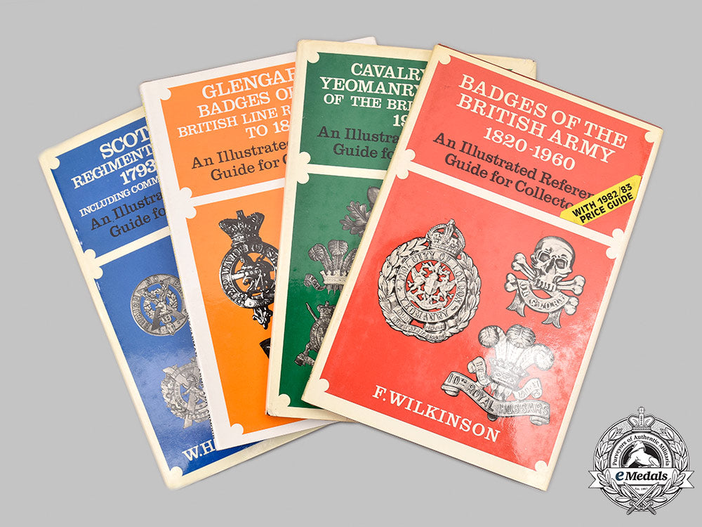 1. Badges of the British Army, 1820-1960, by F. Wilkinson: hardcover, scarlet red cloth cover, with dust jacket, Fifth Edition published in 1982 by Arms and Armour Press, Lionel Leventhal Limited, printed in Great Britain by Fakenham Press Limited of Fakenham, Norfolk, ISBN 0 85368 188 0.