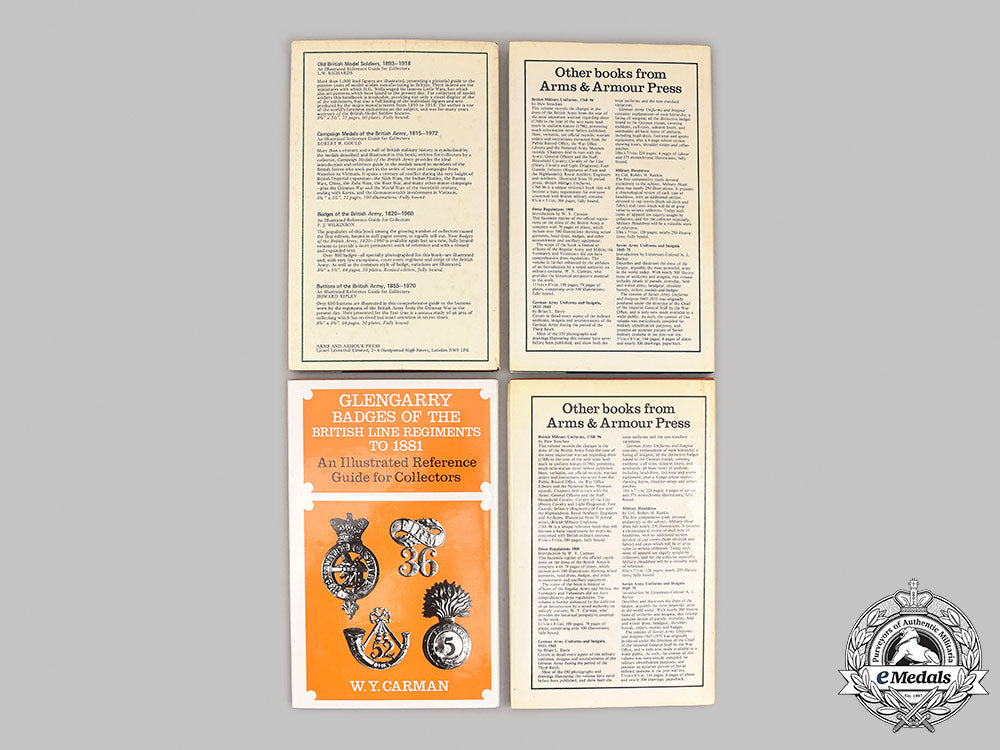 3. Glengarry Badges of the British Line Regiments to 1881, by W,Y, Carman, F.S.A., F.R. Hist.S.: hardcover, caramel brown cloth cover, with dust jacket, published in 1973 by Arms and Armour Press, Lionel Leventhal Limited, printed in Great Britain, produced by Dexin (Printers) Ltd. and Duotech Graphics Ltd., ISBN 0 85368 389 1.