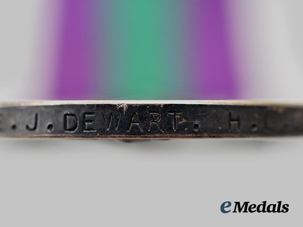 2. Institution Date: 1923. In silver, with the obverse bearing a leftward facing bust of George the 6th marked “PM”, and the reverse bearing the winged Roman Goddess Victory holding a laurel wreath. Maker marked “E CRP” for E. Carter Preston. Medal named to Pvt J. Dewart, Highland Light Infantry on the rim. On period ribbon denoting general service with a Palestine clasp affixed. Medal measuring at 35mm (w) x 48mm (h- to top of suspension). With minor discoloration, in very fine condition.