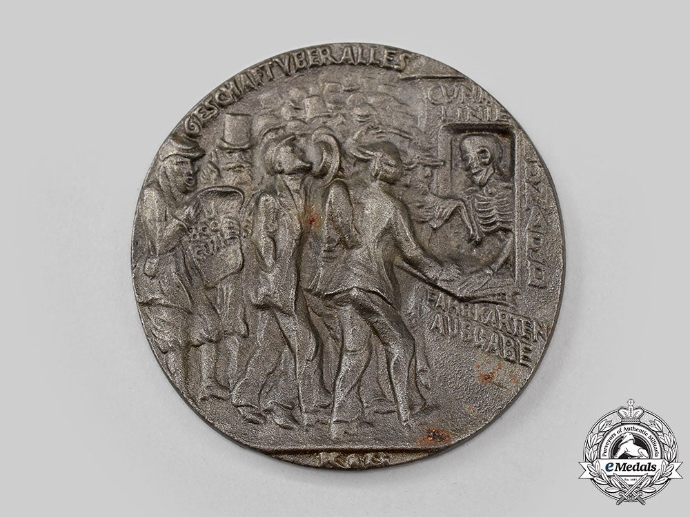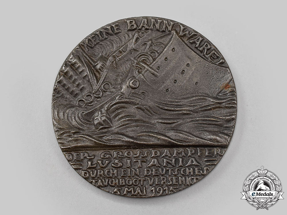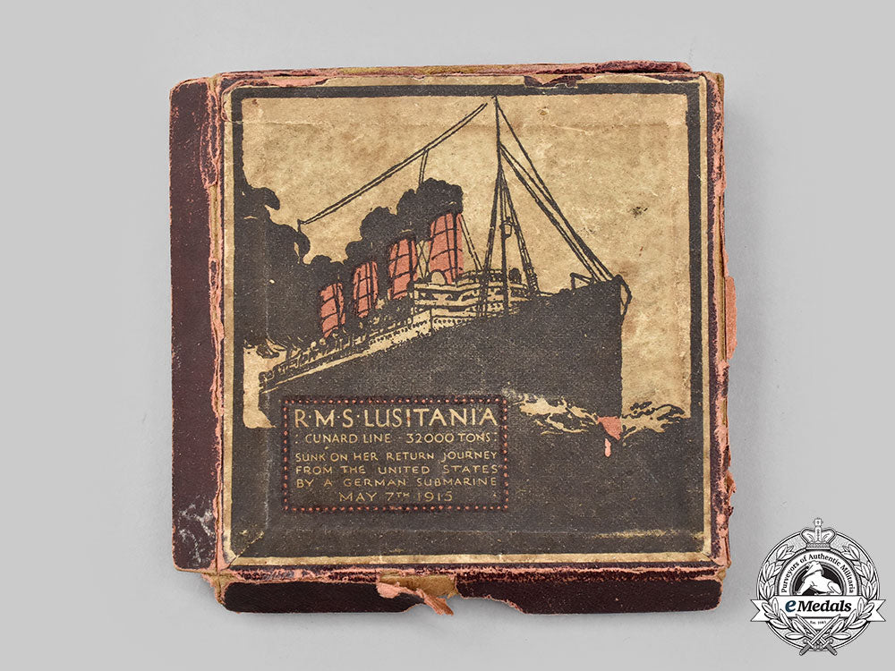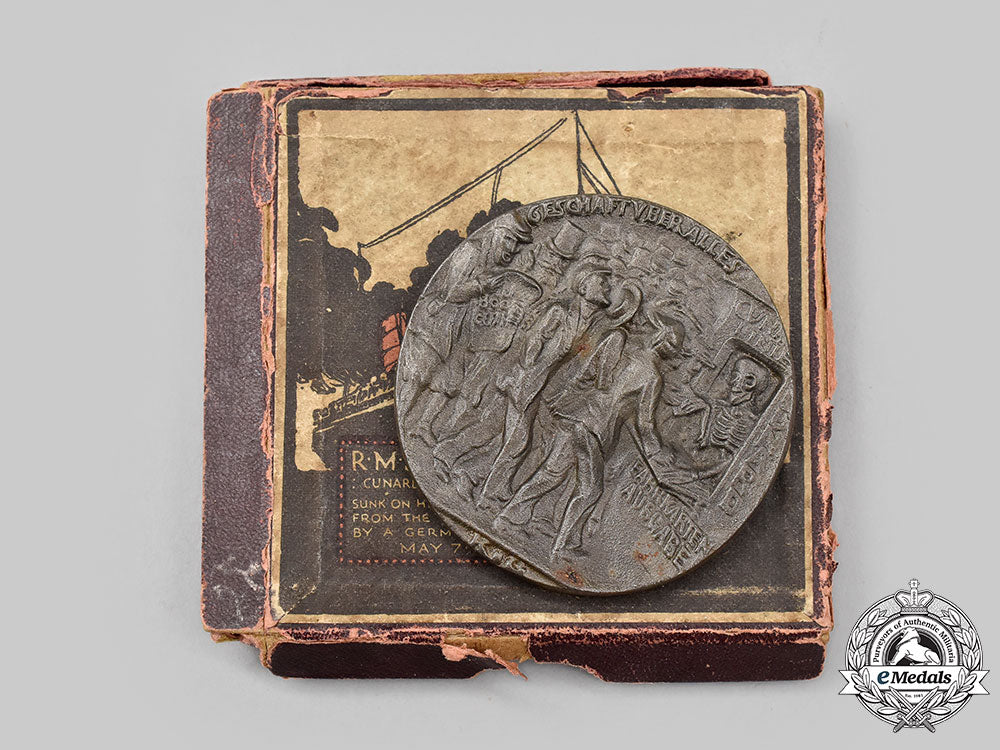 In blackened iron, magnetic, obverse illustrating the stricken liner sinking, her stern submerged to left while her ram-shaped bow, laden with armaments, rises clear of the water (an image contradicting eyewitness accounts which stated that the ship went down bow first, the shape of the bow being a reference to the configuration of warships of the period and possibly a reminder that the British Admiralty had ordered merchant vessels to attempt to ram German submarines), smoke billowing from the vessel's four funnels, inscribed "KEINE BANN WARE!" (No Contraband Goods) above and "DER GROSS-DAMPFER=LUSITANIA=DURCH EIN DEUTSCHES TAUCHBOOT VERSENKT 5.MAI 1915" (the liner Lusitania sunk by a German submarine 5 May 1915) below, reverse illustrating Death in the form of a skeleton, behind the ticket office counter of the Cunard Line in New York, issuing tickets to a crush of passengers, sign above the window inscribed "CUNA LINIE" (Cunard Line), arranged vertically down the right side of the window is the word "CUNARD" and below the counter "FAHRKARTEN AUSGABE" (Ticket Office), at the extreme left of the crowd a man reads a newspaper bearing the headline "U BOOT GEFAHR" (U-boat Danger) and standing next to him is a top-hatted and bearded figure, a representation of the German Ambassador to the USA, Count Johann-Heinrich von Bernstorff raising a warning finger, inscribed "GESCHÄFT ÜBER ALLES" (Business Above All) above and the initials of the designer, "KG" (Karl Goetz) below the feet of the crowd, measuring 56 mm in diameter, extremely fine. In its box of issue, label on the lid marked "R.M.S. LUSITANIA", illustrating the ship with a brief description and the details of its sinking, inside lid inscribed "The "Lusitania" (German) Medal", the description below indication it is "an exact replica", along with details of the sinking and the German encouragement and justification exhibited towards the event, soiled medal bed, measuring 78 mm (w) x 78 mm (h) x 10 mm (d), scuffing and soiling evident on the exterior, the lid having separated from the base, box fair.
