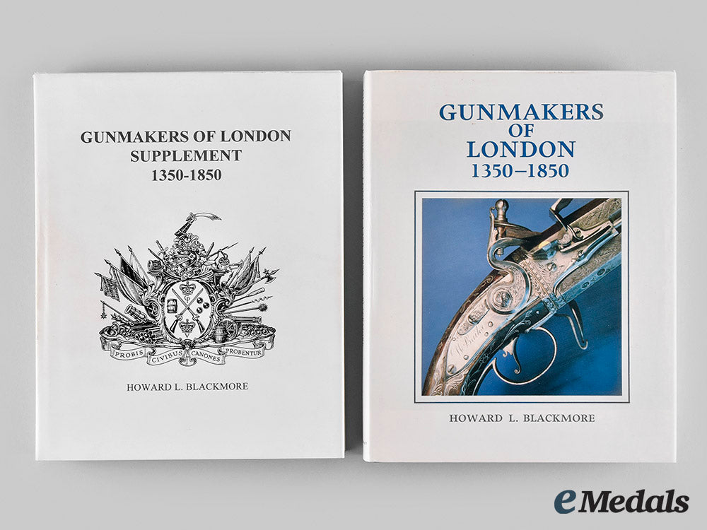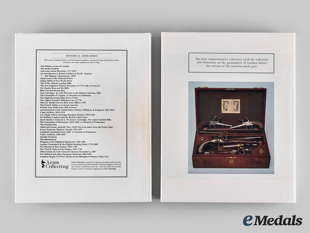 An extremely well-preserved set of “Gunmakers of London: 1350-1850”, by Howard L. Blackmore. It consists of two volumes, each bound with heavy card stock bindings retaining original paper stock dust jackets. The main volume features 222 white paper stock pages bearing a comprehensive index of known gunmakers operating in London during the period specified, supplemented by an index and black-and-white sketches and diagrams. The supplement consists of 156 white paper stock pages with an additional introduction and history of London firearms manufacturing, similarly supplemented by black-and-white sketches, advertisements, and diagrams. Each book measures 225 mm (w) x 286 mm (h), and is accompanied by a period original white card stock slip cover. The set was published in 1999 by Museum Restoration Service of Bloomfield, Ontario and Alexandria Bay, New York. Minor discolouration is evident to the dust jackets of both books, as well as the slip cover, but this fully intact set is in an overall extremely fine condition.