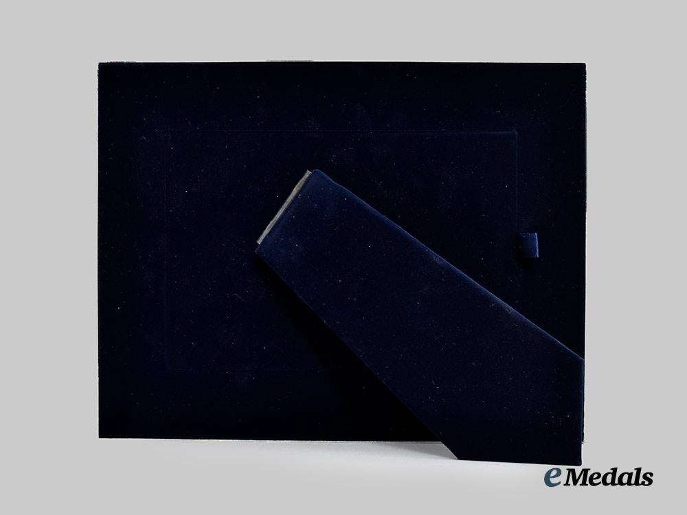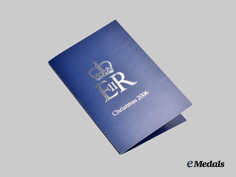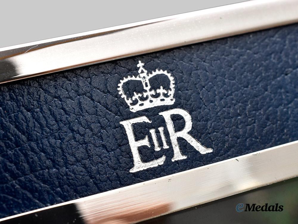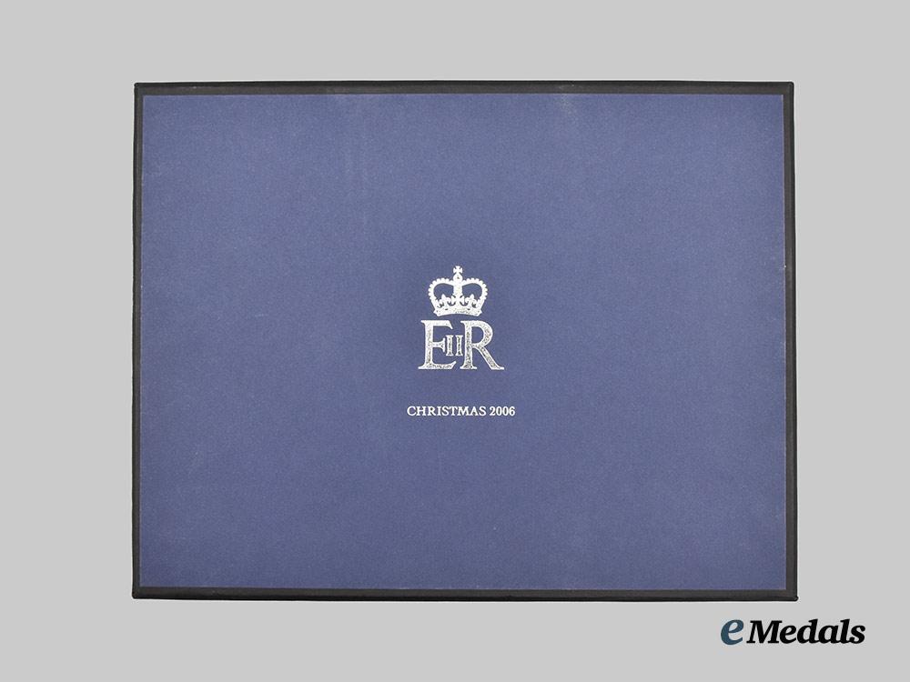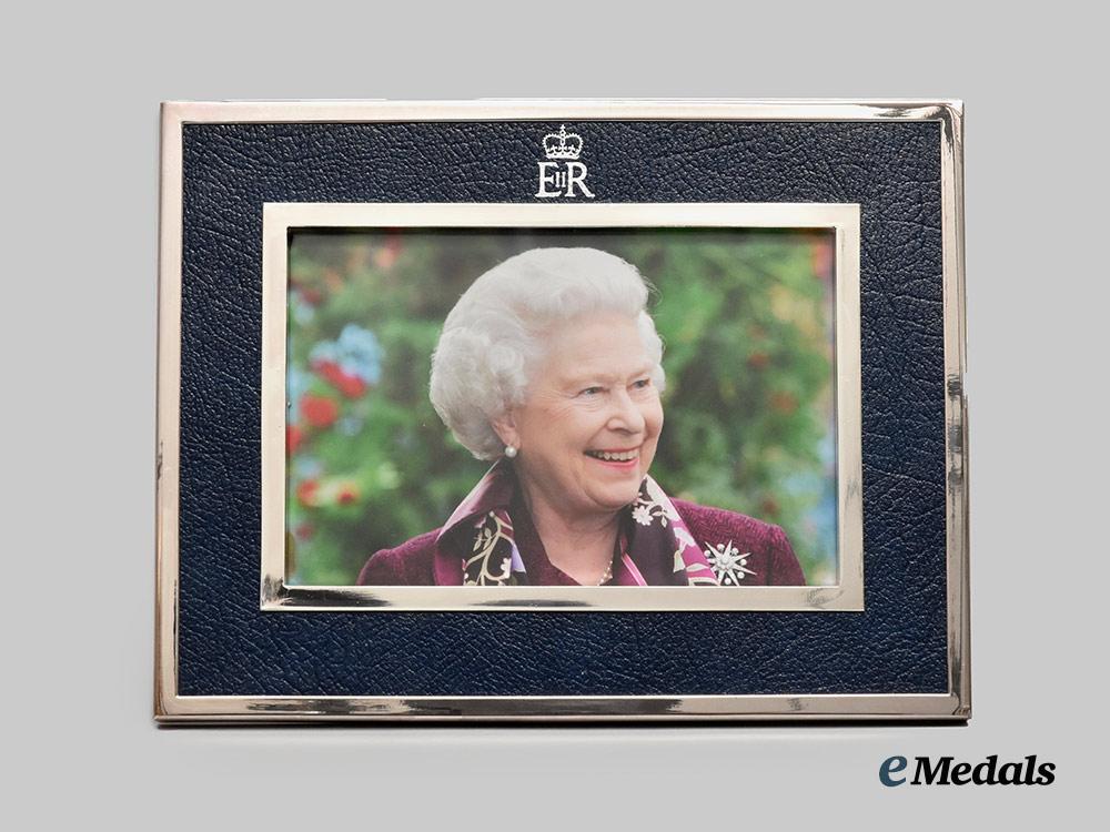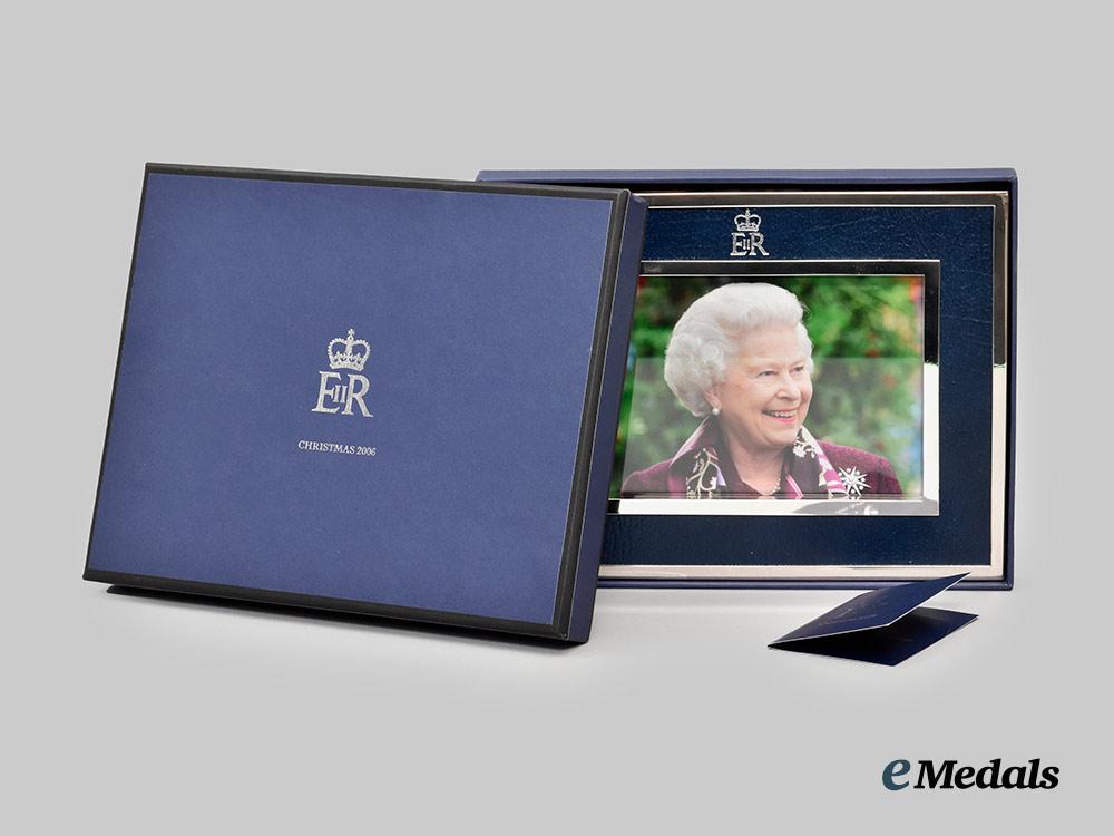 A fine quality picture frame constructed of highly polished silvered non-magnetic frame, with a larger exterior frame and a smaller interior frame separated by a dark blue textured faux leather surface that is decorated with the crowned Royal Cypher of Queen Elizabeth II, with a flat glass pane to protect the photograph, the reverse with a dark blue felt surface and a collapsable stand for placement on a flat surface, accompanied by a colour print of Queen Elizabeth II smiling and looking off towards her left, measuring 213 mm (w) x 165 mm (l). Contained in its original cardboard presentation box with a dark blue exterior, the exterior of the lift-off lid embossed with the crowned Royal Cypher of Queen Elizabeth II and “Christmas 2006” in silver ink, accompanied by white wrapping paper for secure packaging of the frame, the box measuring 226 mm (w) x 178 mm (l) x 28 mm (l), in near mint condition.