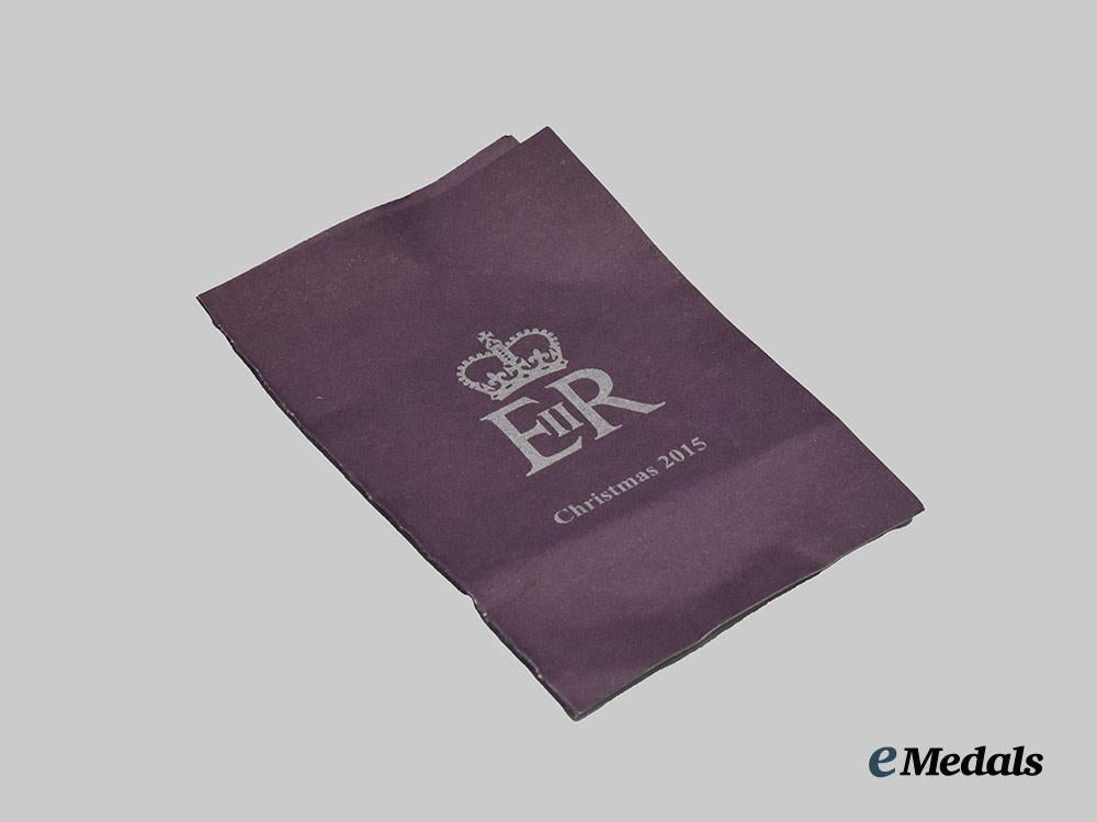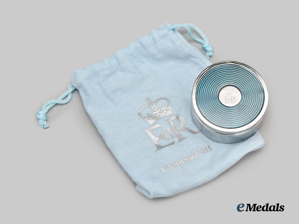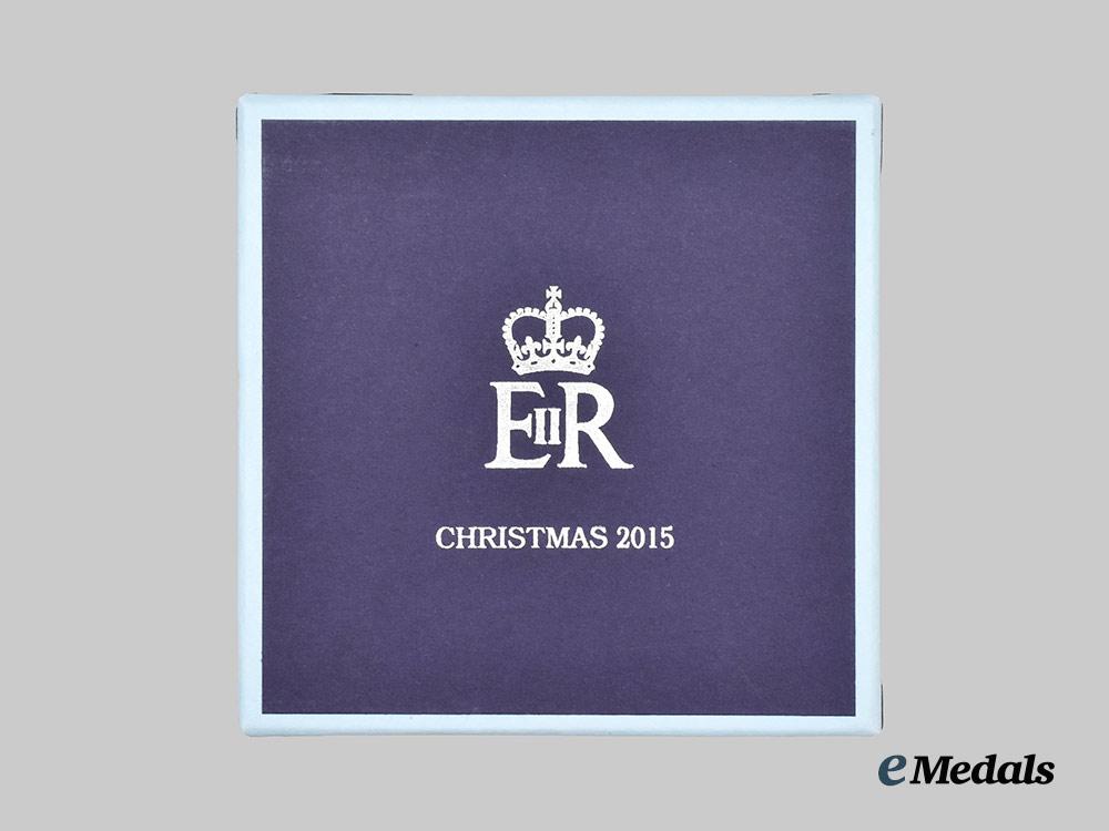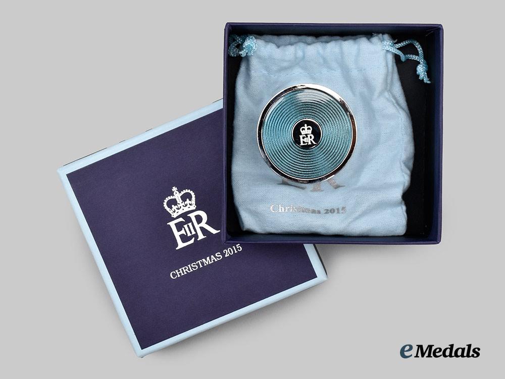 A fine desk alarm clock, constructed of a faux chromed white metal exterior, with a flip-open protective cover for the face of the clock, the dial with roman numerals as hour markers with a chromed hour, minute, and third alarm hand, inscribed “Christmas 2015” on the dial, the obverse of the flip-open cover with blue enamels and a central medallion bearing the crowned Royal Cypher of Queen Elizabeth II, the reverse with a battery hatch, along with two toothed wheels for adjusting of the time and alarm settings, measuring 49 mm in diameter. Contained in its original cardboard presentation box with a dark blue exterior, the exterior of the lift-off lid embossed with the crowned Royal Cypher of Queen Elizabeth II and “Christmas 2015” in silver ink, accompanied by white wrapping paper and a light blue cotton fabric pouch with the Queen’s Royal Cypher and “Christmas 2015” printed on the obverse in silver ink, the box measuring 108 mm (w) x 108 mm (l) x 46 mm (l), in near mint condition.