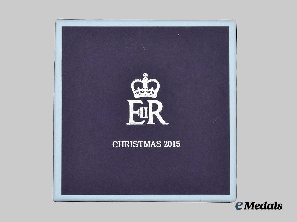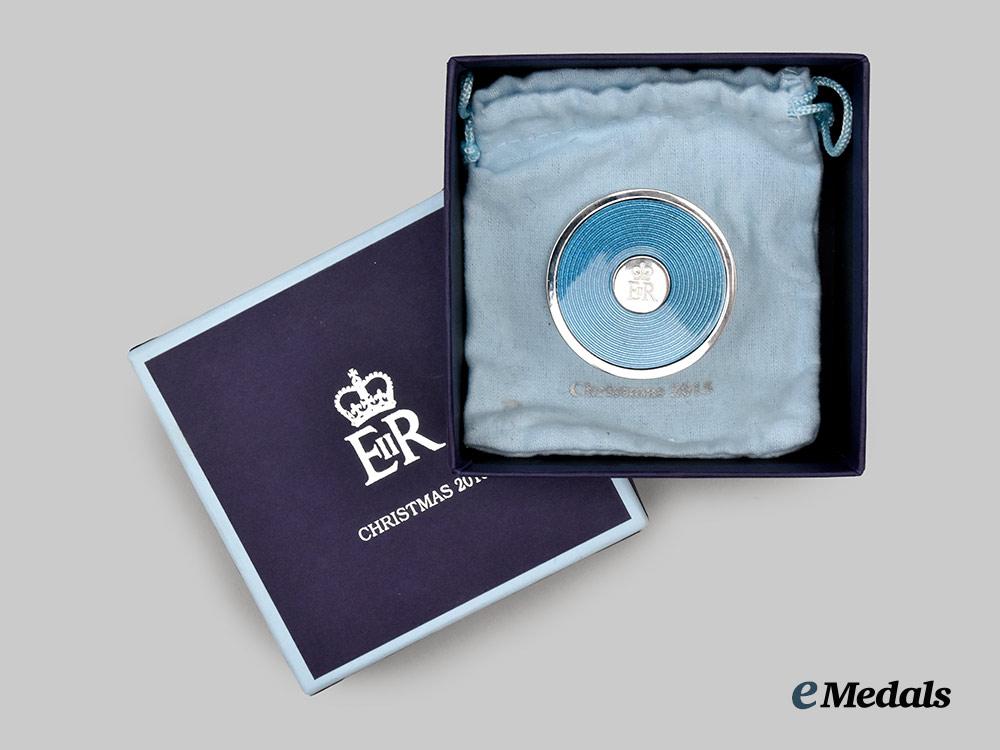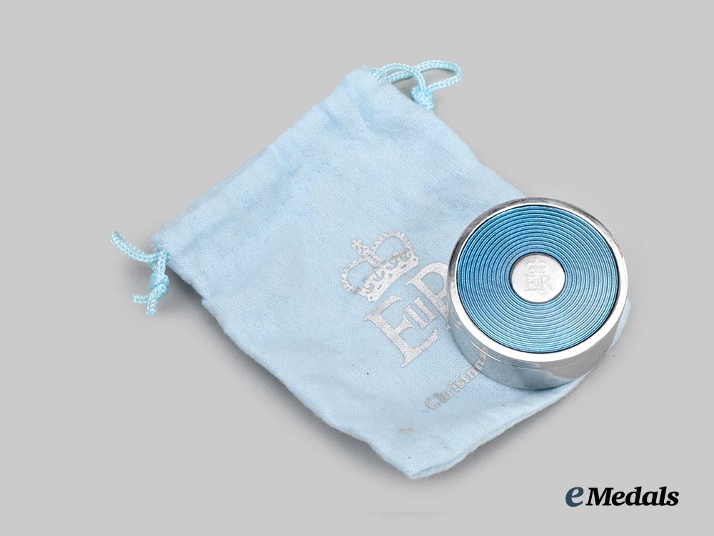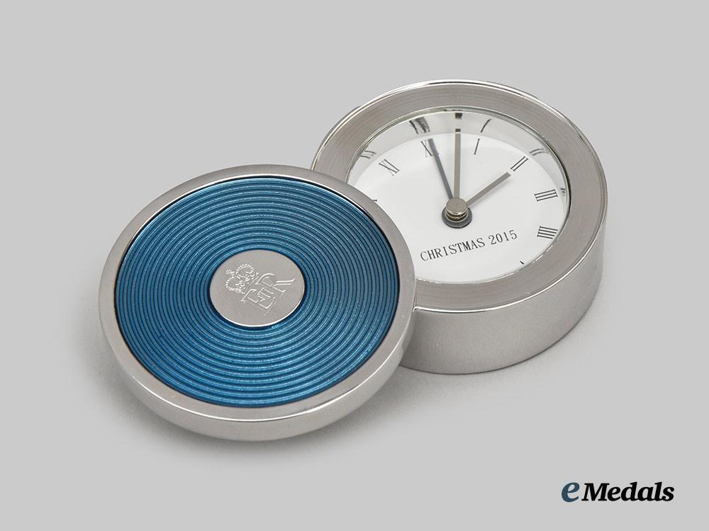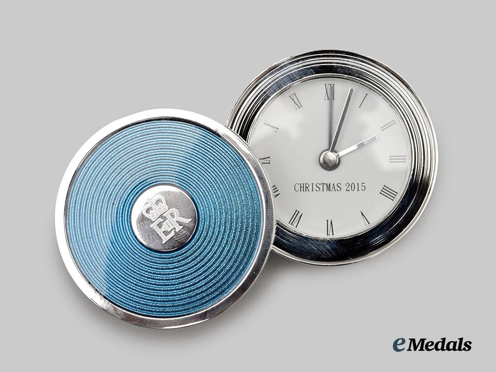 A fine desk alarm clock, constructed of a faux chromed white metal exterior, with a flip-open protective cover for the face of the clock, the dial with roman numerals as hour markers with a chromed hour, minute, and third alarm hand, inscribed “Christmas 2015” on the dial, the obverse of the flip-open cover with blue enamels and a central medallion bearing the crowned Royal Cypher of Queen Elizabeth II, the reverse with a battery hatch, along with two toothed wheels for adjusting of the time and alarm settings, measuring 49 mm in diameter. Contained in its original cardboard presentation box with a dark blue exterior, the exterior of the lift-off lid embossed with the crowned Royal Cypher of Queen Elizabeth II and “Christmas 2015” in silver ink, accompanied by white wrapping paper and a light blue cotton fabric pouch with the Queen’s Royal Cypher and “Christmas 2015” printed on the obverse in silver ink, the box measuring 108 mm (w) x 108 mm (l) x 46 mm (l), in near mint condition.
