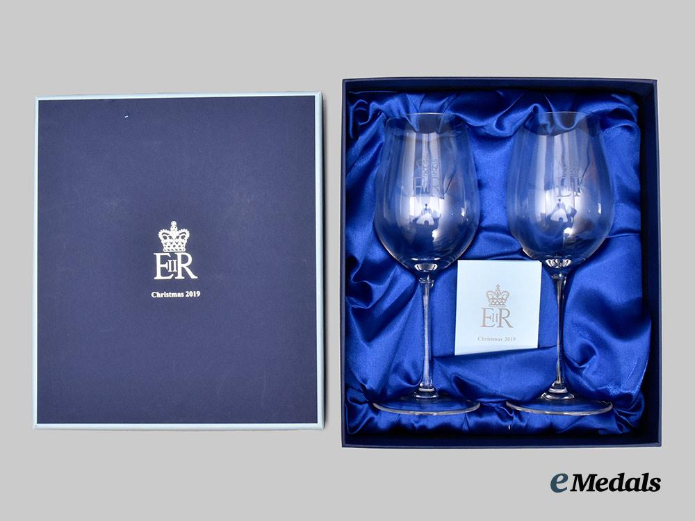 A fine set of crystal glass stemware, consisting of two red wine glasses, both etched on the side of the bowl with the crowned Royal Cypher of Queen Elizabeth II, measuring 22 cm tall and 8 cm wide at its widest point. Contained in its original cardboard presentation box with a dark blue exterior, the exterior of the lift-off lid embossed with the crowned Royal Cypher of Queen Elizabeth II and “Christmas 2019” in silver ink, the interior of the lift-off lid with a blue satin covered foam insert, the base of the box with a matching blue satin covered foam insert for plush and secure seating of the glassware, the box measuring 233 mm (w) x 270 mm (l) x 100 mm (h), in near mint condition.