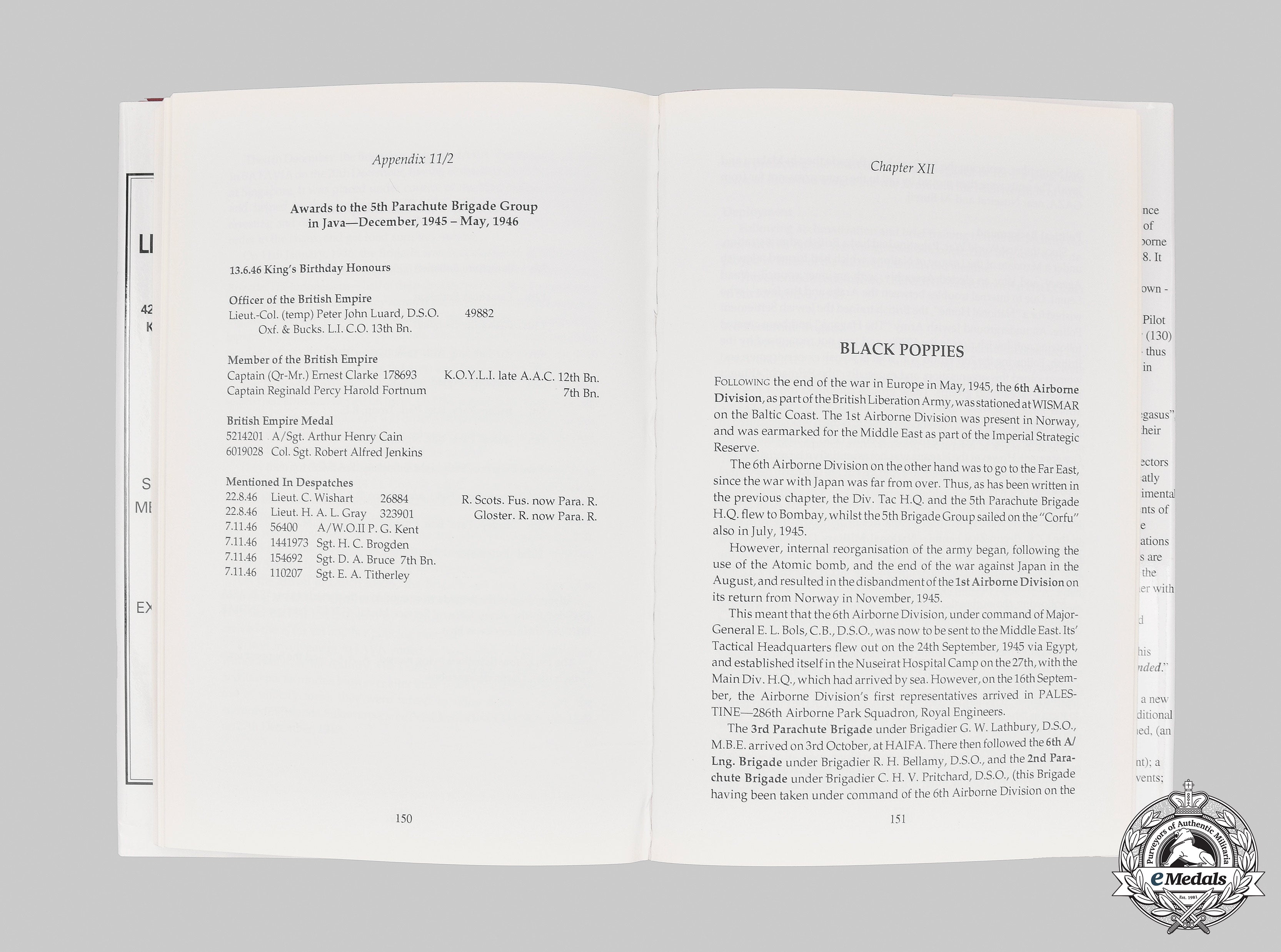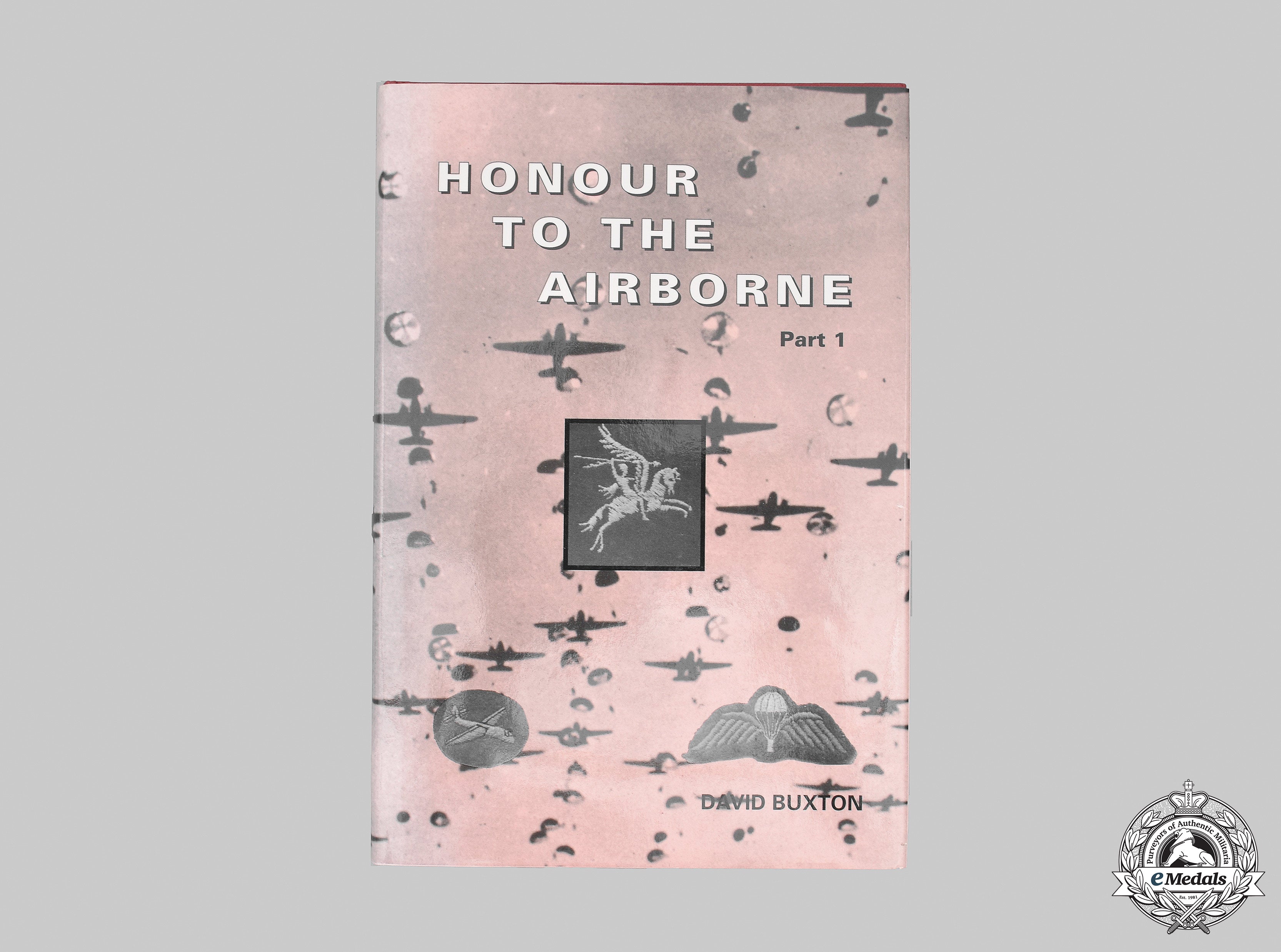 Hardcover, with dust jacket, entitled "Honour to the Airborne, Part 1 1939-48" by David Buxton, copyrighted by the author in 1985 and 1993, first published by Elmdon Publishing of Solihull, West Midlands, Great Britain in 1985, second revised edition published by Liverpool Medal Company of Bury, Lancaster in 1993, ISBN 1 899422 00 5. As stated on the dust jacket: "First published in 1985, this reference work was the first definitive study of honours and awards to British Airborne forces, covering the period 1939-48. It was sectionalised, each covering a campaign, with the decorations shown - the approximate split being - Parachute Regiment (760); Glider Pilot Regiment (120); Airborne Infantry (130) and Airborne Support units (220) - thus over 1200 awards from a Mention in Despatches to a Victoria Cross. In the Airborne Forces Journal "Pegasus" it was reviewed by the Curator of their Museum as: "A must for the historians and collectors of airborne history and awards. Neatly laid out by sections it gives the regimental number, rank and names of recipients of the awards under the heading of the theatre or individual operation. Citations for the awards of the Victoria Cross are included. An order of battle for all the airborne divisions is shown, together with an outline history of all the units, (including the supporting Arms and Services), together with a list of Commanding Officers highlights this initial work. Now the work is available again in a new revamped style, which includes additional information regarding Awards gained, (an example of which is the Parachute Battalion identified against recipient); a brief but informative narrative of events; and an Index of recipients." It begins with a Foreword (dated 1985), followed by a Foreword to the 2nd Edition (dated 1993), a List of Abbreviations, Awards and Service Medals and an Introduction. The book is divided in fourteen sections: 1 - The Early Beginnings 1940-42 (with two appendices); 2- Hot Baptism of the Red Devils (with four appendices); 3 - Airborne Attack - Sicily 1943 (with four appendices); 4 - Buongiorno! Italy 1943 (with one appendix); 5 - United KIngdom Honours to Airborne 1944; 6 - A Cockerel Liberated - France 1944 (with two appendices); 7 - Battle of the Bridges - Arnhem 1944 (with three appendices); 8 - From Italian Sunset to Grecian Twilight (with four appendices); 9 - From Snow to Water - 6th Abn. Div. (with two appendices); 10 - An Icy Welcome - 1st Abn. Div. in Norway (with one appendix); 11 - To the East - 5th Para. Bde. in Java (with two appendices); 12 - Black Poppies - 6th Abn. Div. in Palestine (with one appendix); 13 - Unit Histories & Insignia of the Abn. Elements (with four appendices); 14 - Select Bibliography - recommended books on the Airborne to be read in conjunction with this reference work. The book contains 258 pages of text only, printed in black ink, on a white semi-gloss paper stock, measuring 160 mm (w) x 240 mm (h) x 22 mm (d). Near extremely fine.