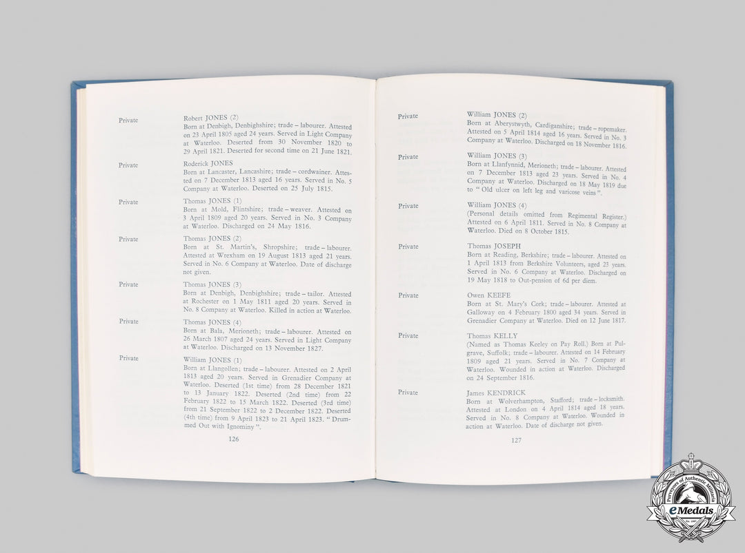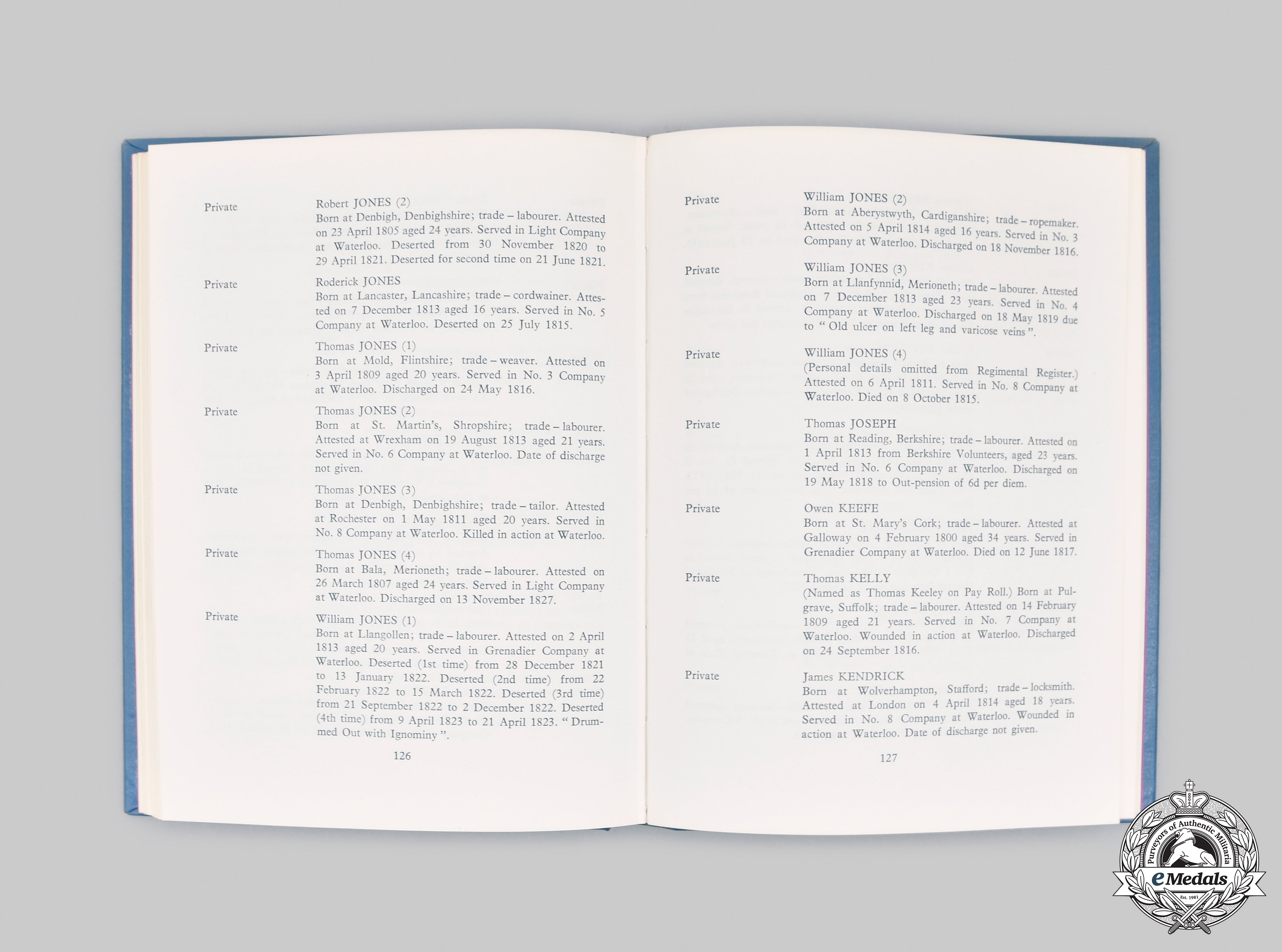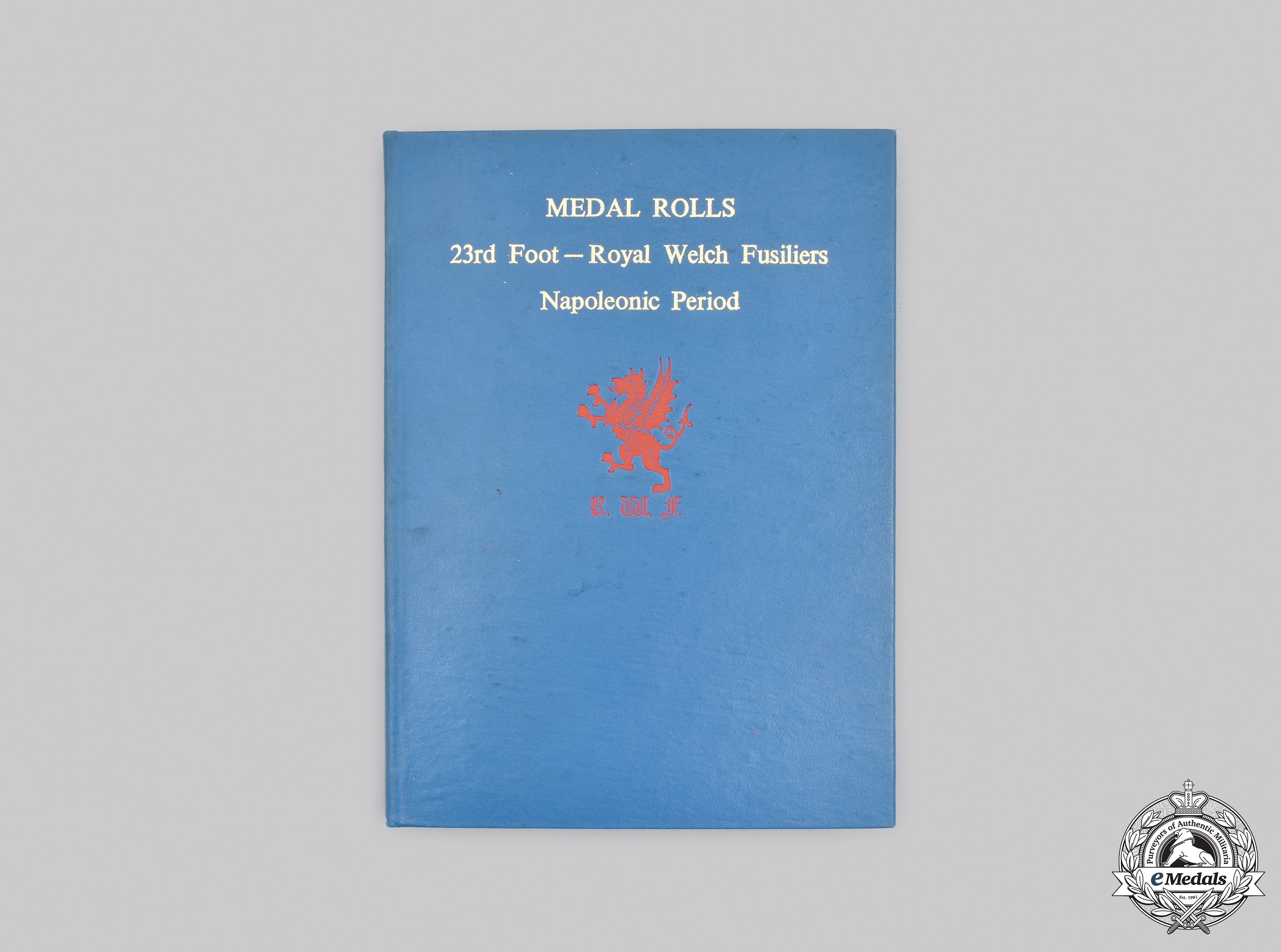 Hardcover, sapphire blue paper wrapped cover, the regimental insignia on the cover in red ink, the text on the front cover and the spine in silver-coloured ink, entitled "Medal Rolls: 23rd Foot - Royal Welch Fusiliers, Napoleonic Period", with Biographical Notes on Officers, N.C.O.s and Men, compiled by Norman Holme & Major E.L. Kirby, M.C., T.D., D.L., copyrighted by the compilers in 1978, published by Regimental Museum, The Royal Fusiliers, Caernarfon Castle and Spink & Son, Limited of London, printed by Gee and Son (Denbigh) Limited. The book begins with a Table of Contents, followed by a Bibliography and sources of Reference, a Foreword by Major-General P.R. Leuchars, C.B.E., Colonel, The Royal Welsh Fusiliers, a Preamble and Notes. It is divided into nine sections: 1 - Rolls of Officers, N.C.O.'s and Men - By Companies - who were Present at Waterloo. The Rolls show Battle Casualties; 2 - Summary of Strength and Casualties at Waterloo; 3 - Roll of Officers Awarded the Waterloo Medal; 4 - Roll of Officers Awarded the Army Gold Medal and Gold Cross; 5 - Roll of Officers Awarded the Military General Service Medal 1793-1814; 6 - Roll of Officers Listed in No. 7 (Biographical Notes) with a Summary of Medals Awarded; 7 - Biographical Notes on Officers; 8 - Biographical Notes on N.C.O.'s and Men - Alphabetical by Ranks - who were Present at Waterloo; 9 - Roll of N.C.O.'s and Men - Alphabetical by Ranks - who were Awarded the Military General Service Medal and Biographical Notes. The book contains 206 pages of text, printed in black ink, on a white paper stock, with four pages of black and white plates (two each between pages 48-49, 64-65), on a coated white paper stock, the previous owner's stamp placed on the inside front cover endpaper, measuring 152 mm (w) x 215 mm (h) x 20 mm (d). It exhibits foxing on the top of the pages, however, the pages within remain unaffected. Near extremely fine.