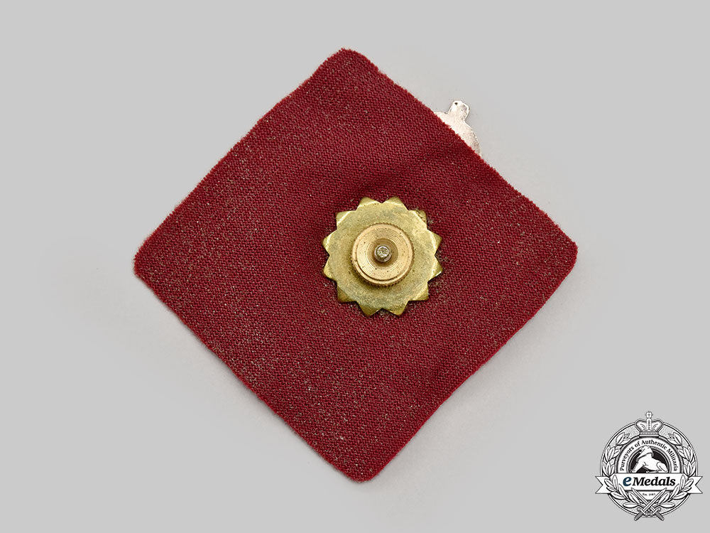 In silvered metal with red, white, blue and yellow enamels, measuring 35 mm (w) x 49 mm (h), brass support plate with grippers, brass screwback, secured in place to a 57 mm (w) x 57 mm (h) maroon wool swatch, intact enamels, extremely fine.