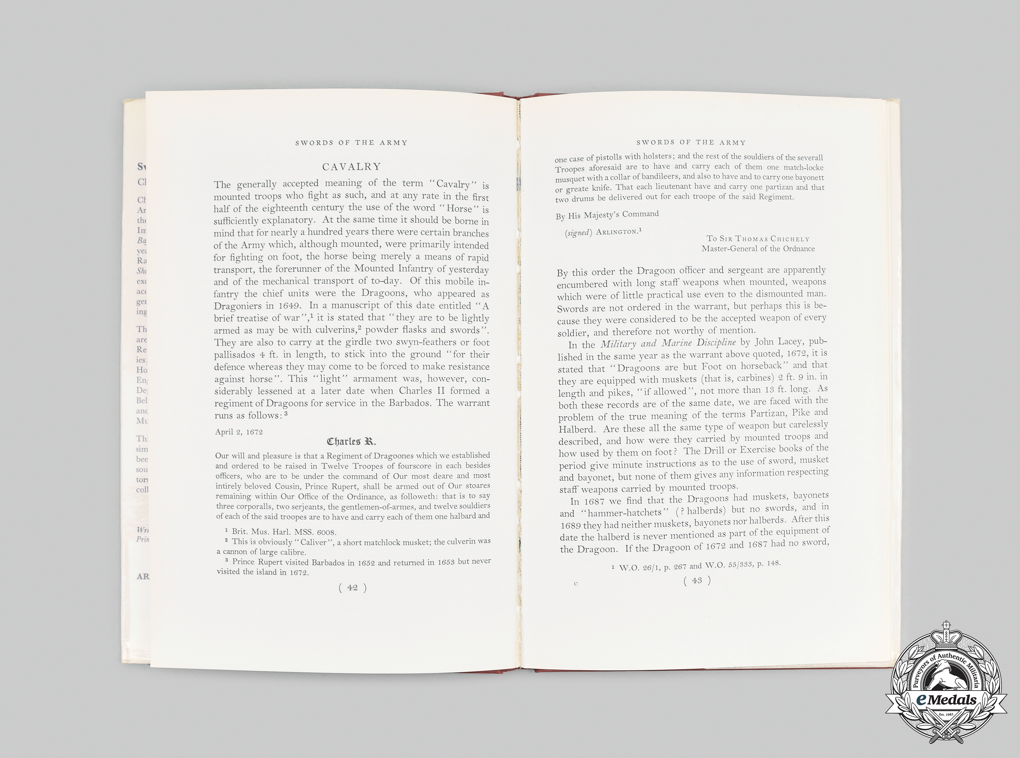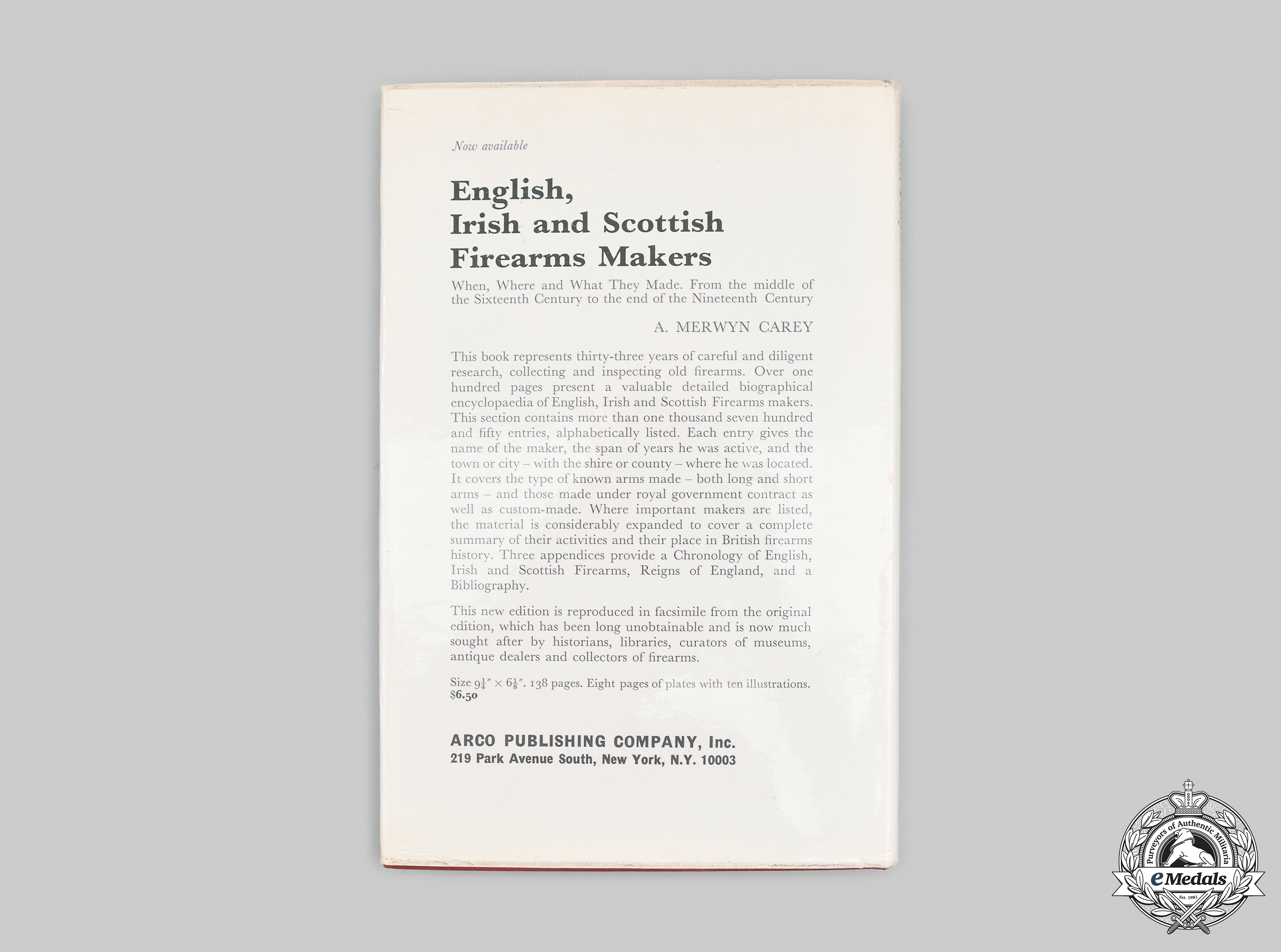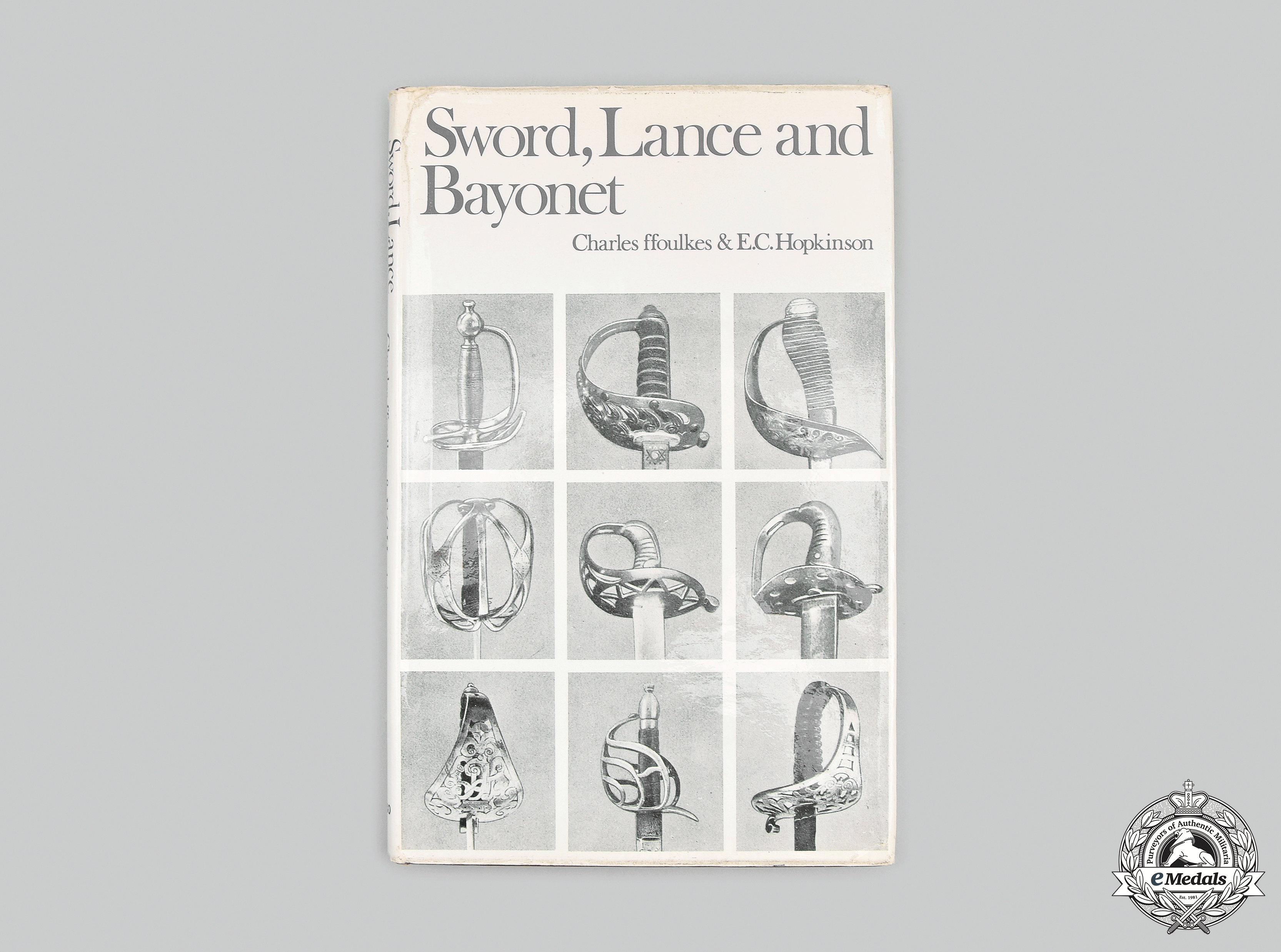 Hardcover, maroon cloth cover, with dust jacket, the text on the spine in gold-coloured ink, entitled "Sword, Lance and Bayonet - A Record of the Arms of the British Army & Navy", by Charles ffoulkes, C.B., O.B.E., Hon.D.Litt., Oxon, F.S.A. and Captain E.C. Hopkinson, M.C., original First Edition published in 1938, this Second Edition published in 1967 by Arco Publishing Company, Inc. of New York, printed in England, Library of Congress Catalog Card Number 67-18415, Arco Catalog Number 1645. Near extremely fine.