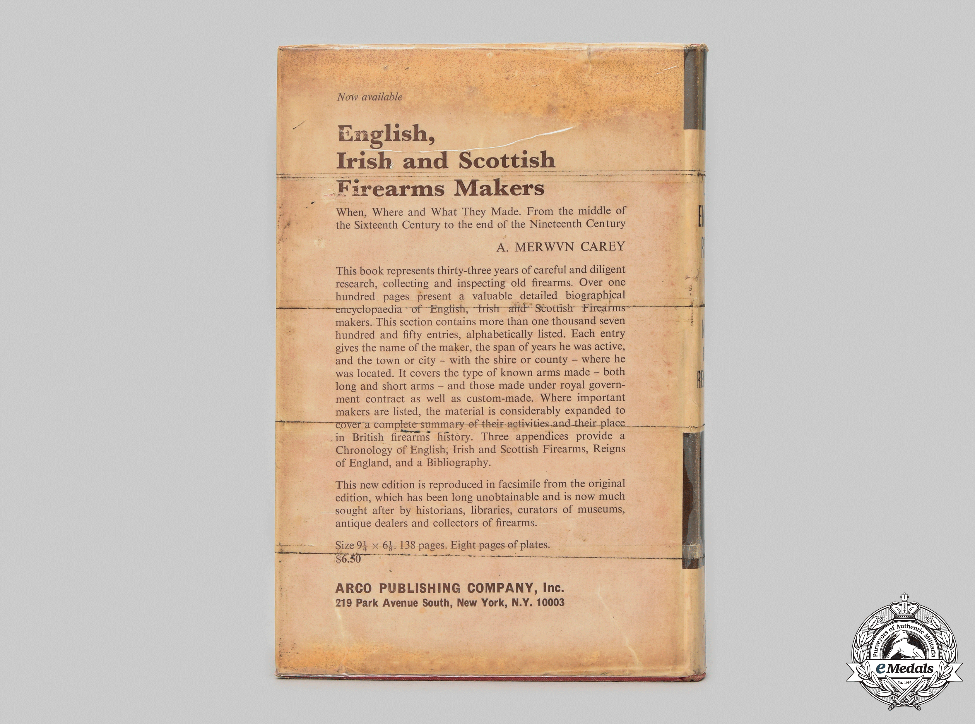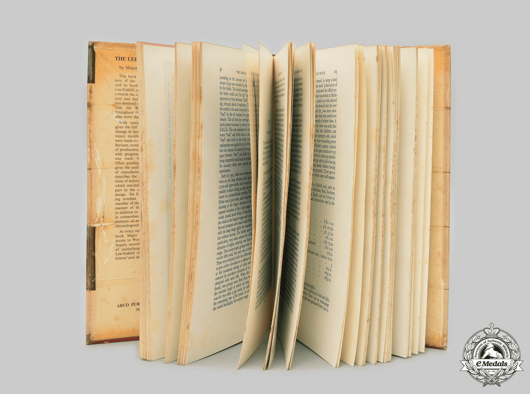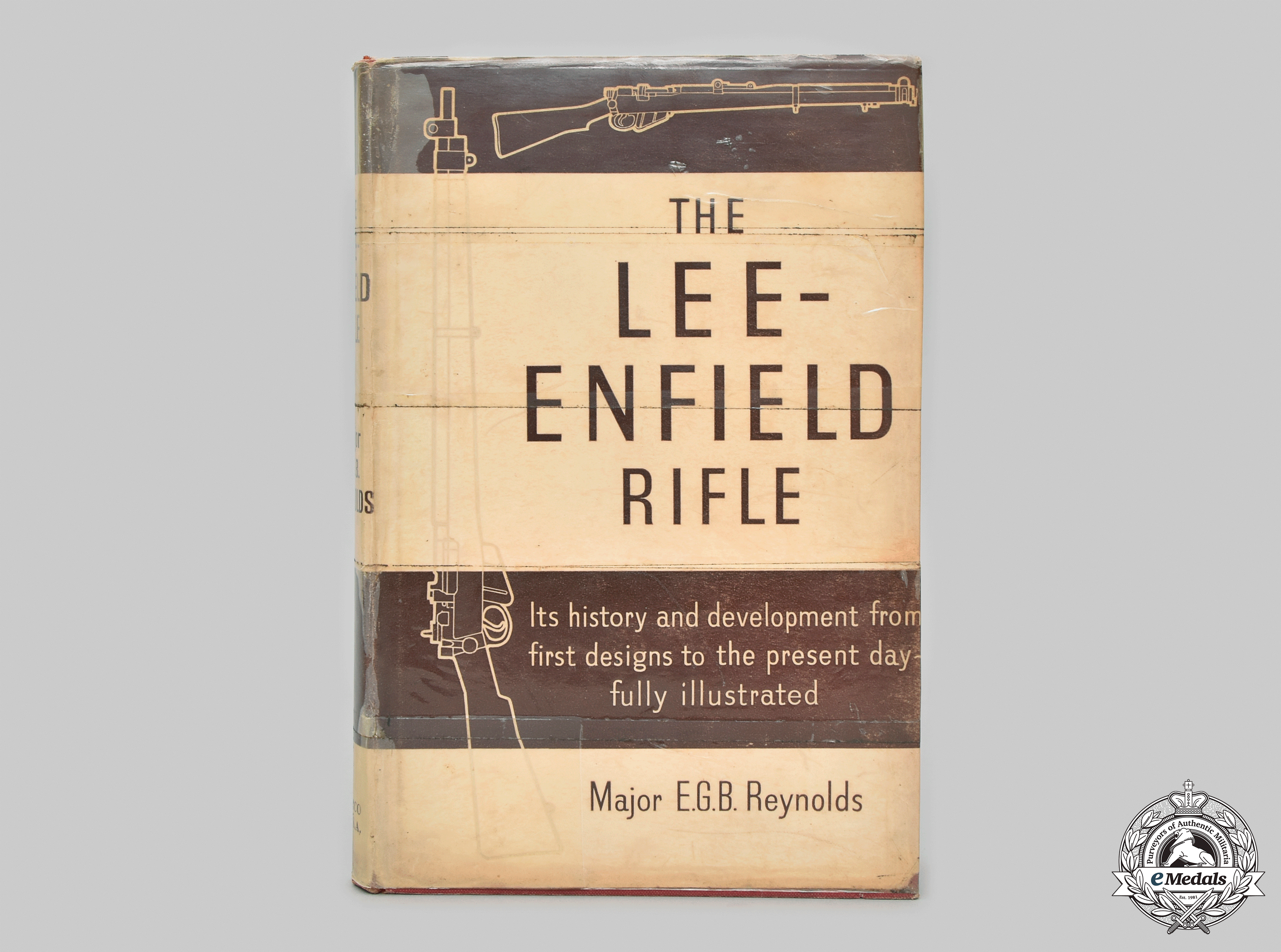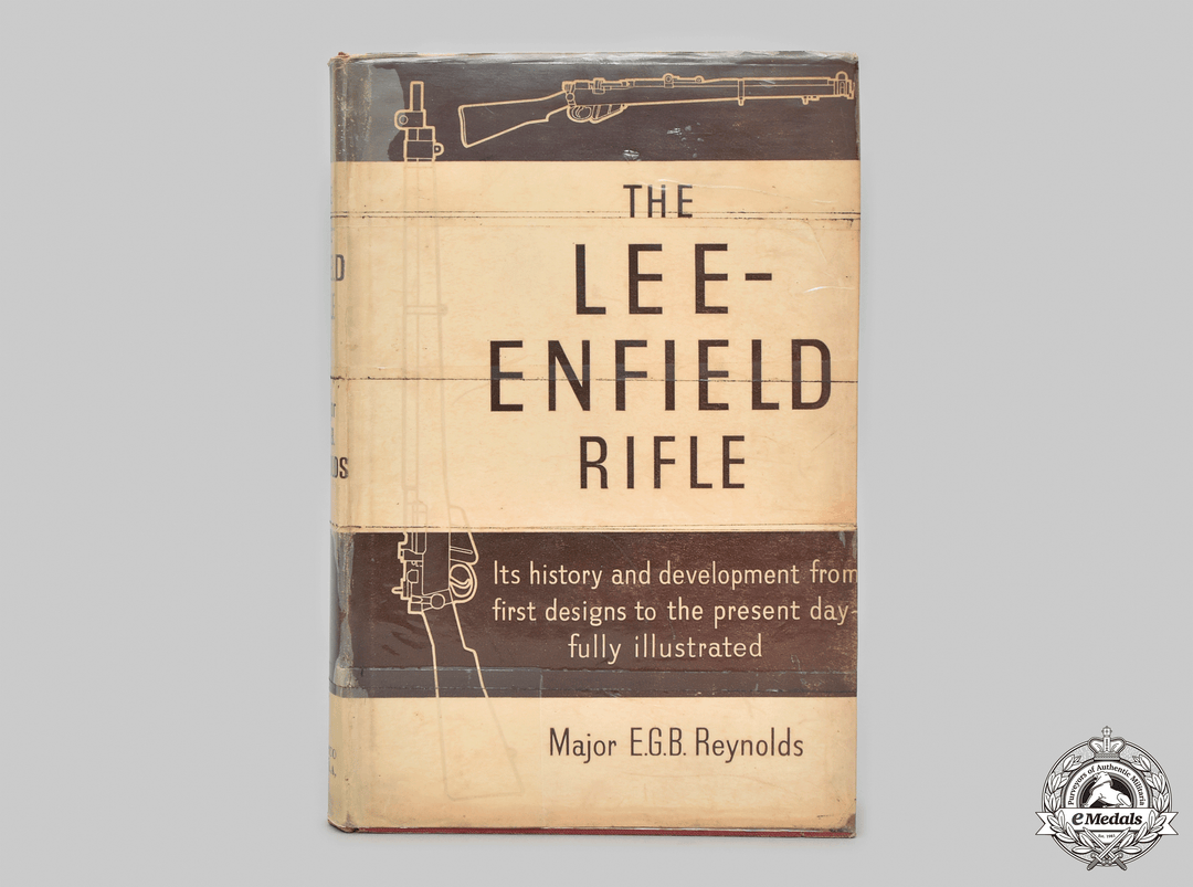 Hardcover, scarlet red cloth cover, with dust jacket, the text on the spine in gold-coloured ink, entitled "The Lee-Enfield Rifle - Its history and development from first designs to the present day", by Major Edmund George Barton Reynolds, originally copyrighted by the author and published in 1960, this Second Edition published in the United States by Arco Publishing Company Inc, of New York in 1968, printed in Great Britain by Lowe & Brydon (Printers) Ltd. of London, Library of Congress Catalog Card Number 62-16462, Arco Catalog Number 966. As stated on the dust jacket: "This book comprises a factual history of the famous Lee-Enfield rifle and its forebears. The family of the Lee-Enfield rifle first came into being towards the end of the nineteenth century and during the next sixty years was destined to fulfil a pre-eminent role with the British fighting Services throughout the world. It is a remarkable story that is unfolded. With meticulous care the author gives the full facts and figures of each change in design and every major and minor modification - some of which were made to meet the exigencies of the Services, some to meet the requirements of production, and some to keep pace with progress and competition - that was made throughout this period. Often quoting from official sources he gives the authentic details of methods of manufacture and inspection, and describes the requirements and conditions of technical trials and troop trials which inevitably played an important part in the conception of each new design. He freely discusses the teething troubles which beset each new member of the family and explains the manner of their correction. Finally, in addition to the rifle itself, he records in comprehensive detail the changing patterns of ammunition and bayonet, chronologically as they occurred. At every stage in the writing of this book Major Reynolds has enjoyed access to War Office and Ministry of Supply records. The result is a work of unchallengeable authority on the Lee-Enfield rifle at every stage of its history and development." It begins with a Foreword by Lieutenant-Colonel Lord Cottesloe, T.S., V.D., followed by an Author's Note, an Acknowledgements, a Table of Contents and a List of Illustrations. The book is divided into nineteen chapters: I - Prelude to the First Lee-Enfield; II - The Parent of the Family: The Lee-Metford; III - The First Lee-Enfield; IV - Mostly Conversions, and troubles in South Africa; V - Accomplishments of new Small Arms Committee; VI - A shortened Rifle for Cavalry and Infantry; VII - The trial of the thousand rifles and adoption of the Short Magazine Lee-Enfield; VIII - Mostly trials and experiments; IX - Lord Kitchener Reports; X - The Mark III S.M.L.E. and Mark VII Cartridge are introduced; and proved in battle; XI - The Pattern 1914 Enfield Rifle; XII - A new Rifle, and a new type of bayonet; XIII - Development and Introduction of the No. 4 Rifle; XIV - The No. 4 Mark Rifle, and Problems of War-time manufacture; XV - Weapons for the Jungle and the Sniper; XVI - Manufacture and Factory History; XVII - Mostle Post-war developments; XVIII - The Australian Story; XIX - The Lee-Enfield in the .22-in. role. It concludes with six Appendices and a six page Index. The book contains 224 pages of text, printed in black ink, on an off-white paper stock, with thirty pages of black and white plates inserted at thirteen random intervals throughout, the plates printed in black ink on a coated white paper stock, the previous owner's name in blue ink on the inside cover endpaper, measuring 155 mm (w) x 240 mm (h) x 22 mm (d). It exhibits extensive foxing on the edges of the pages, with a few of the pages within affected, the dust jacket having been entirely clear-taped over and permanently affixed to the inside covers. Fine.