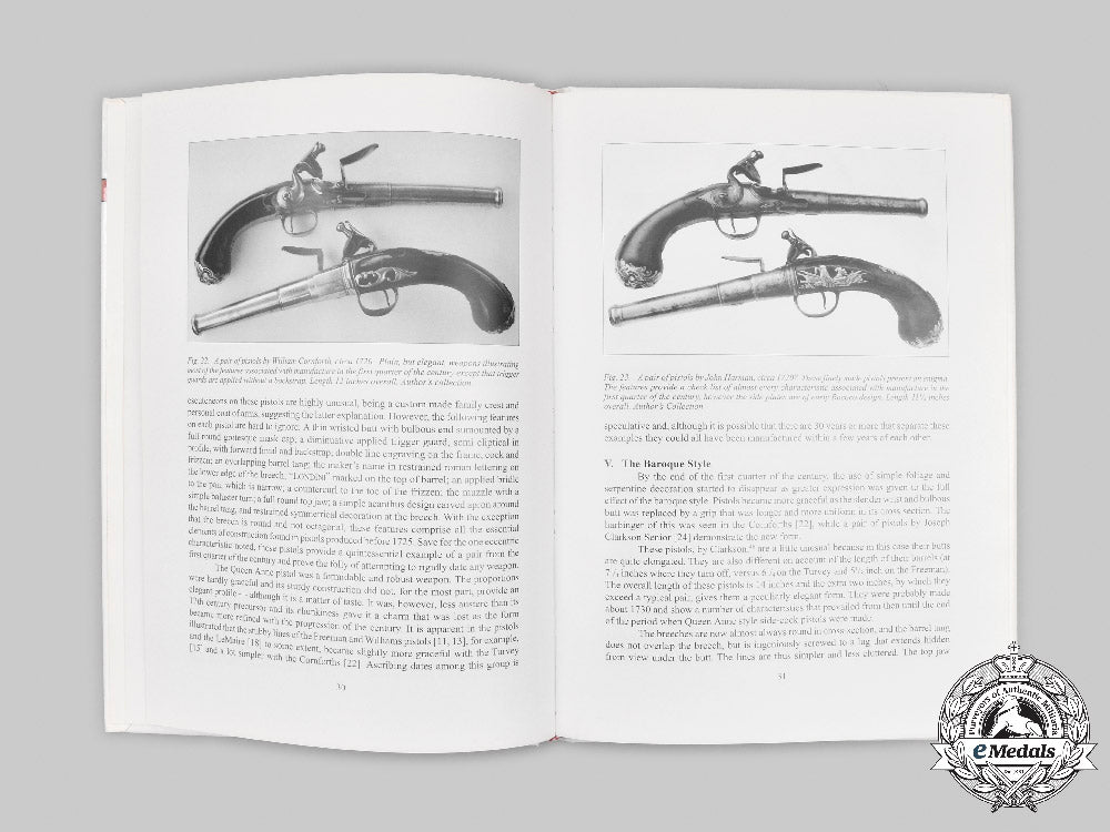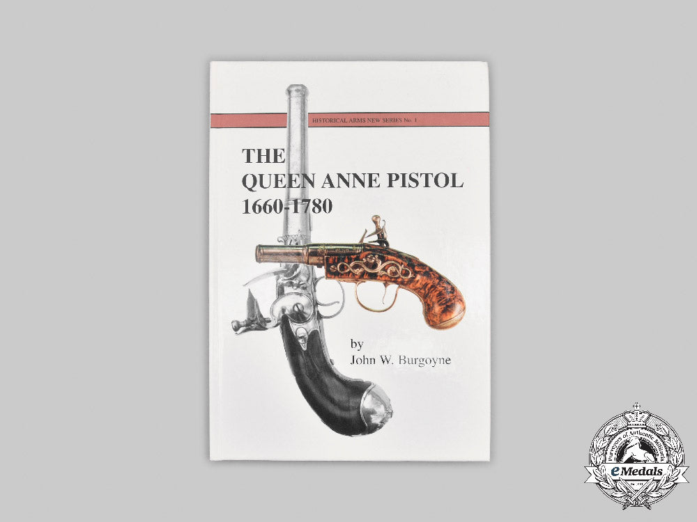 Hardcover, with a laminated paper finish bearing photographs, entitled "The Queen Anne Pistol 1660-1780: A History of the English Turn-off Pistol", by John W. Burgoyne, published and printed in Canada by Museum Restoration Service of Bloomfield, Ontario and Alexandria Bay, New York in 2002, ISBN 0-88855-015-4. The purpose of this book is to fill a gap in the arms literature and to trace the development of the design and decoration of a uniquely English type of pistol known colloquially as the Queen Anne or, more correctly, as the turn-off pistol. This distinctive breech-loading arm was developed in the middle years of the seventeenth century but found popularity during the reign of the monarch (1702-1714) by whose name it is known. It continued to be made until about 1780. With a comprehensive text and almost 200 illustrations, the styles and decoration from the mid-seventeenth century, through the baroque and rococo designs imported from France that were adapted by English gunmakers, came to produce a particularly accurate and distinctive pistol. It begins with a Table of Contents, followed by an author's Foreword. The book is divided into four parts: Part 1: Origins and Design (I - Mechanical Characteristics; II - Continental Influence and the Huguenot Immigation; III - The Seventeenth century turn-off pistol; IV - The Queen Anne Pistol; V - The Baroque Style; VI - The Rococo Style; VII - The Truncated Form; VIII - Fixed Barrels; IX - Pocket Pistols; X - Boxlock Pistols; XI - Superimposed and Multi-shot Pistols); Part 2: Decoration and Silver Mountings (XII - Butt Caps; XIII - Side Plates; XIV - Escutcheons; XV - Wire Inlay; XVI - Carving); Part 3: Safety Features (XVII - Safety Mechanisms); Part 4: A Concluding Observation. It concludes with five Appendices (1 - Queen Anne Powder Testers; 2 - Some Comments on Barrel Wrenches; 3 - A List of Queen Anne Type Gunmakers; 4 - Glossary of Queen Anne Pistol Terms; 5 - Bore and Caliber) and Endnotes. The book contains 114 pages, printed in black ink, on a coated white paper stock, measuring 183 mm (w) x 262 mm (h) x 12 mm (d). Near extremely fine.