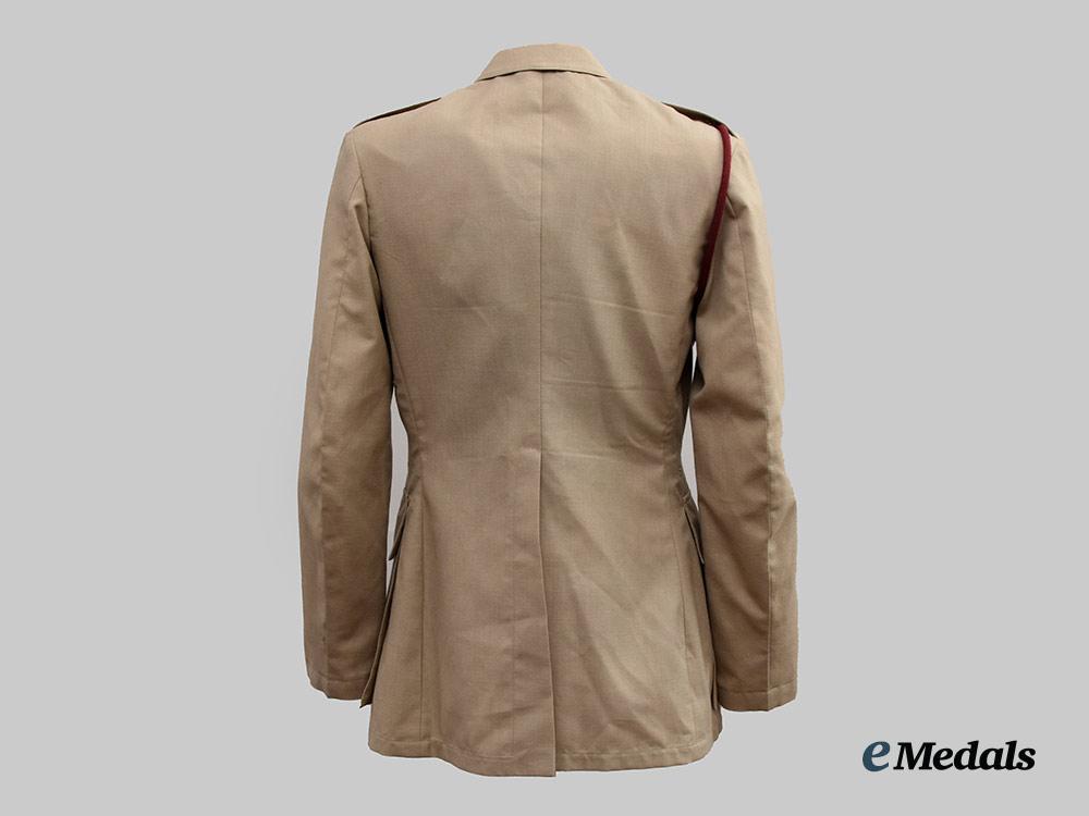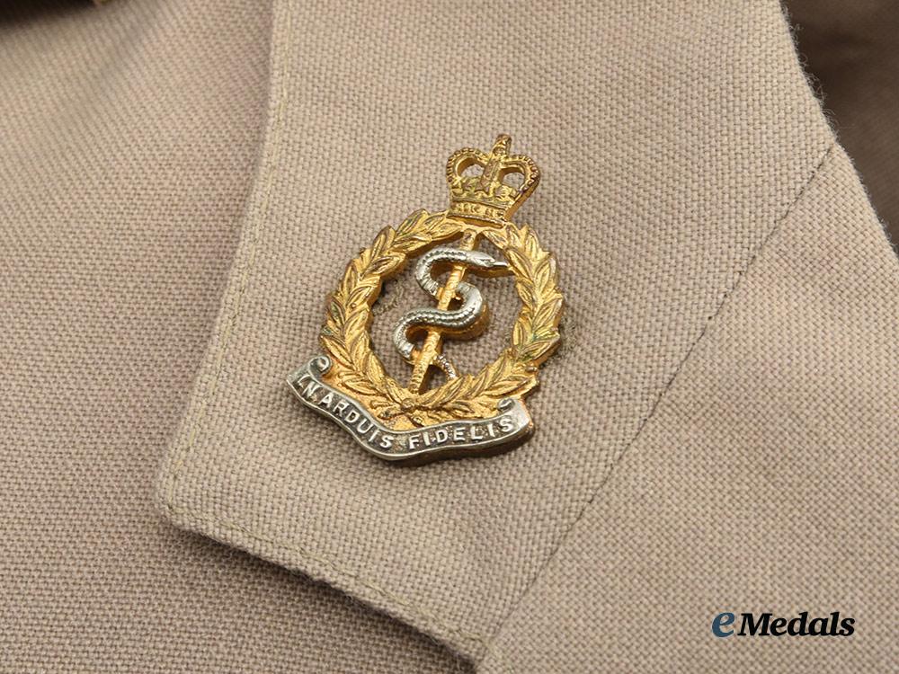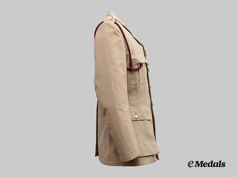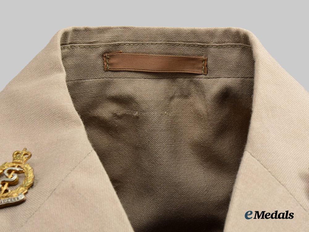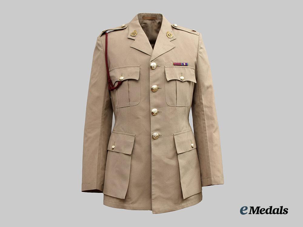 1. Tropical Dress Tunic: exterior in khaki cotton, both shoulders incorporating button down epaulette straps, each of which bears a Queen's crown in silvered metal, both straps secured in place via a silvered button bearing the Royal Army Medical Corps insignia. Fed through the epaulette on the right side is a maroon aiguillette cord and terminates in a knot behind the button on the right breast pocket. Both collars bear Royal Army Medical Corps small silvered and gilt collar badges that bear the Queen's crown, each of which is secured in place by a pin fed through two lugs on the underside. The front has four pockets, smaller ones on each breast which have decorative straps giving them a pleated-look, along with fold-over flaps secured in place by large silvered Royal Army Medical Corps buttons. Above the left breast pocket is a ribbon bar sewn in place representing the George Medal and the General Service Medal 1962-2007 with rosette. There are two larger and deeper pockets at the waist, with fold-over flaps secured in place by small silvered Royal Army Medical Corps buttons. The front has a vertical row of four large silvered Royal Army Medical Corps buttons on the right side, facing an equal number of reinforced button holes on the left side. Inside, there are two straps placed just below the armpits, each with two reinforced holes. The lining on the left side has a label sewn in place inscribed "UNIFORM MAN'S / No. 4 Dress Army Officers / CP 8405-99-130-7269 / SIZE 176/100/84 / COOP & COMPANY / BL638/2571", along with a strap in the collar that is designed to hang the blouse from a hook. The jacket measures 450 mm across the shoulders and 850 mm in length overall, is free of flaws and is very clean. As worn.