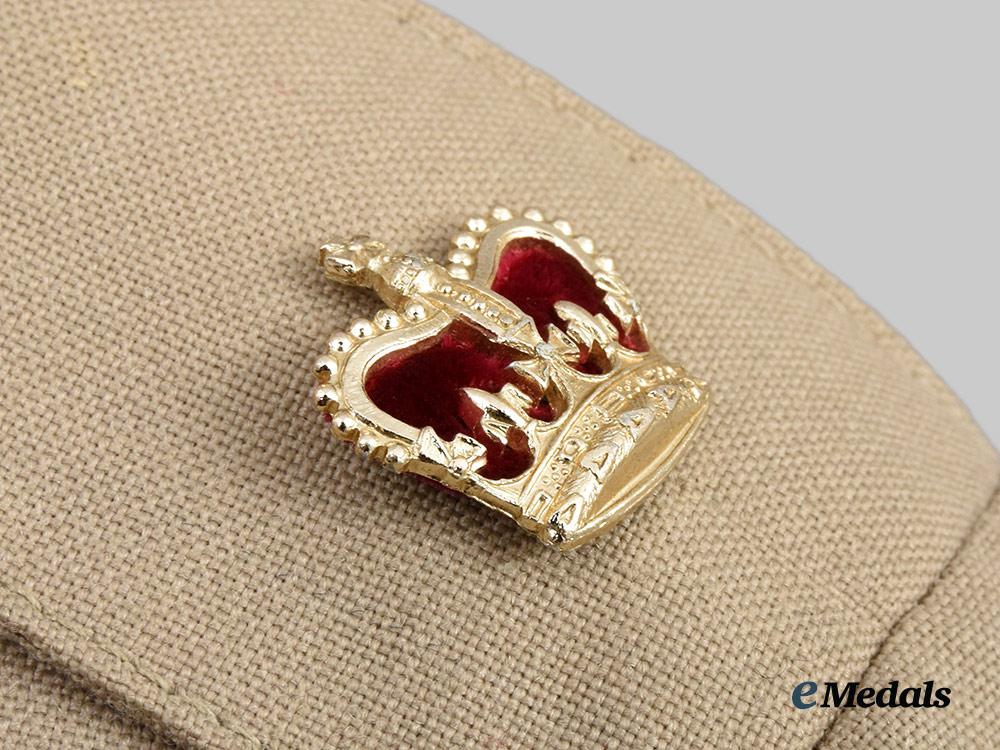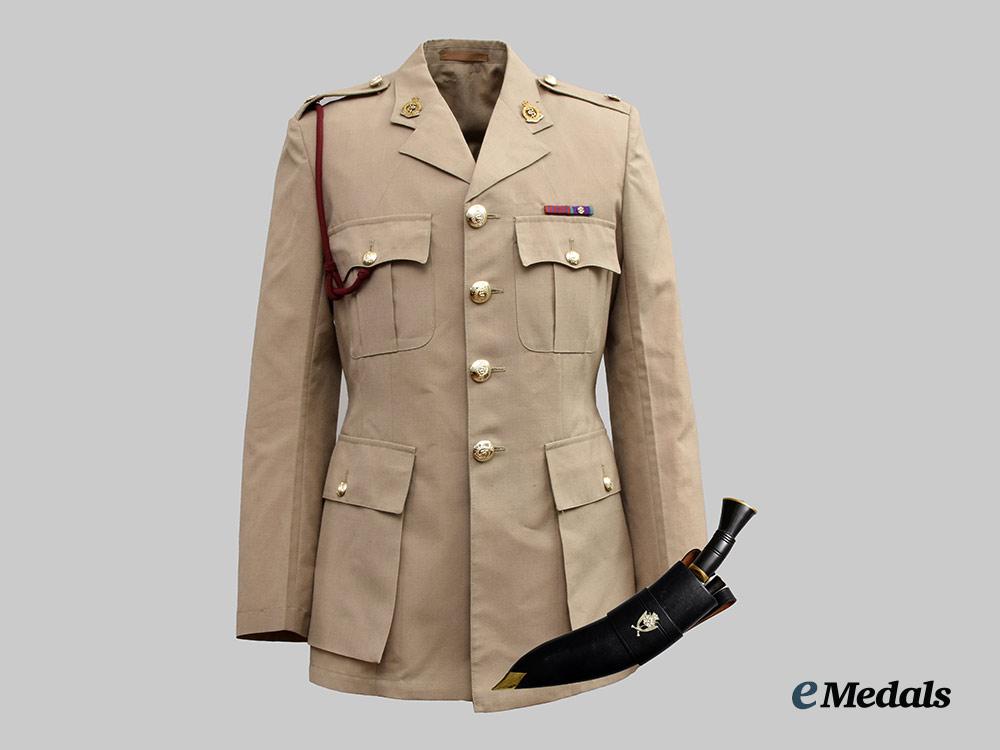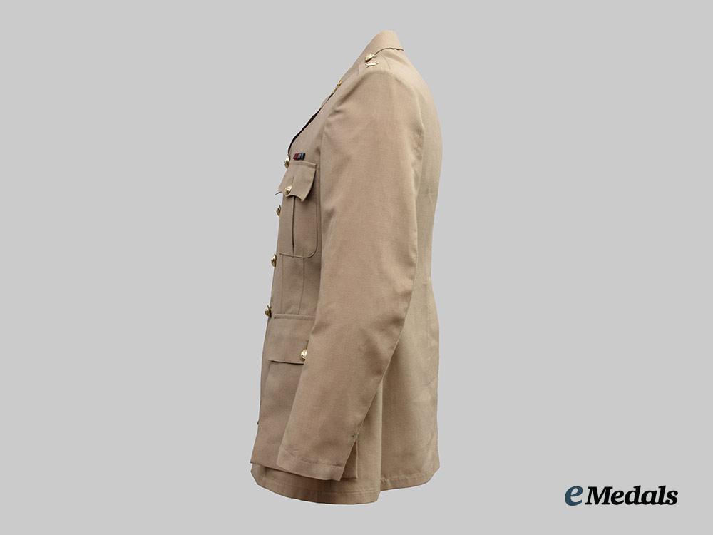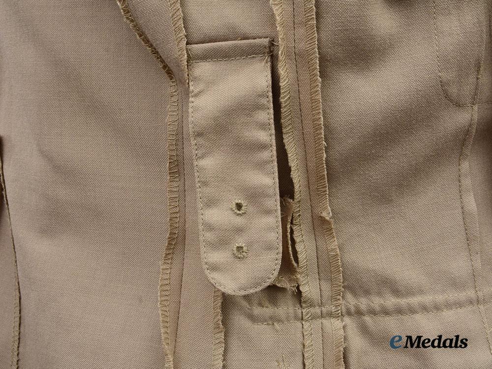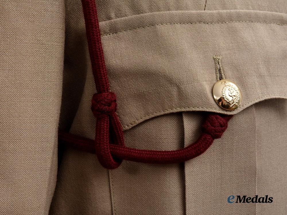 1. Tropical Dress Tunic: exterior in khaki cotton, both shoulders incorporating button down epaulette straps, each of which bears a Queen's crown in silvered metal, both straps secured in place via a silvered button bearing the Royal Army Medical Corps insignia. Fed through the epaulette on the right side is a maroon aiguillette cord and terminates in a knot behind the button on the right breast pocket. Both collars bear Royal Army Medical Corps small silvered and gilt collar badges that bear the Queen's crown, each of which is secured in place by a pin fed through two lugs on the underside. The front has four pockets, smaller ones on each breast which have decorative straps giving them a pleated-look, along with fold-over flaps secured in place by large silvered Royal Army Medical Corps buttons. Above the left breast pocket is a ribbon bar sewn in place representing the George Medal and the General Service Medal 1962-2007 with rosette. There are two larger and deeper pockets at the waist, with fold-over flaps secured in place by small silvered Royal Army Medical Corps buttons. The front has a vertical row of four large silvered Royal Army Medical Corps buttons on the right side, facing an equal number of reinforced button holes on the left side. Inside, there are two straps placed just below the armpits, each with two reinforced holes. The lining on the left side has a label sewn in place inscribed "UNIFORM MAN'S / No. 4 Dress Army Officers / CP 8405-99-130-7269 / SIZE 176/100/84 / COOP & COMPANY / BL638/2571", along with a strap in the collar that is designed to hang the blouse from a hook. The jacket measures 450 mm across the shoulders and 850 mm in length overall, is free of flaws and is very clean. As worn.