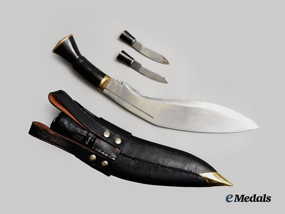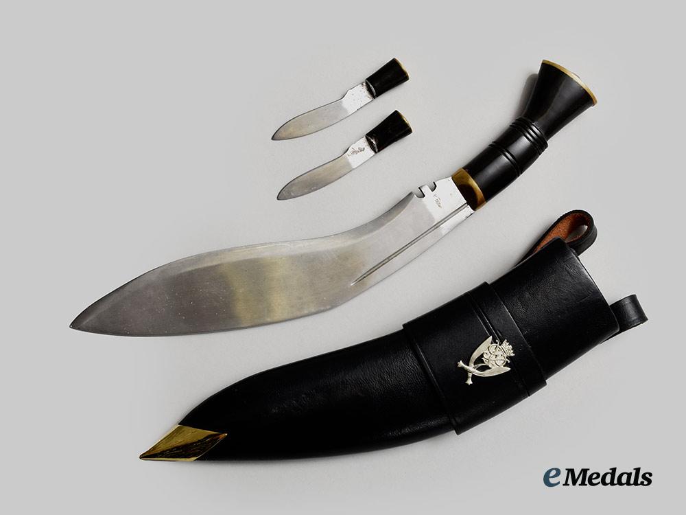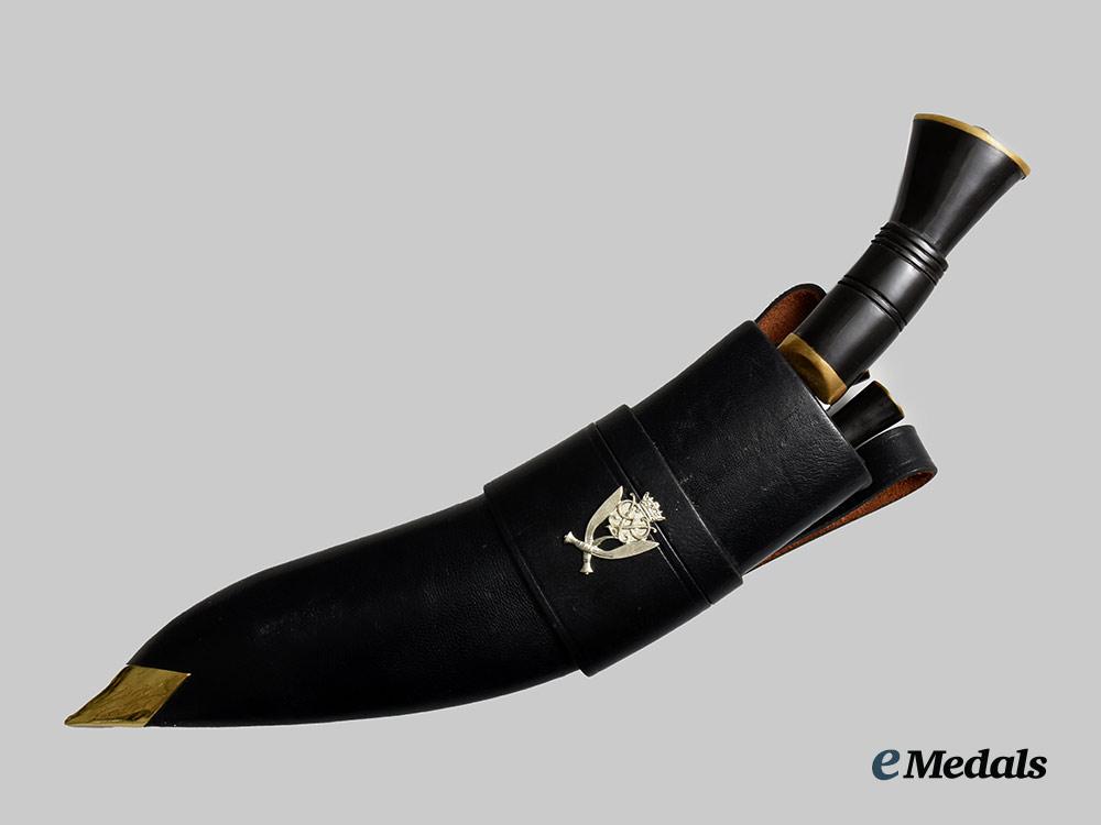 3. Gurkha Kukri: magnetic steel blade, with a very sharp edge (dhaar) and a very sharp tip (tuppa), designed with a bevelled edge (patti) that runs from the tip to the notch (kaudi) and incorporates a wide spine (bitheu/beet). The blade is designed with a flat chest (ang) and without fullers (chairra), with (chirra), with a single groove (khol) running from the peak (juro) through the belly (ghanti) to the bolster (kanzo), the ricasso (ghari) unmarked on both sides, the blade embedded into a blackened wooden handle that embodies two pairs of rings (dora), along with a raised ridge (harhari), is designed without rivets (khil) and is finished with a flare (chata), the butt with a brass and metal cap, the kukri measuring approximately 350 in length. The accompanying scabbard has a black-finished nicely-textured leather wrap around a wooden core, with two large pieces forming the holster to hold the kukri, along with two tube-like pieces housing two smaller knives in a separate compartment, both of which have magnetic steel blades and synthetic handles with black-finished wooden handles and their butts finished with a brass and metal cap, the knives designed to appear as miniature kukris. The exterior is covered in a black-finished, nicely-textured leather, the obverse bearing the 7th Gurkha Rifles insignia in silvered metal, the reverse exhibiting a heavy-stitched seam, the reverse with two large straps for belt attachment, the tip of the scabbard incorporating a brass point, the scabbard measuring approximately 290 mm in length.