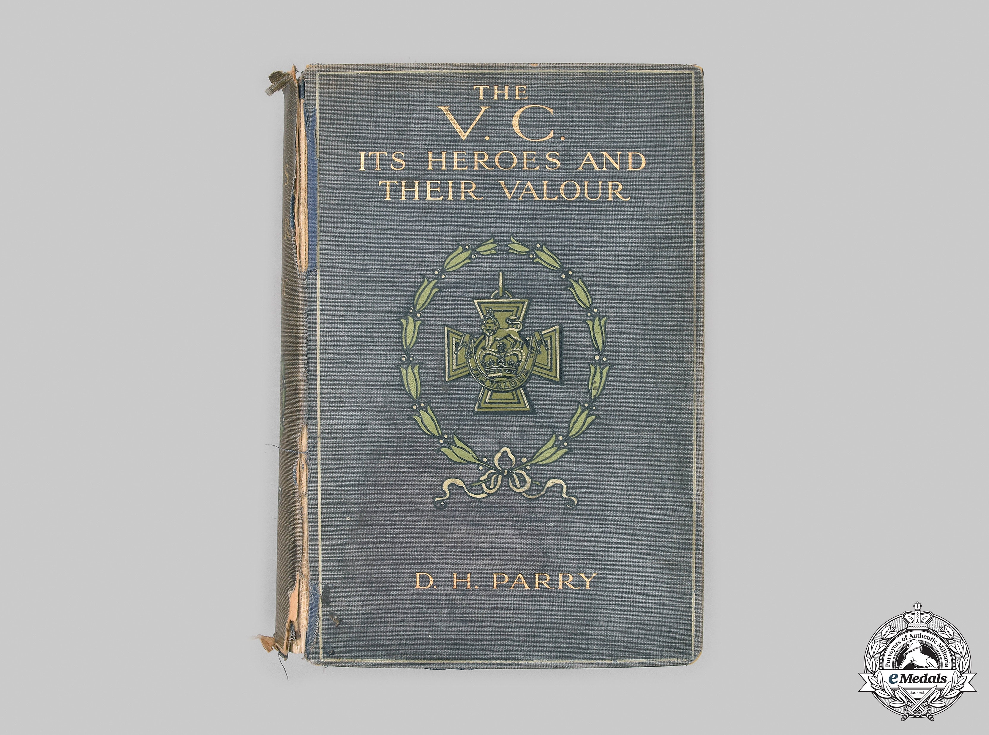 Hardcover, black cloth cover, entitled "The V.C. - Its Heroes and Their Valour - From Personal Accounts, Official Records and Regimental Tradition" by D.H. Parry, author of "The Death of Glory Boys - The Story of 17th Lancers, etc.", with eight illustrations by Stanley L.Wood, new and enlarged edition, published by Cassell and Company, Ltd. of London, New York, Toronto and Melbourne in 1913, with the notation "This work was first published in 1895 under the title of "Britain's Roll of Glory" ". The inside front cover has a Bracebridge Free Library label and two stamps in blue ink. It begins with a Preface, followed by a List of Contents, a List of Illustrations, a List of Victoria Cross Campaigns and Actions, an Introduction and is divided into forty-two chapters: I - The Crimean War; II - The Alma Crosses of the Welsh Regiments; III - The V.C. Heroes of the Balaclava Charges, 25th October, 1854; IV - The Gallant Guardsmen in the Crimea; V - Our Bold Bluejackets and Royal Marines; VI - In the Dead of Night!; VII - The Silent Heroes - The Royal Engineers; VIII - The Gallant Gunners in the Crimea; IX - The Tale of the Trenches; X - The First Presentation of the Cross to the Crimean Heroes by Her Majesty the Queen, Friday, June 26th, 1857; XI - On to the Bayonets! - Our Little Persian War; XII - The Indian Mutiny; XIII - How they Blew Up the Delhi Magazine; XIV - Our Gallant Gunners in India; XV - Kolapore Kerr - An Exciting Incident; XVI - A Charmed Life; XVII - The Cashmere Gate, and What they Did There; XVIII - The Lucknow Crosses of the Ross-shire Buffs, and the Heroes of "Shoolie Square!"; XIX - Lucknow Kavanagh; XX - Peel's Bluejackets, and the 93rd Highlanders; XXI - A Lancer's Story; XXII - Some Cavalry Crosses Won in the Mutiny, and the Story of the 7th Hussars; XXIII - Pluck!; XXIV - A Short Outline of the War in New Zealand, and the Story of some Crosses Won there in the Bush and the Pahs; XXV - A Chapter of Incidents, in Action and Out; XXVI - Some V.C. Men of the Afghan War; XXVII - The War in Zululand and the V.C. - The Dash with the Colour; XXVIII - How they Won their Crosses at Rorke's Drift, Ulundi, etc.; XXIX - Majuba Hill; XXX - In the Desert Sand; XXXI - Surgeon Crimmin's Cross - and the Hero of Manipur; XXXII - The V.C. Hero of Chitral; XXXIII - Valour on the Veldt; XXXIV - Well Won! - North-West Frontier of India; XXXV - Dargai Heights and Mamund Valley; XXXVI - With Kitchener to Khartum; XXXVII - The Boer War, 1899-1902 - The Guns at Colenso and Sanna's Post; XXXVIII - The Boer War - "Horse, Foot, Dragoons"; XXXIX - The Boer War and its Colonial Crosses; XL - Ashanti and the Relief of the Cinese Legations, 1910; XLI - In the Land of the Mad Mullah, 1902-3; XLII - Nigeria and Thibet, 1903. It concludes with Royal Warrants, an Alphabetical List of all the Recipients of the V.C., their Ranks and Regiments, and the Particular Act of Bravery by which it was Won, and a List of Victoria Cross Regiments and Corps. The book contains 536 pages of text, printed in black ink on an off-white paper stock, with seven black and white plates on a semi-coated paper stock inserted, gold leaf on the top edges of the pages, measuring 135 mm (w) x 205 mm (h) x 58 mm (d). It exhibits wear on the cover, with separation on both sides of the spine exposing the underlying mesh support, soiling on the edges of the pages and on some the pages within, however, the text of the book itself remains legible throughout. Fair.
