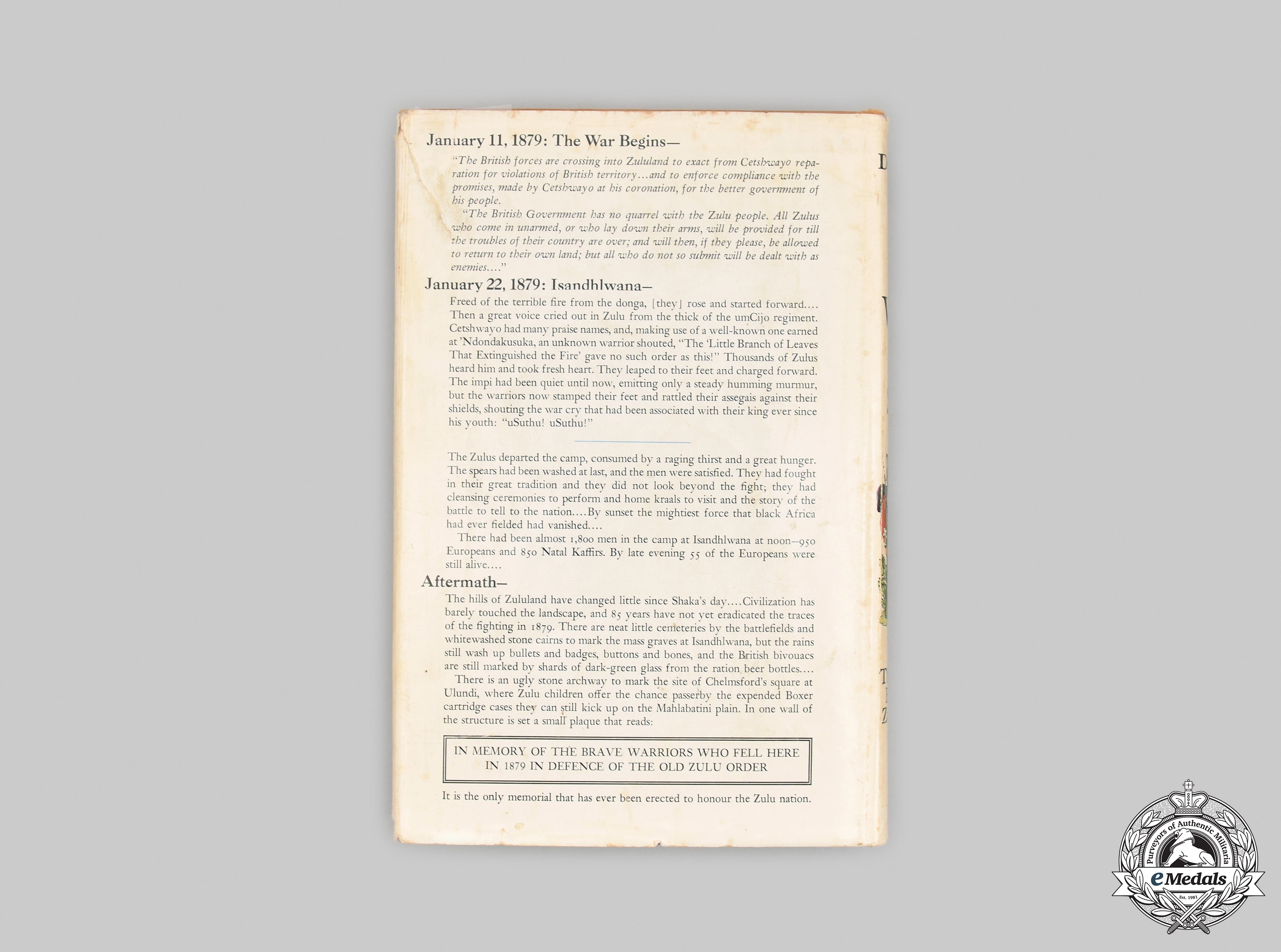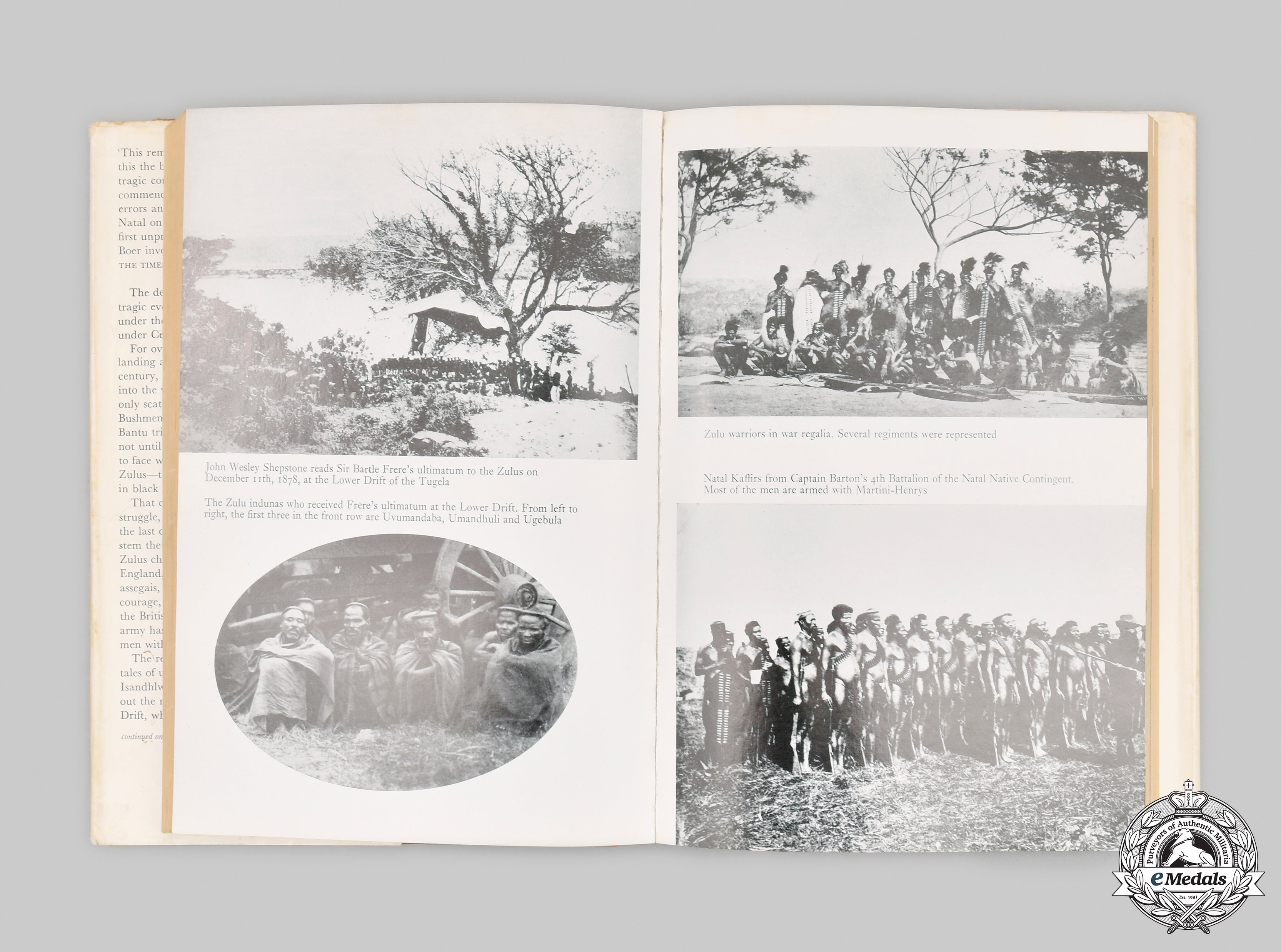 Hardcover, yam orange cloth cover, the text on the spine in gold-coloured ink, entitled "The Washing of the Spears - The Rise and Fall of the Zulu Nation", by Donald R. Morris, copyrighted by the author in 1965, this edition published by Book Club Associates of London in 1972 by arrangement with Jonathan Cape Limited, printed in Great Britain by Lowe and Brydone (Printers) Limited of London. As stated on the dust jacket: "The definitive account of a bloody and tragic event: the rise of the Zulu nation under the great ruler Shaka, and its fall under Cetshwayo in the Zulu War of 1879. For over a century after the European landing at Cape Town in the seventeenth century, the Boers advanced unopposed into the vast interior of Africa, encountering only scattered bands of Hottentots and Bushmen. They met, fought and defeated Bantu tribes in the Kaffir Wars, but it was not until 1824 that European came face to face with the expanding power of the Zulus - then the most formidable nation in black Africa. That confrontation ignited a prolonged struggle, which culminated in a bitter war, the last despairing effort of African to stem the tide of white civilization. The Zulus challenged the might of Victorian England, and armed only with their assegais, their rawhide shields and their courage, they began inflicting upon the British the worst defeat a modern army has ever suffered at the hands of men without guns. The record of their war is studded with tals of unparalleled drama: the Battle of Isandhlwana, where the Zulu impis wiped out the major British Column; Rorke's Drift, where a handful of British troops beat out thousands of attacking Zulu warriors (and won eleven Victoria Crosses); the death of the Prince Imperial of France, the son of Napoleon III. "The Washing of the Spears" is much more than the story of the Zulu War. The author traces the careers of Bantu, Boer and Briton; of the great Zulu kings who founded and ruled the nation; of the Boer leaders who led their people into the wilderness in the Great Trek; of such Englishmen as Sit Theophilus Shepstone, who went into Zululand to crown Cetshwayo; of Bishop John William Colenso, excommunicated for heresy, who waged a lone battle to save the Zulu nation he had befriended; of John Dunn, who remembered 49 Zulu wives and 117 children in his will, and who ruled over a Zulu kingdom in the name of Queen Victoria." It begins with a Table of Contents, followed by a Foreword by the author (dated July 20, 1964 at Forest Home, North Carolina) and a Preface. The book is divided into two parts: Part One with five chapters: Prologue, The Bantu, The Rise of the Zulu Nation, Dingane, Mpande; and Part Two with fourteen chapters: Confederation, The Coming of the War, Preparations, Invasion, Isandhlwana, The Defense of Rorke's Drift, The Flanking Columns, Aftermath, The Left Flank Column, The Second Invasion, The Prince Imperial, Ulundi, The Captain and the Kings Depart, Epilogue. It concludes with Notes on Zulu Orthography, a List of Sources, an eight page Bibliography and a fifteen page Index. The book contains 658 pages of text, printed in black ink in a thick newsprint stock, with 32 pages of black and white photographs, 16 inserted between pages 320 and 321 and 16 inserted between pages 416 and 417, on a coated white paper stock, with maps of South Africa and Zululand on the inside front and back covers respectively, measuring 153 mm (w) x 235 mm (h) x 40 mm (d). It has experienced scuffing and denting on the cover, along with foxing and nips along the edges of the pages, some inner pages exhibiting soiling, the dust jacket with edge wear and minor tears that have been repaired. Fine.
